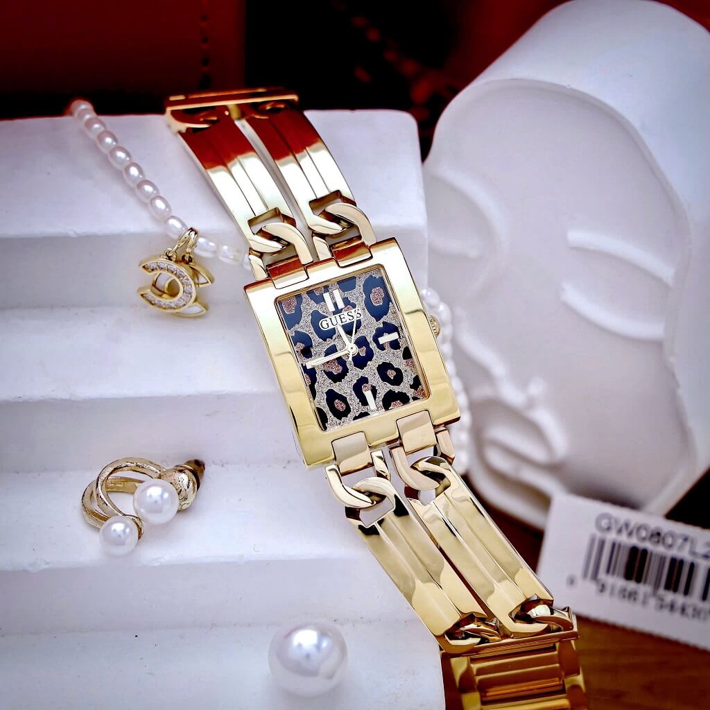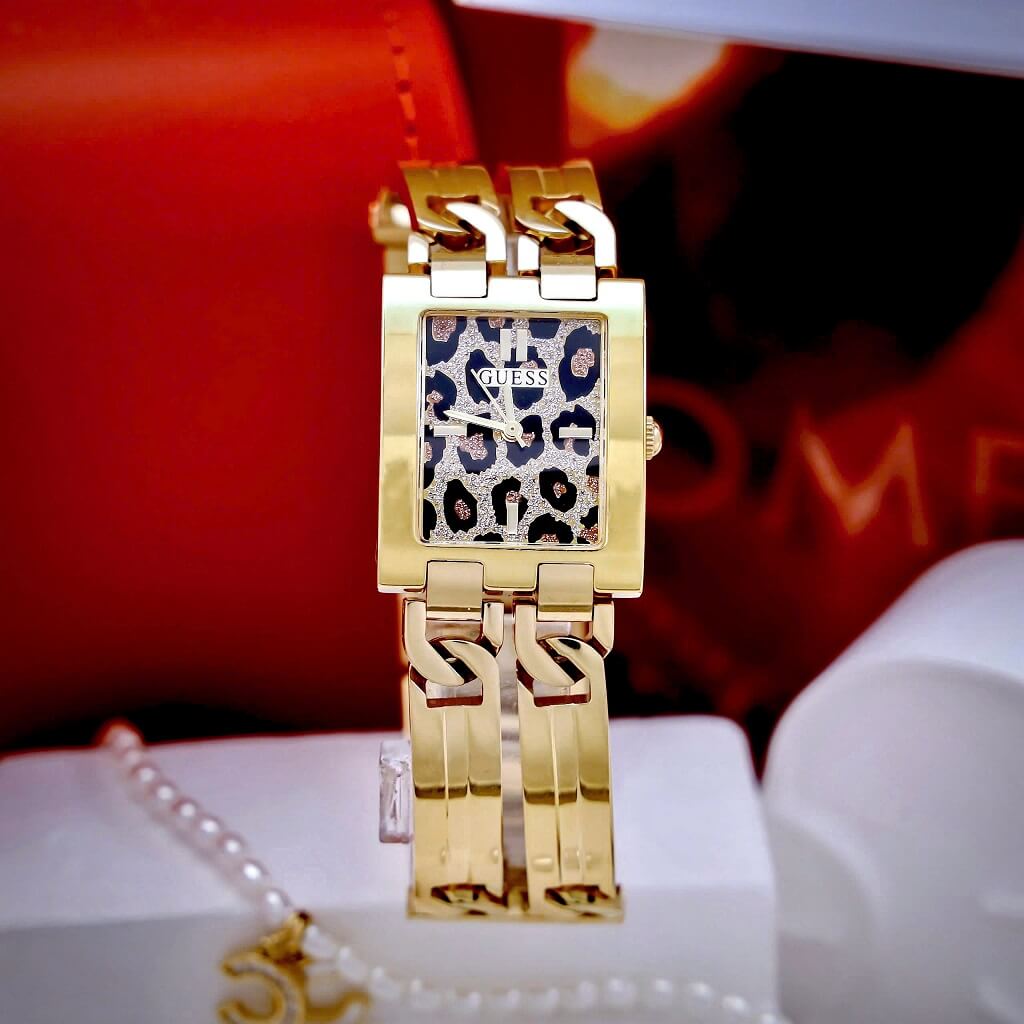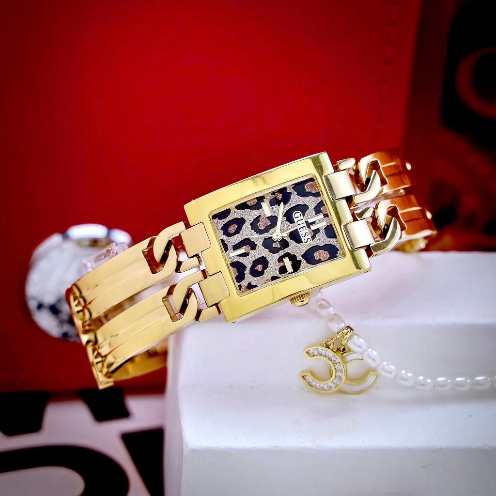 - Đồng hồ Guess dáng lắc tay dây xích inox bóng loáng, kiểu mặt hình chữ nhật mặt da báo đặc trưng của guess