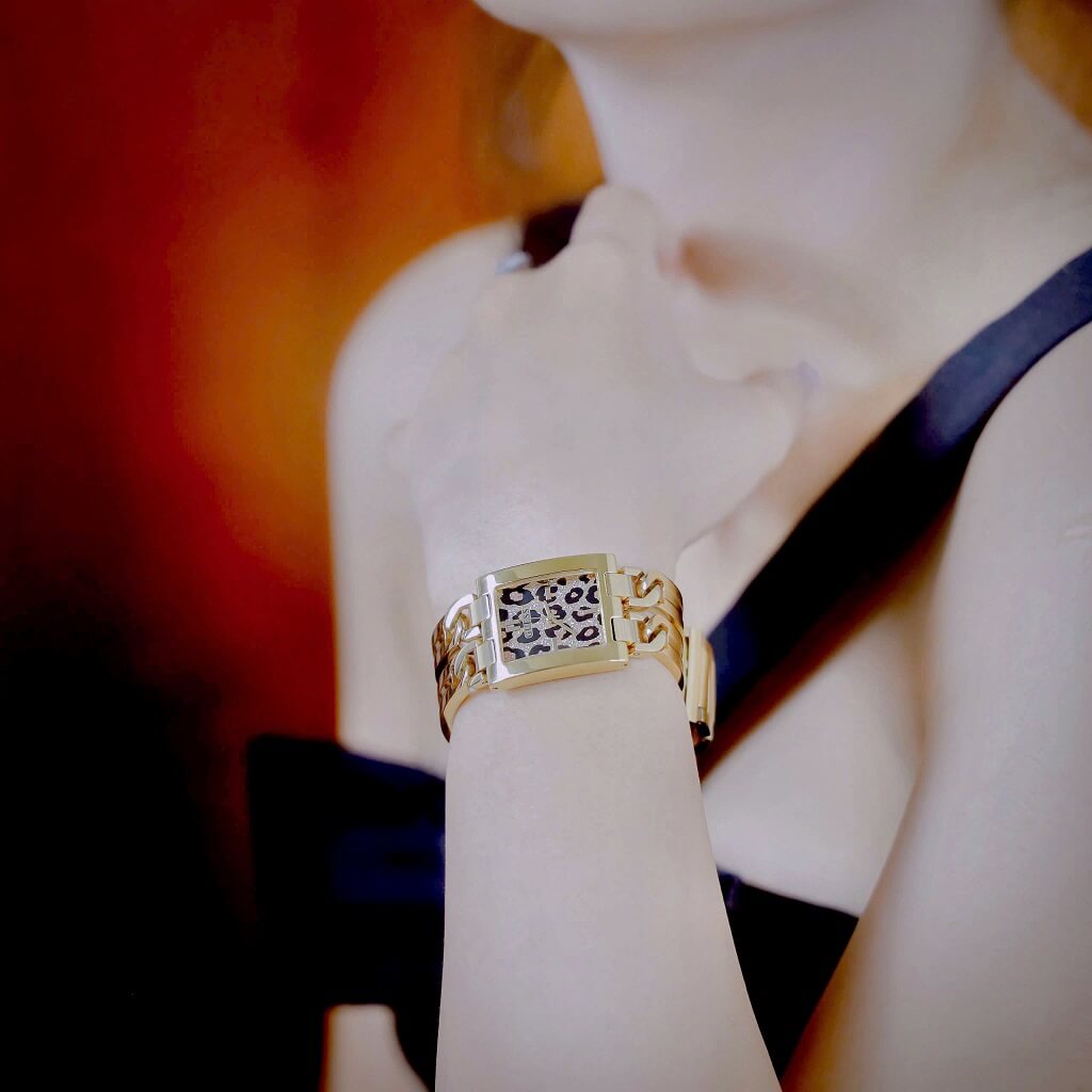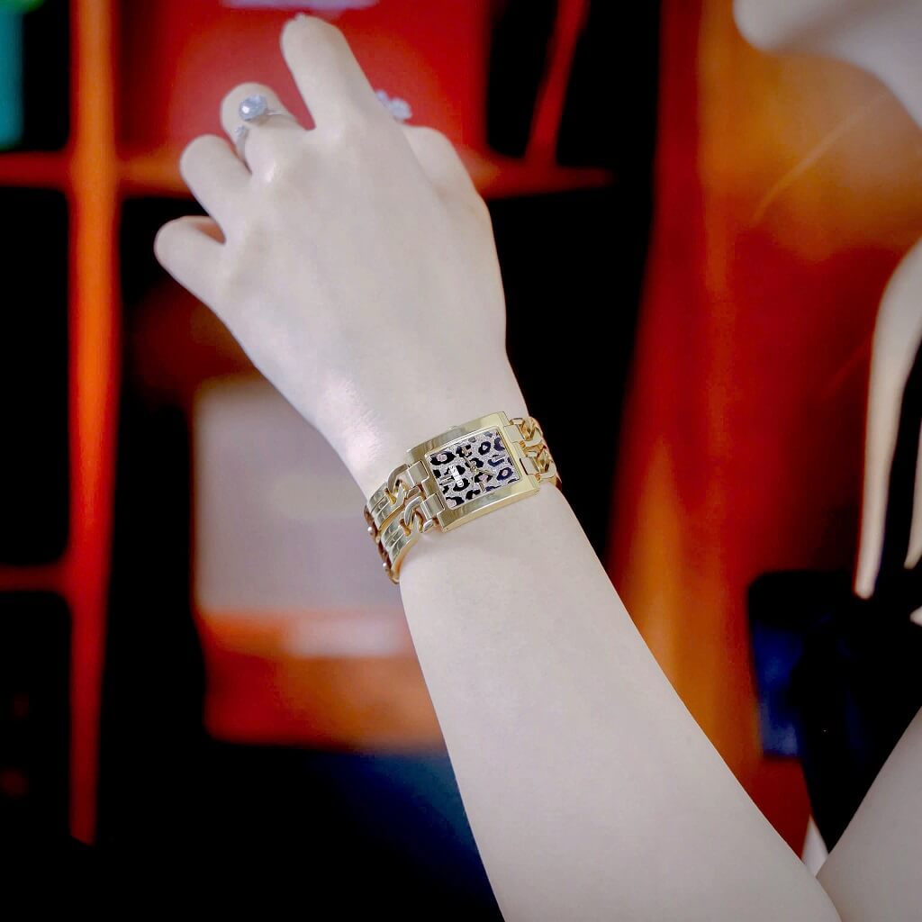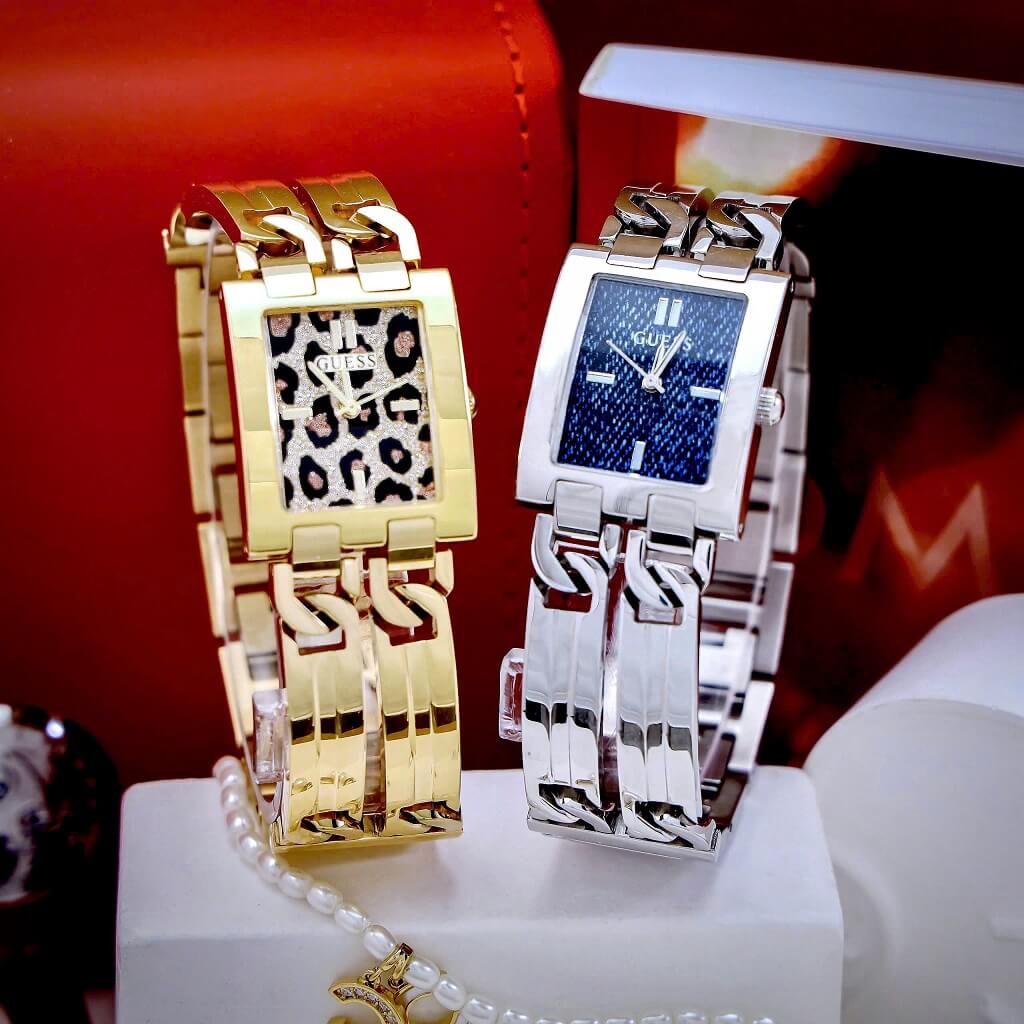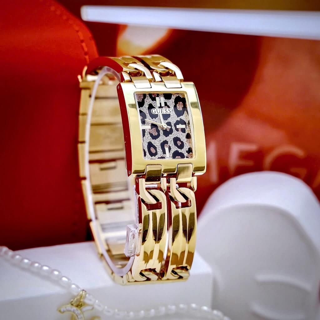 - Đồng hồ Guess dáng lắc tay dây xích inox bóng loáng, kiểu mặt hình chữ nhật mặt da báo đặc trưng của guess