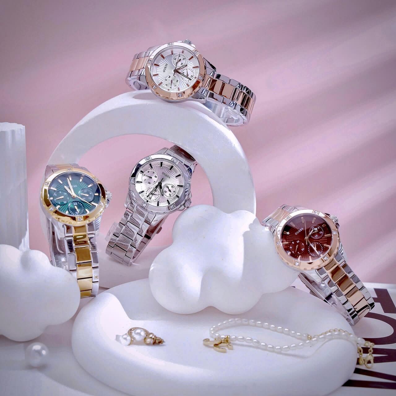 - Mặt dial trắng ngọc quá đẹp với viền benzel mạ vàng hồng đính 6 viên pha lê rực sáng
