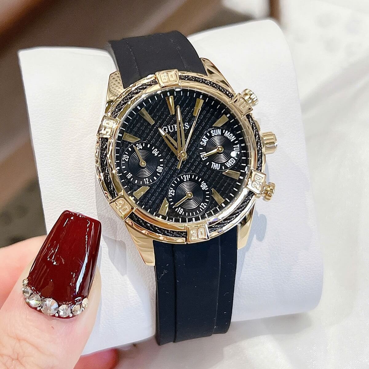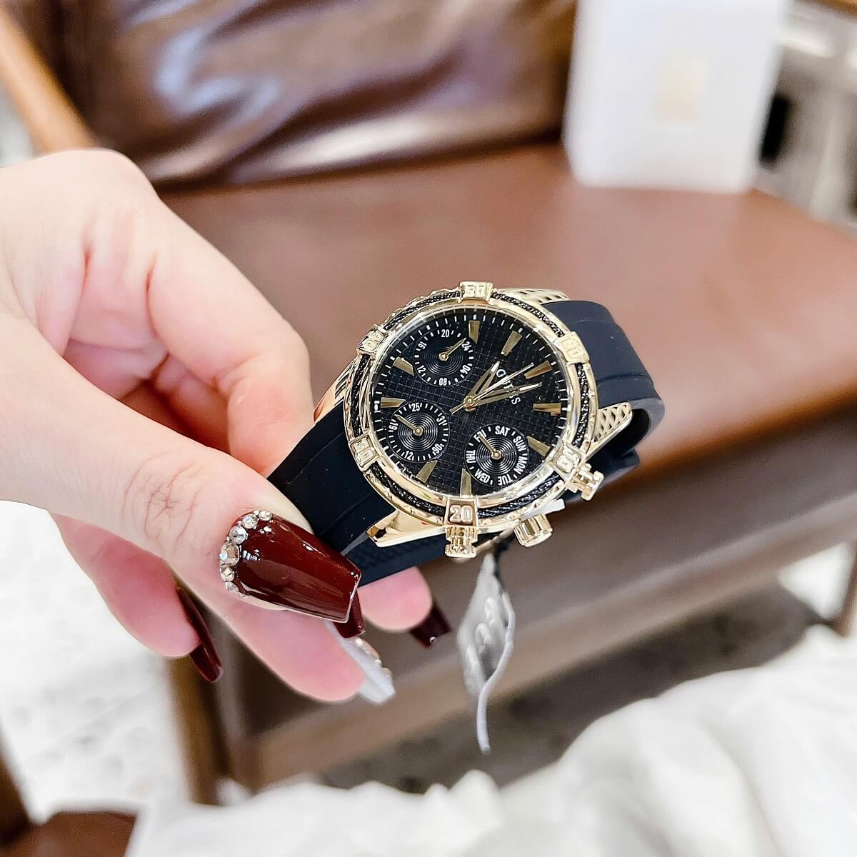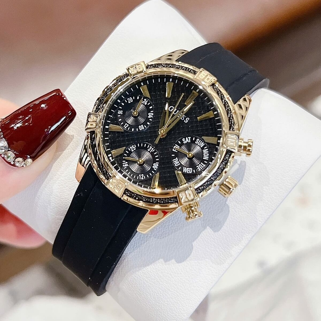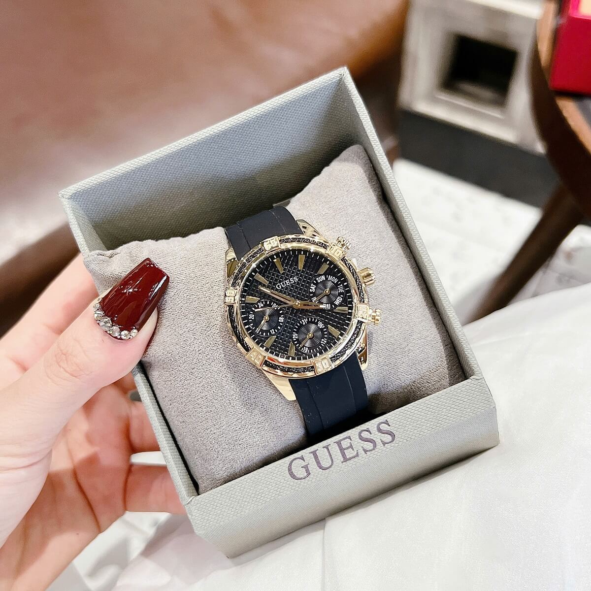 THÔNG TIN SẢN PHẨM: Đồng Hồ Nữ Guess W0562L4 Mặt Đen 6 Kim Dây Cao Su Đen Vỏ Kim Loại Mạ Vàng Size 34mm