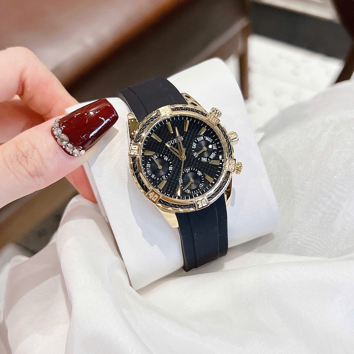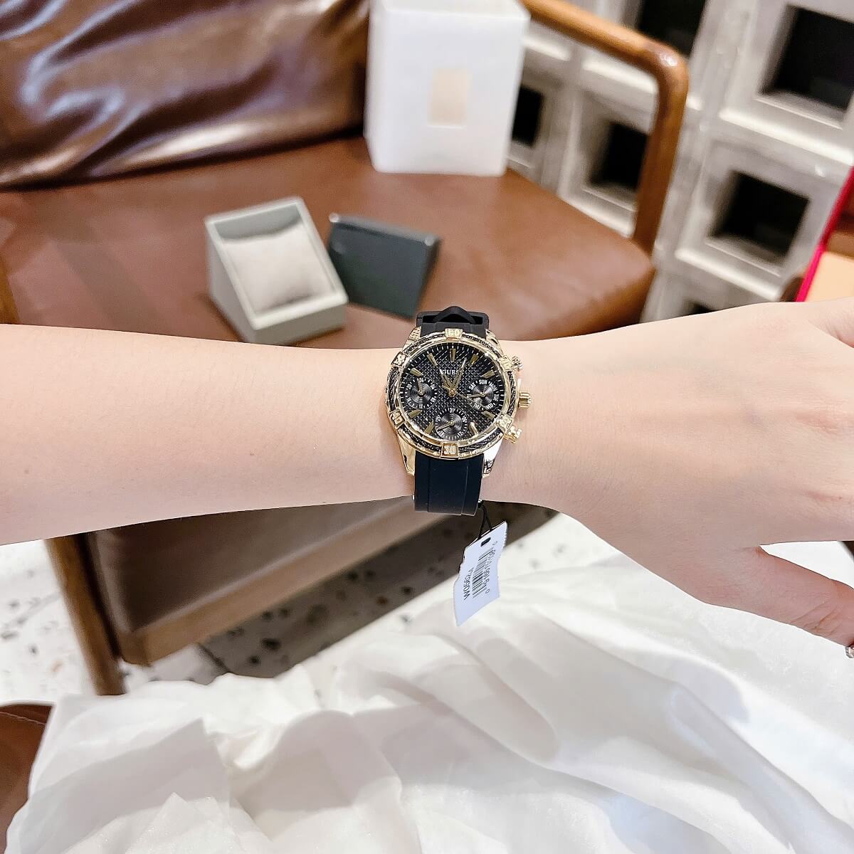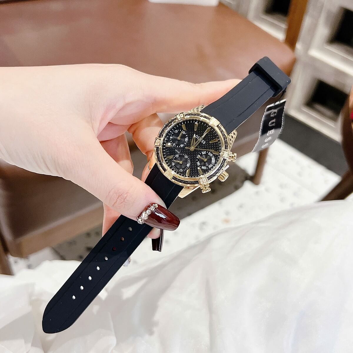 THÔNG TIN SẢN PHẨM: Đồng Hồ Nữ Guess W0562L4 Mặt Đen 6 Kim Dây Cao Su Đen Vỏ Kim Loại Mạ Vàng Size 34mm
