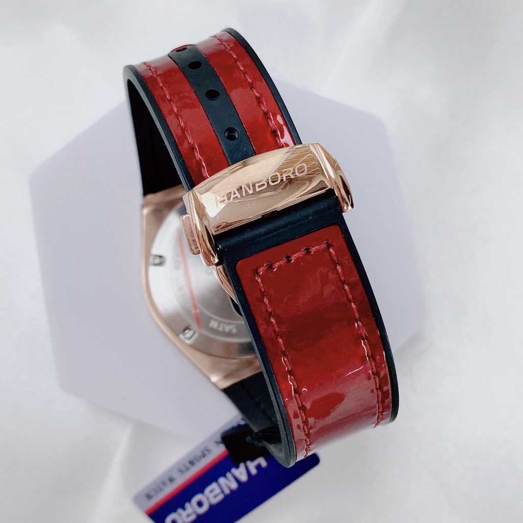 Đồng Hồ Nữ Hanboro By Huboler Dây Cao Su Bọc Da Đỏ Rose Gold 37mm Chính Hãng