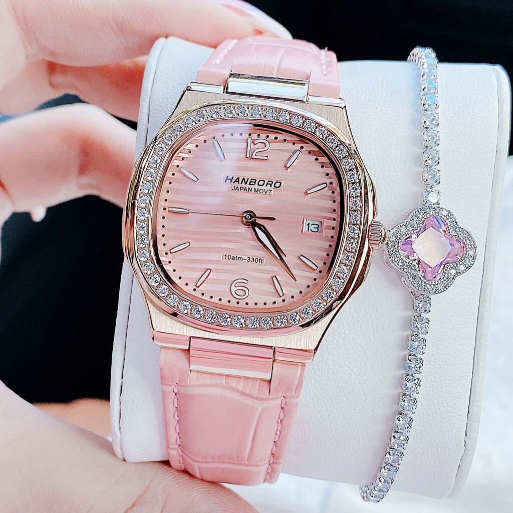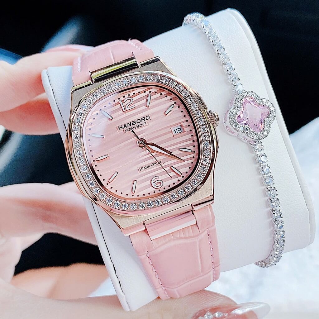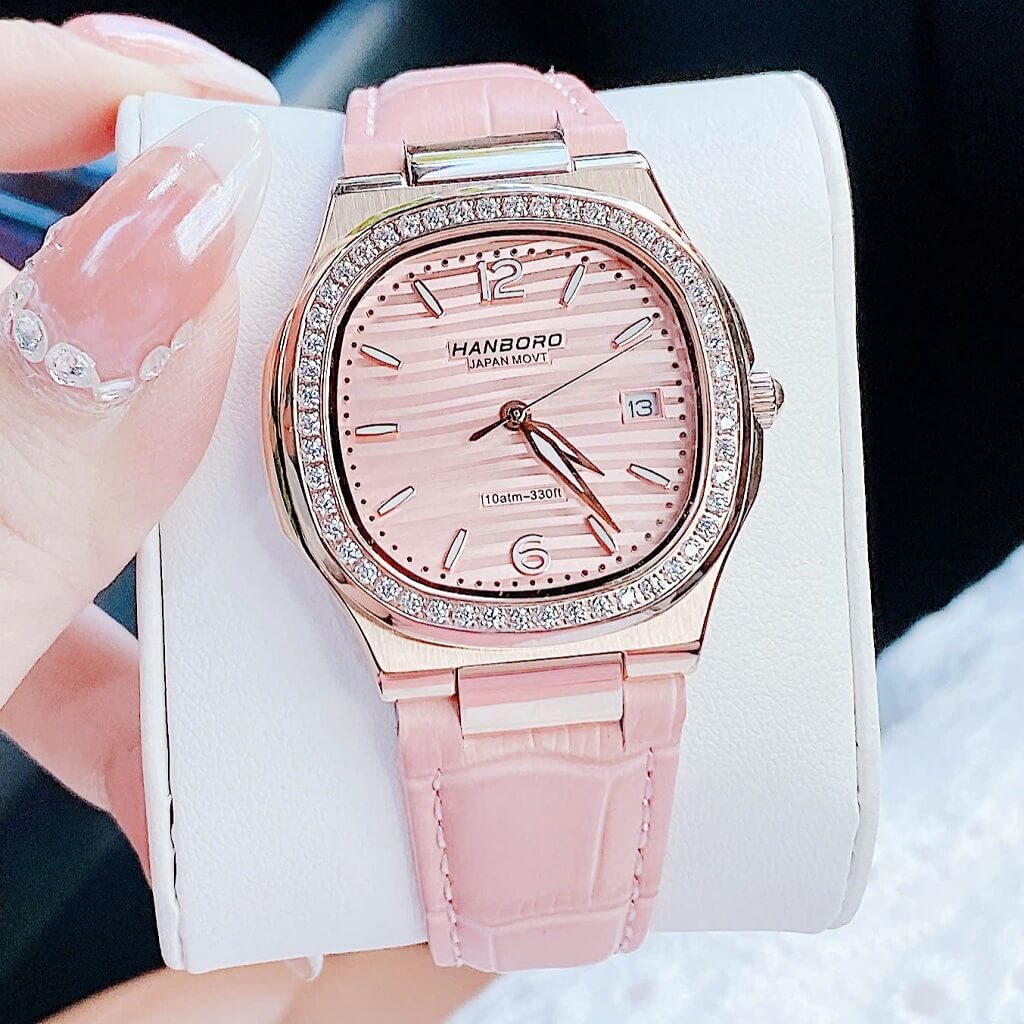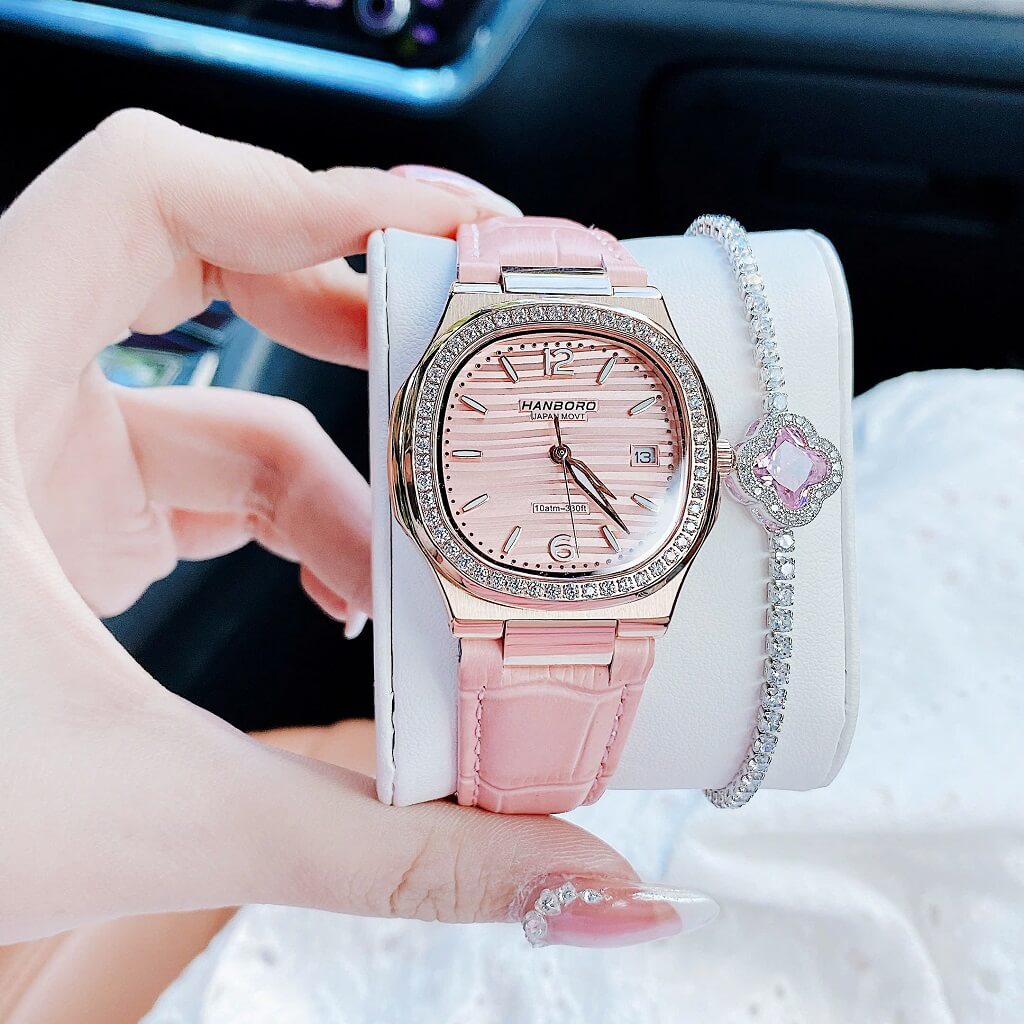 Đừng bỏ lỡ cơ hội sở hữu chiếc đồng hồ nữ dây da hồng vỏ vàng hồng đính đá size 34mm cực hot từ Hanboro – món phụ kiện giúp bạn trở nên nổi bật, dịu dàng và đầy cuốn hút.