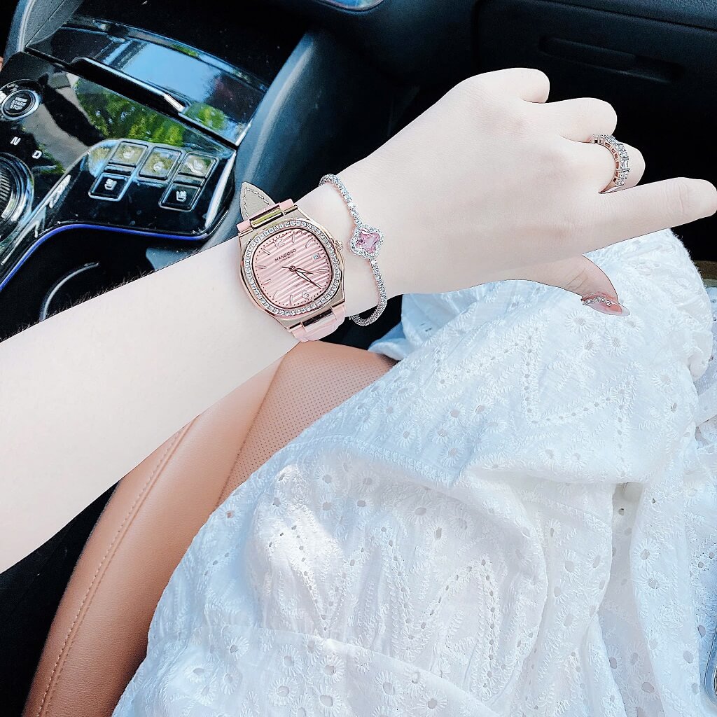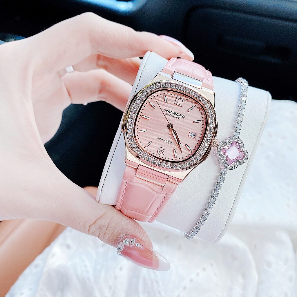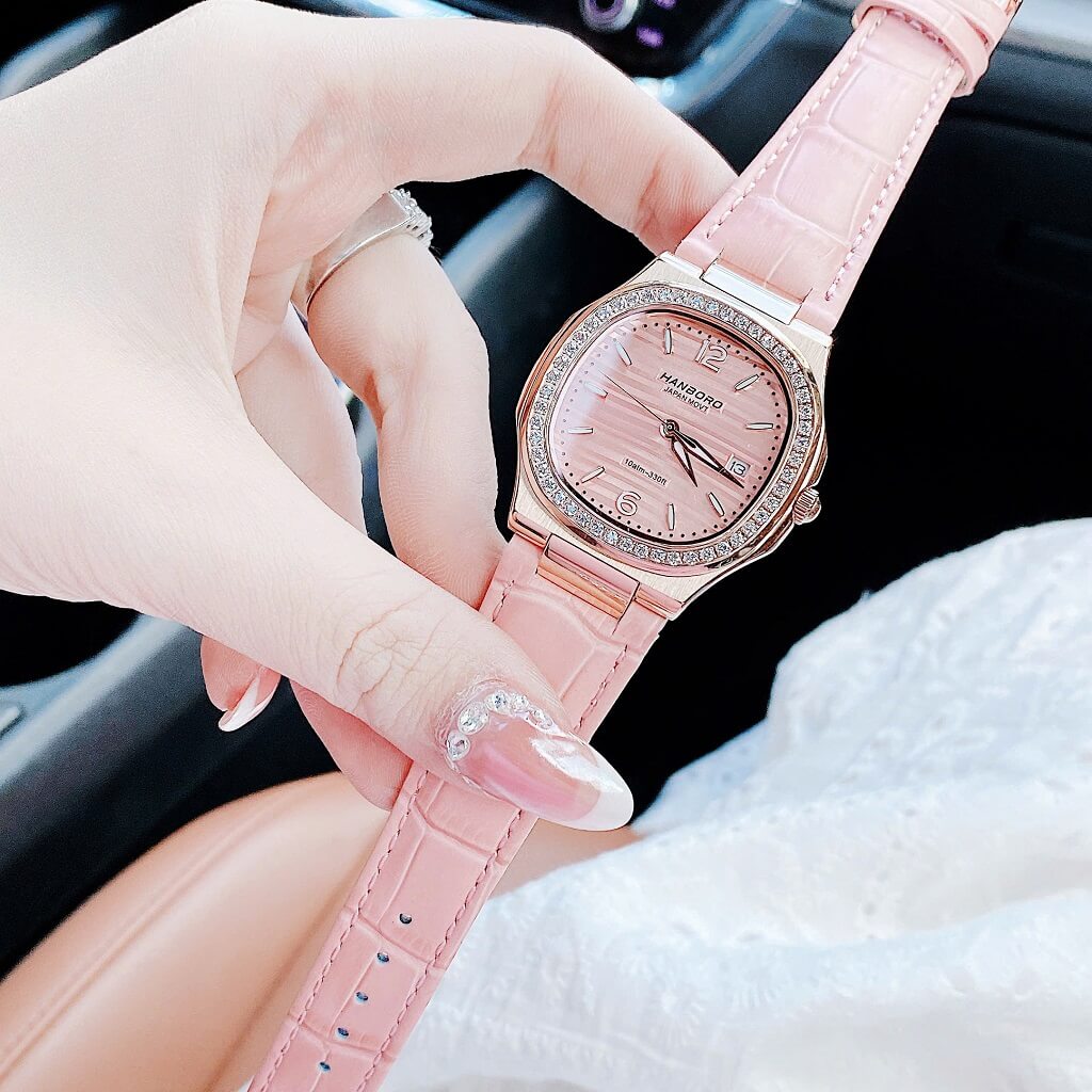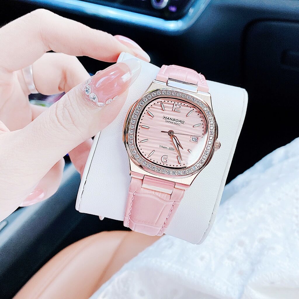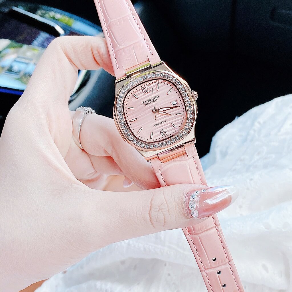 Đừng bỏ lỡ cơ hội sở hữu chiếc đồng hồ nữ dây da hồng vỏ vàng hồng đính đá size 34mm cực hot từ Hanboro – món phụ kiện giúp bạn trở nên nổi bật, dịu dàng và đầy cuốn hút.