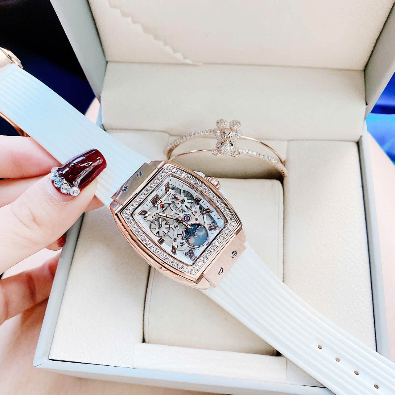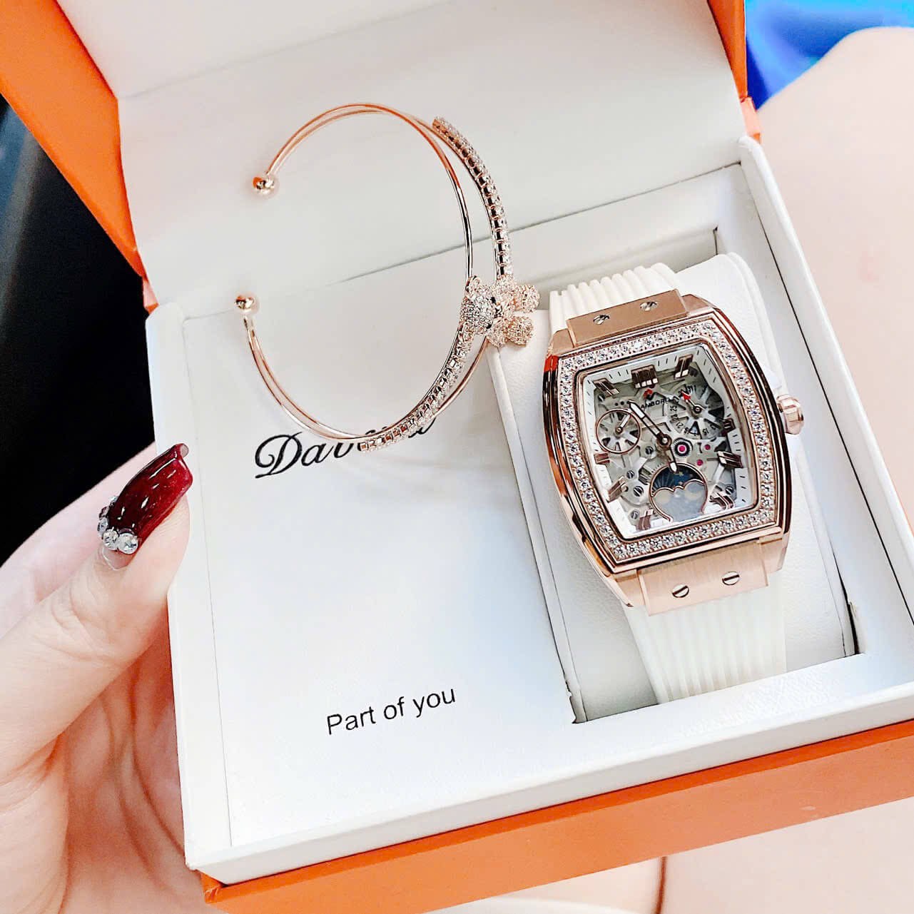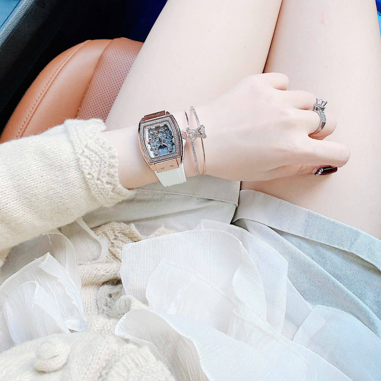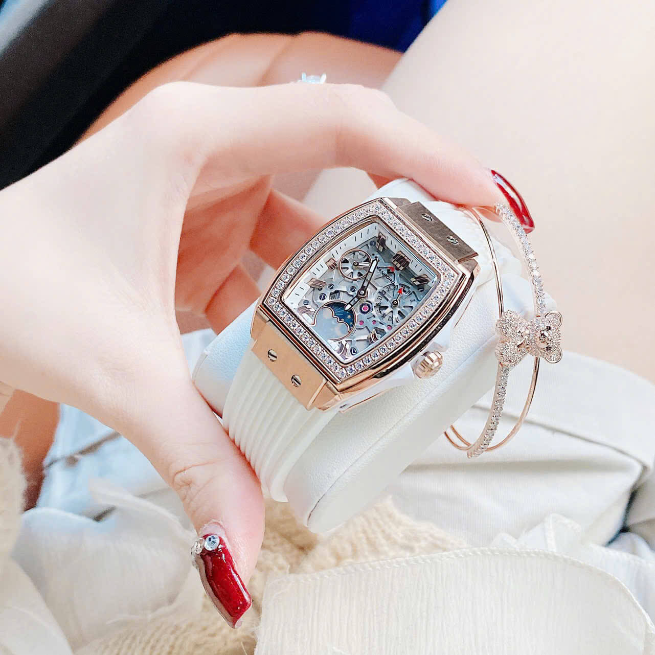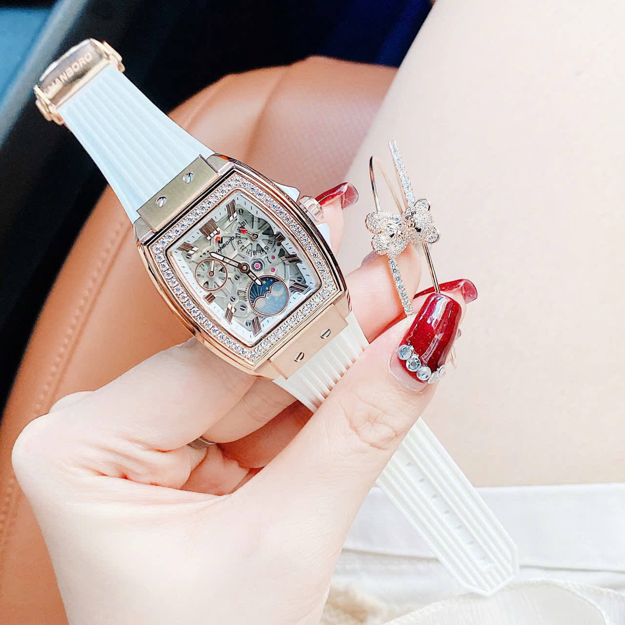 THÔNG TIN SẢN PHẨM: Đồng Hồ Nữ Hanboro Mặt Ovan Đính Đá Dây Cao Su Trắng Vỏ Kim Loại Vàng Hồng Size 36mm