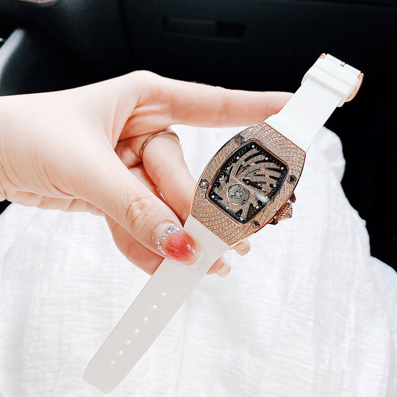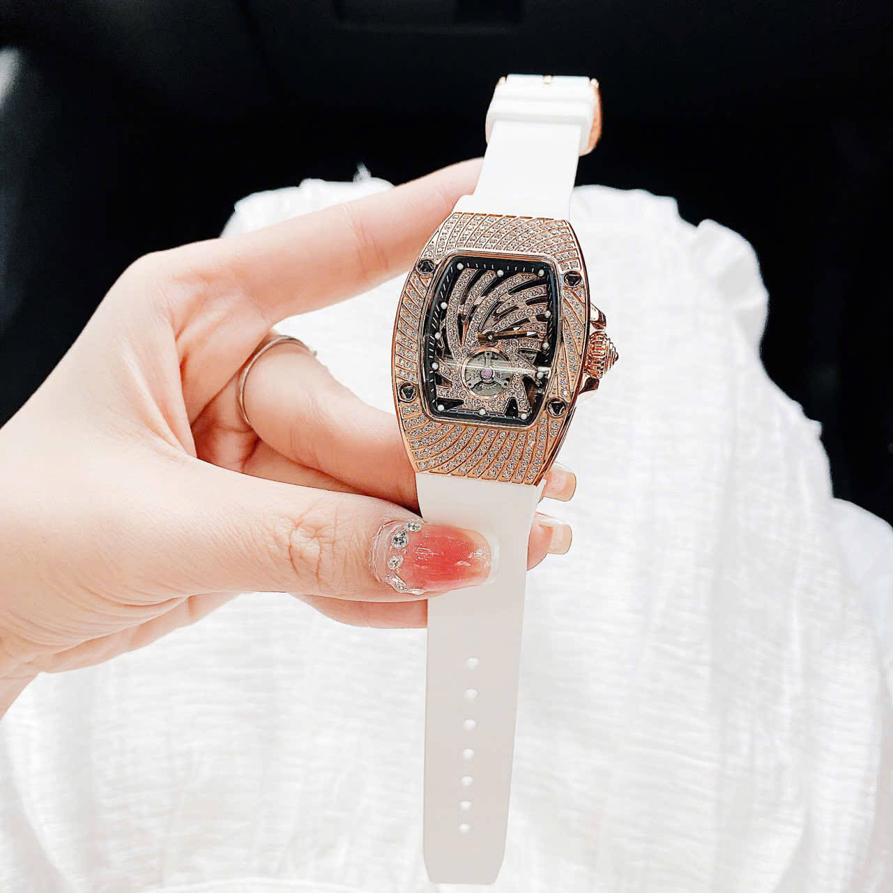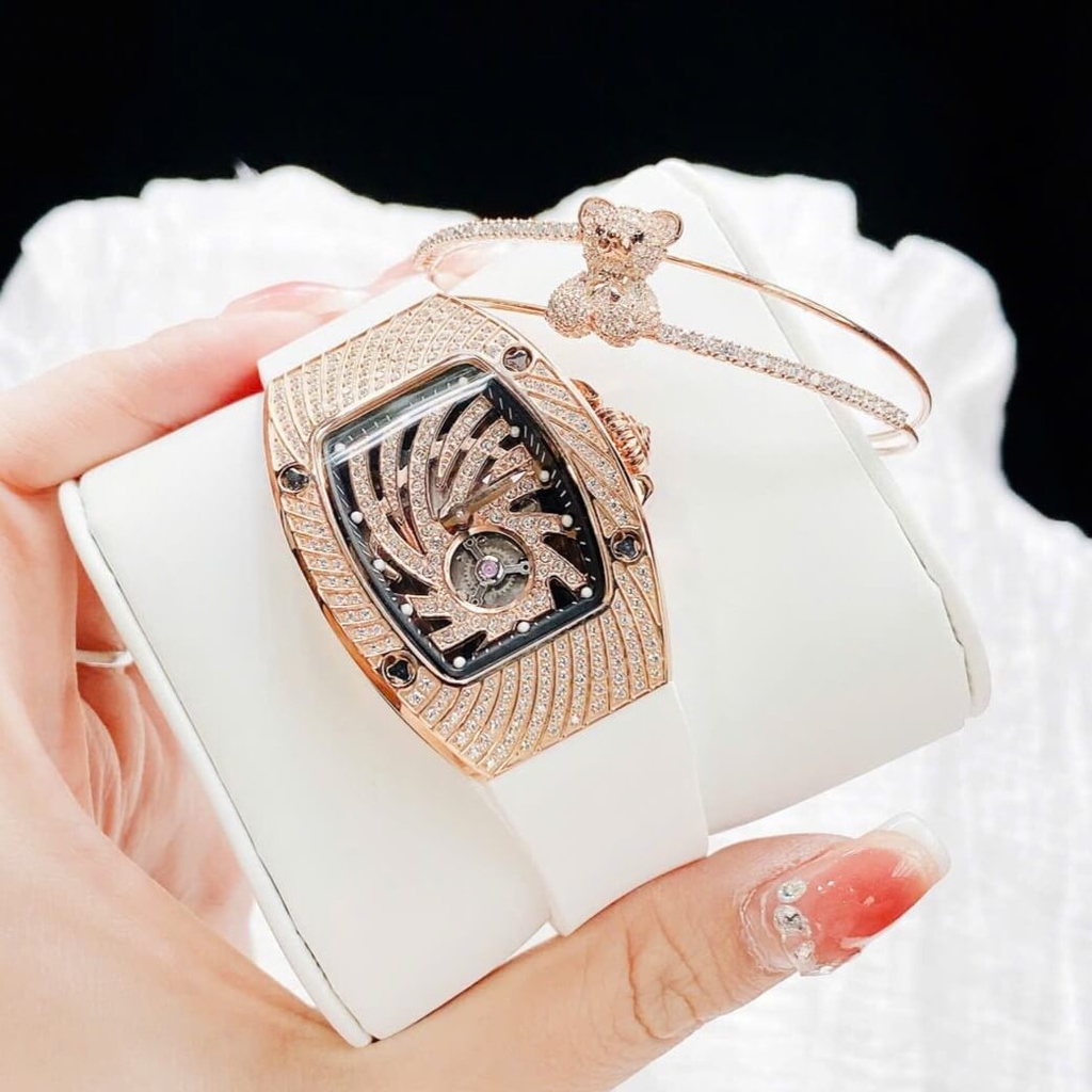 Với thiết kế kiểu dáng ovan giống richard miller tiền tỷ, mặt xoắn lốc xoáy đính full đá, kết hơp vị trí hở tim góc 6h như tâm mắt bão lan rộng ra tới bề mặt vỏ đồng hồ, nhìn cực ký độc đáo và hấp dẫn. Các cọc chỉ giờ là những đốm trắng dạ quang, 2 đầu kim chính cũng được phản quang tiện cho việc xem giờ.