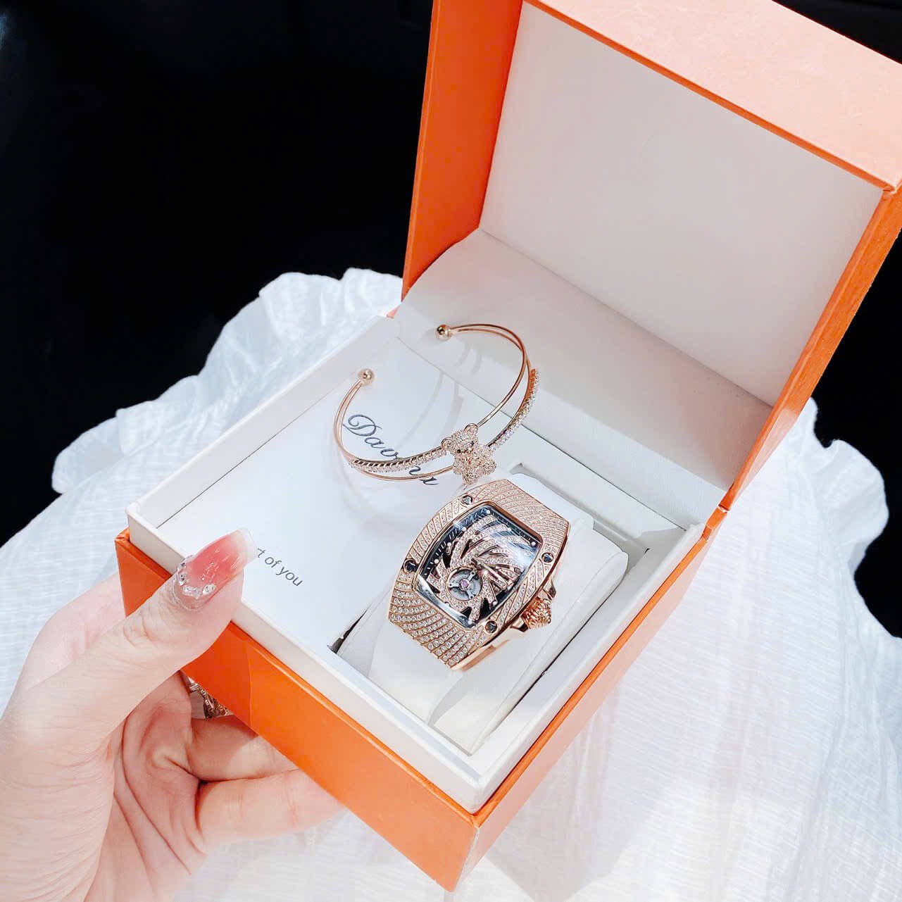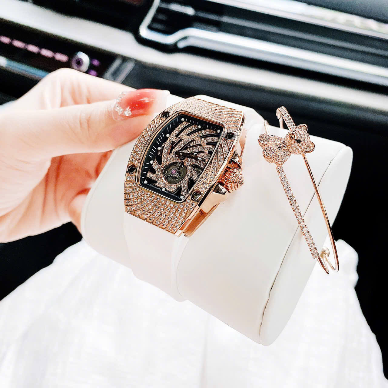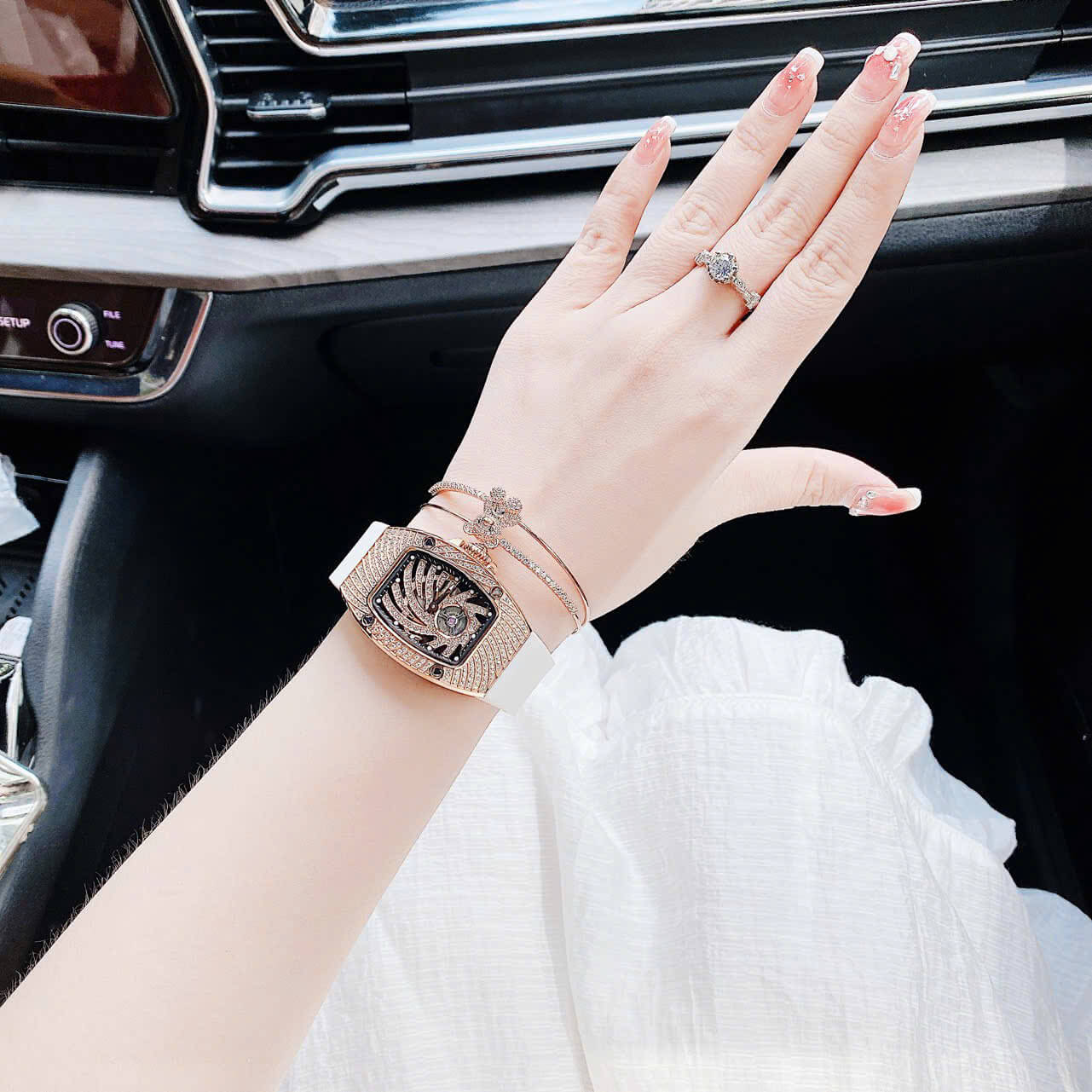 Với thiết kế kiểu dáng ovan giống richard miller tiền tỷ, mặt xoắn lốc xoáy đính full đá, kết hơp vị trí hở tim góc 6h như tâm mắt bão lan rộng ra tới bề mặt vỏ đồng hồ, nhìn cực ký độc đáo và hấp dẫn. Các cọc chỉ giờ là những đốm trắng dạ quang, 2 đầu kim chính cũng được phản quang tiện cho việc xem giờ.