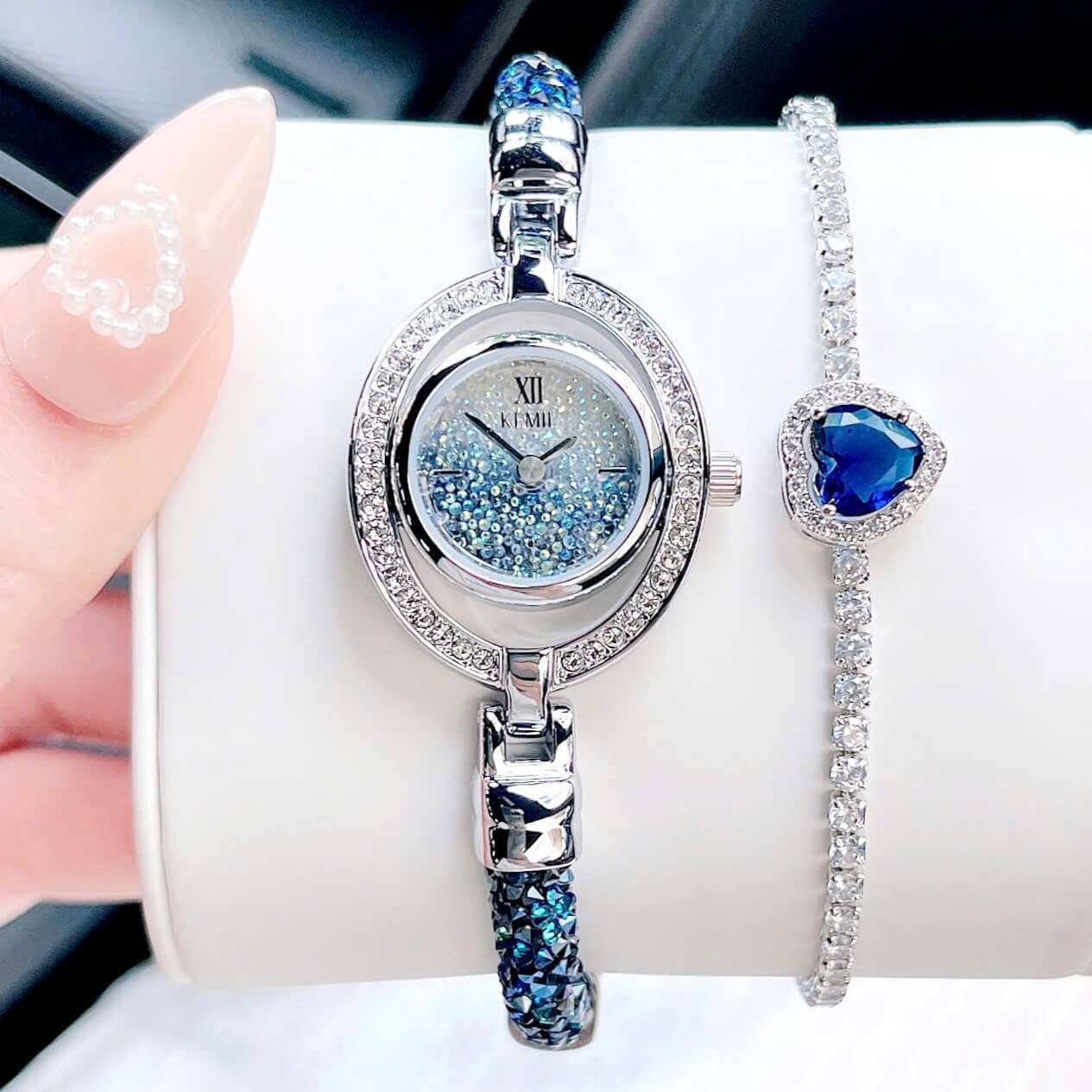 Đồng Hồ Nữ Kemil KM2402 Dáng Cuff Xanh Dương Vỏ Silver 25x31mm là một mẫu đồng hồ rất thanh lịch và sang trọng. Dưới đây là một số thông tin chi tiết về sản phẩm: