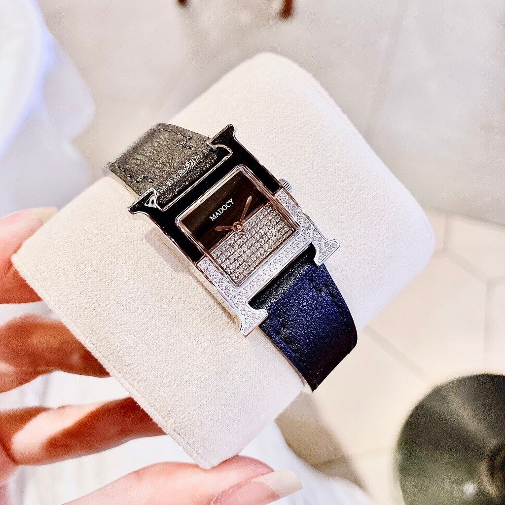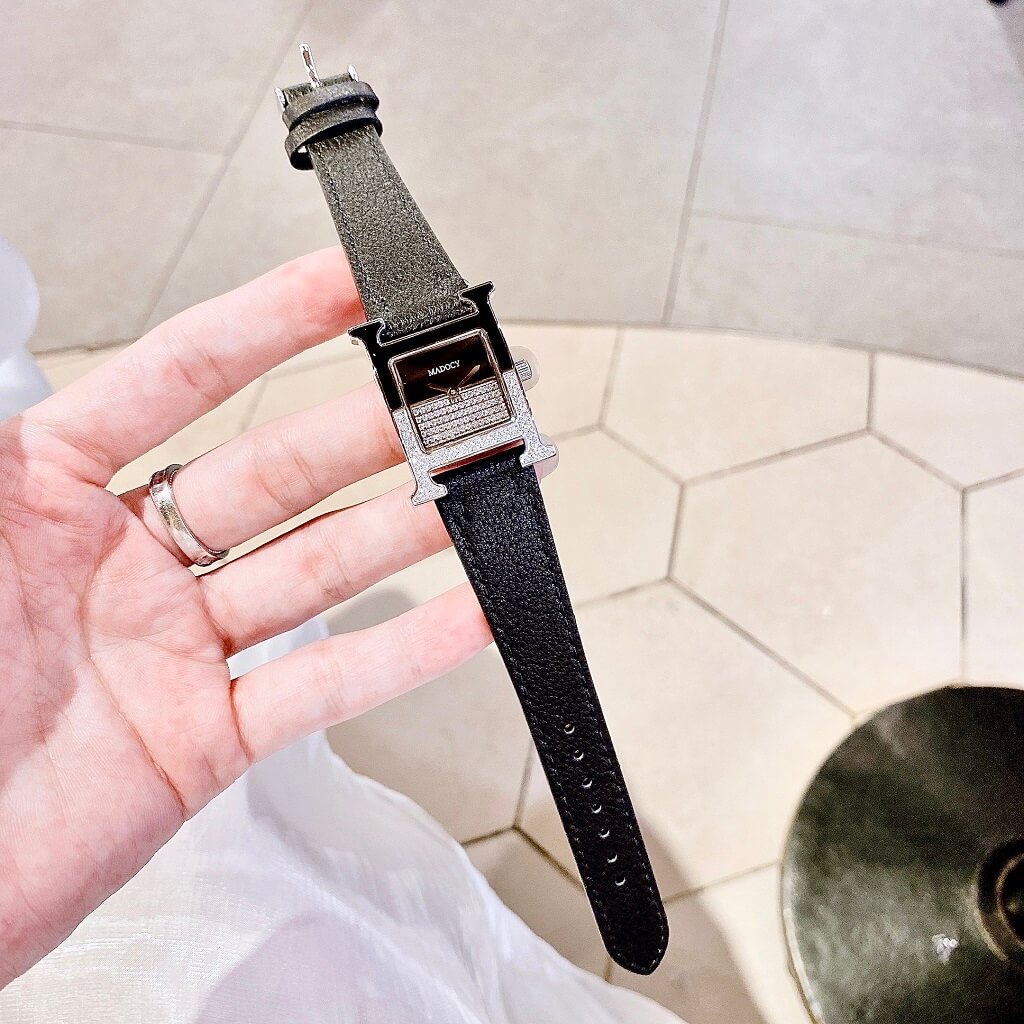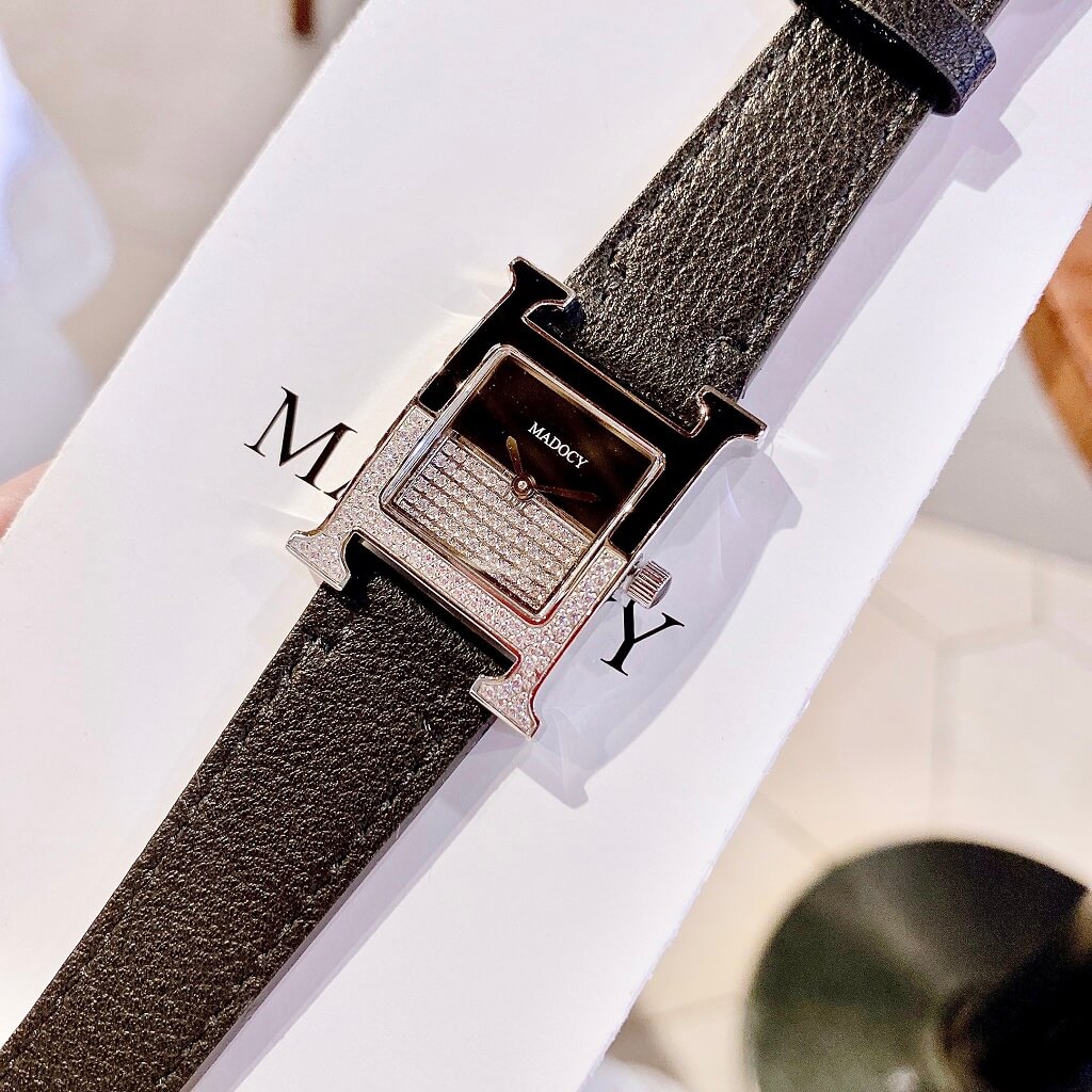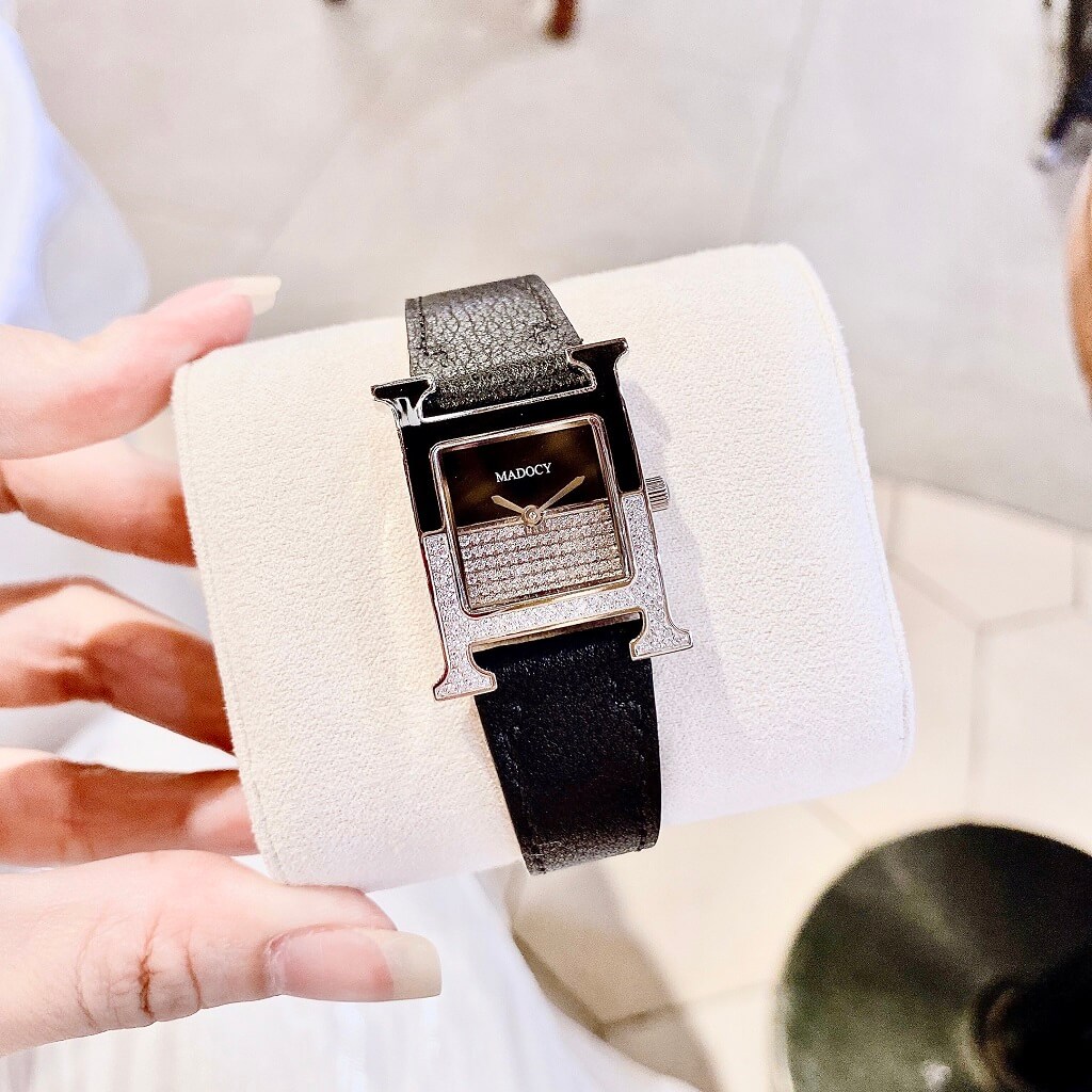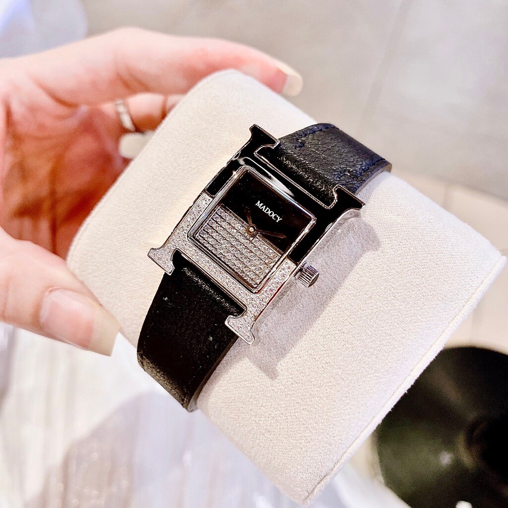 Thiết kế phom dáng chữ H Hermes, mặt chia đối xứng, phần dưới đính full đá silver sáng long lanh