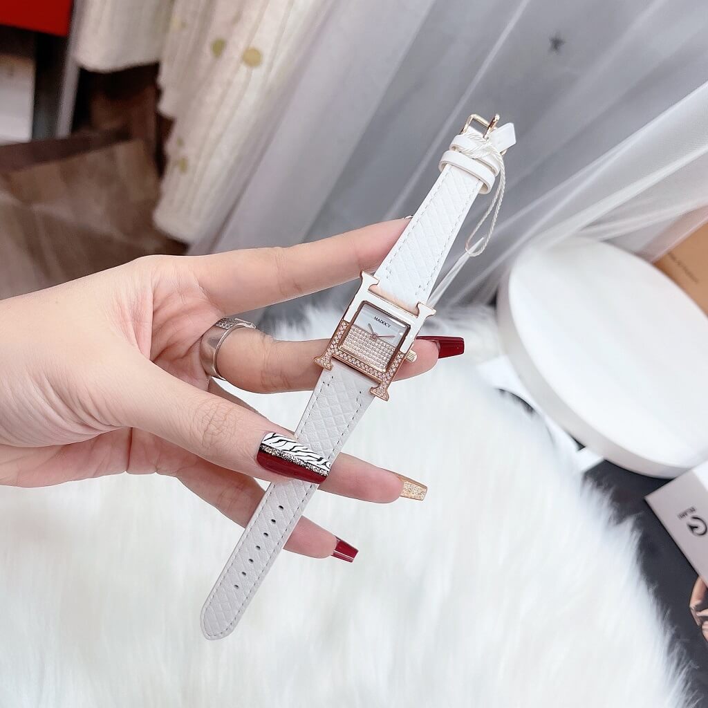 Thiết kế phom dáng chữ H Hermes, mặt chia đối xứng, phần dưới đính full đá silver sáng long lanh