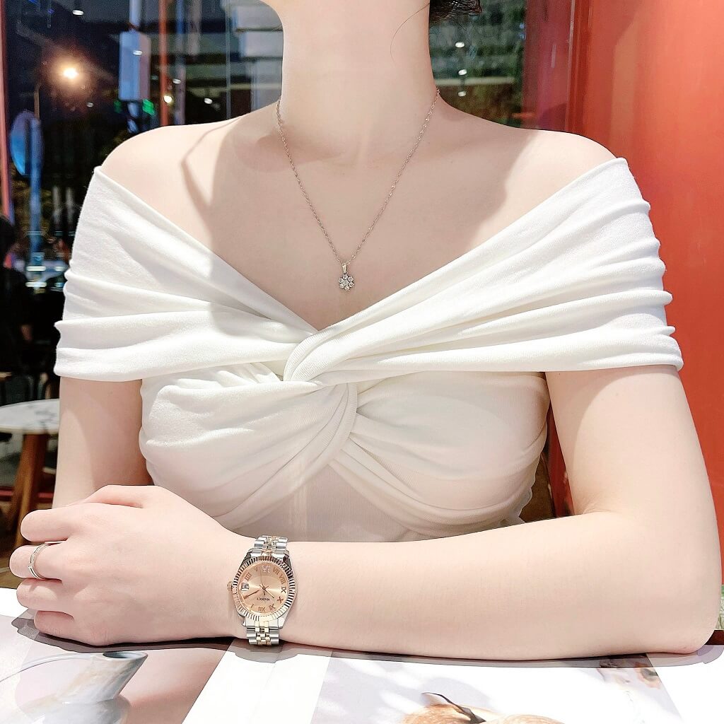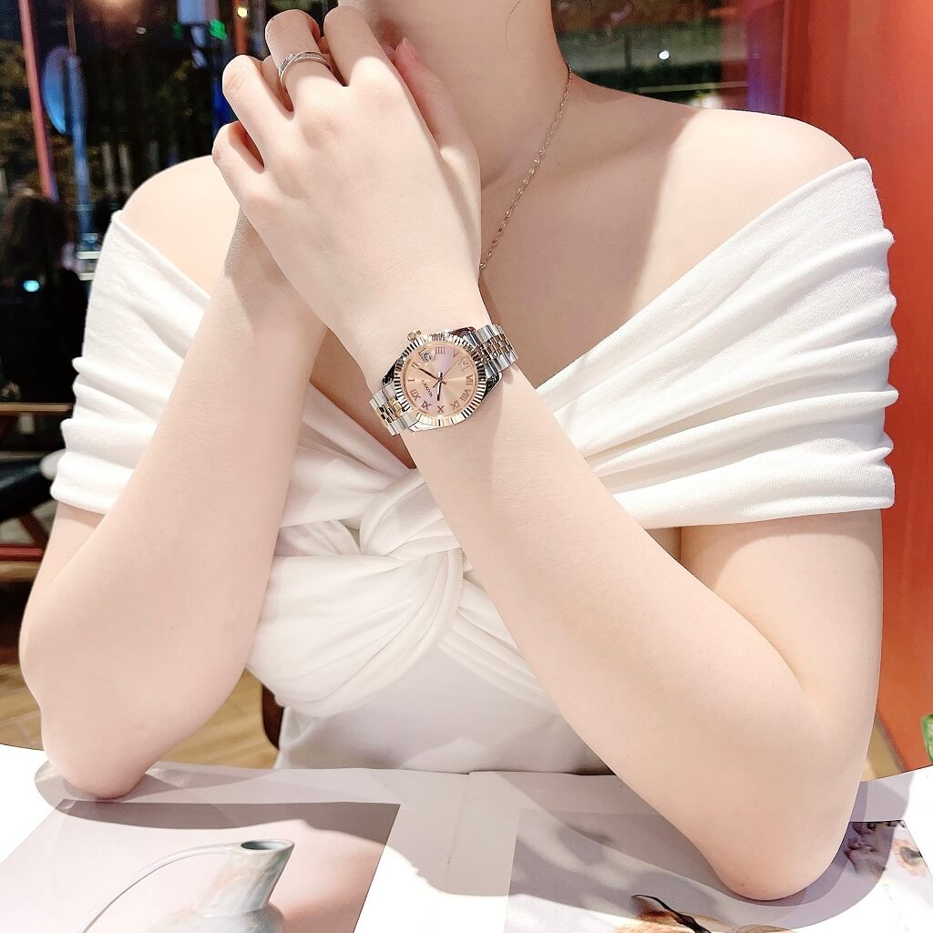 Viền xung quanh, cột giờ rõ ràng số la mã, điểm nhấn 6h gắn đá pha lê swarovski lấp lánh. Khoá bướm tiện lợi, kính shaphire xịn sò.