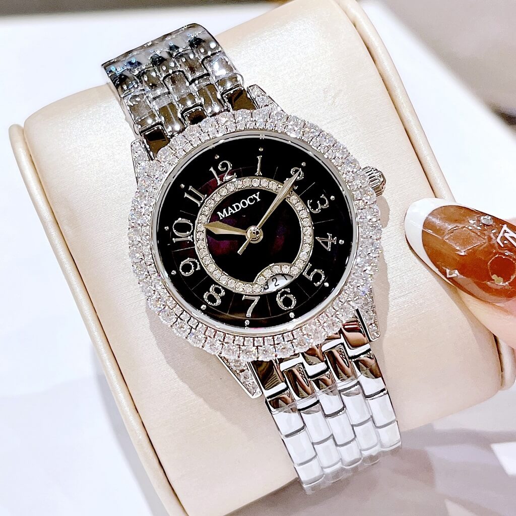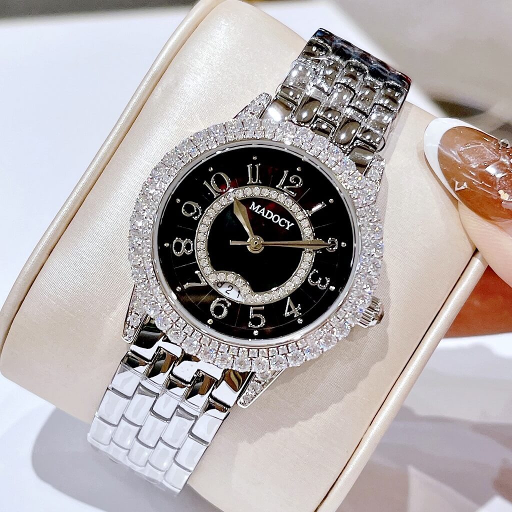 - Chiếc đồng hồ với chất liệu thép ko gỉ, full đá pha lê sáng choang, mặt đồng hồ màu đen đính đá vòng nổi bật