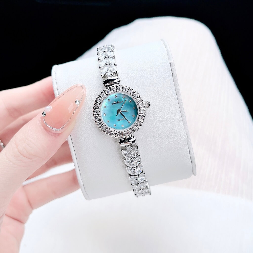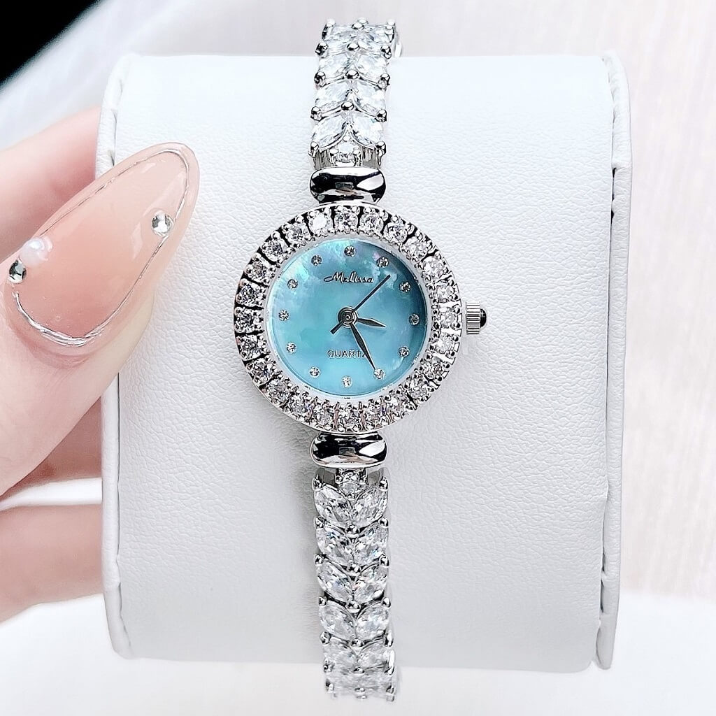 Thanh khiết trong trẻo như nàng Mỹ Nhân Ngư. Melissa lâu lâu lại cho ra mắt một mẫu bé xinh cưng hết nấc, case siêu yêu 26mm dành cho các nàng tay tấm. Mặt đồng hồ khảm trai, đá đính quanh viền, các mốc giờ điểm đá cực dễ nhìn. Điểm nhấn đặc biệt là đá hình chiếc lá xếp đối xứng ở phần quai đẹp dã man