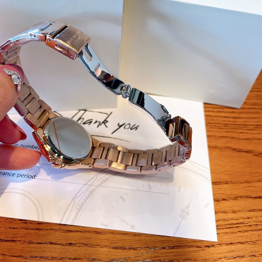 - Dây vỏ inox mạ vàng hồng sáng loáng, với viền đính đá lấp lánh kiểu mâm xôi, mặt dial với 3 vòng chức năng ngày, thứ, ngày đêm 24h