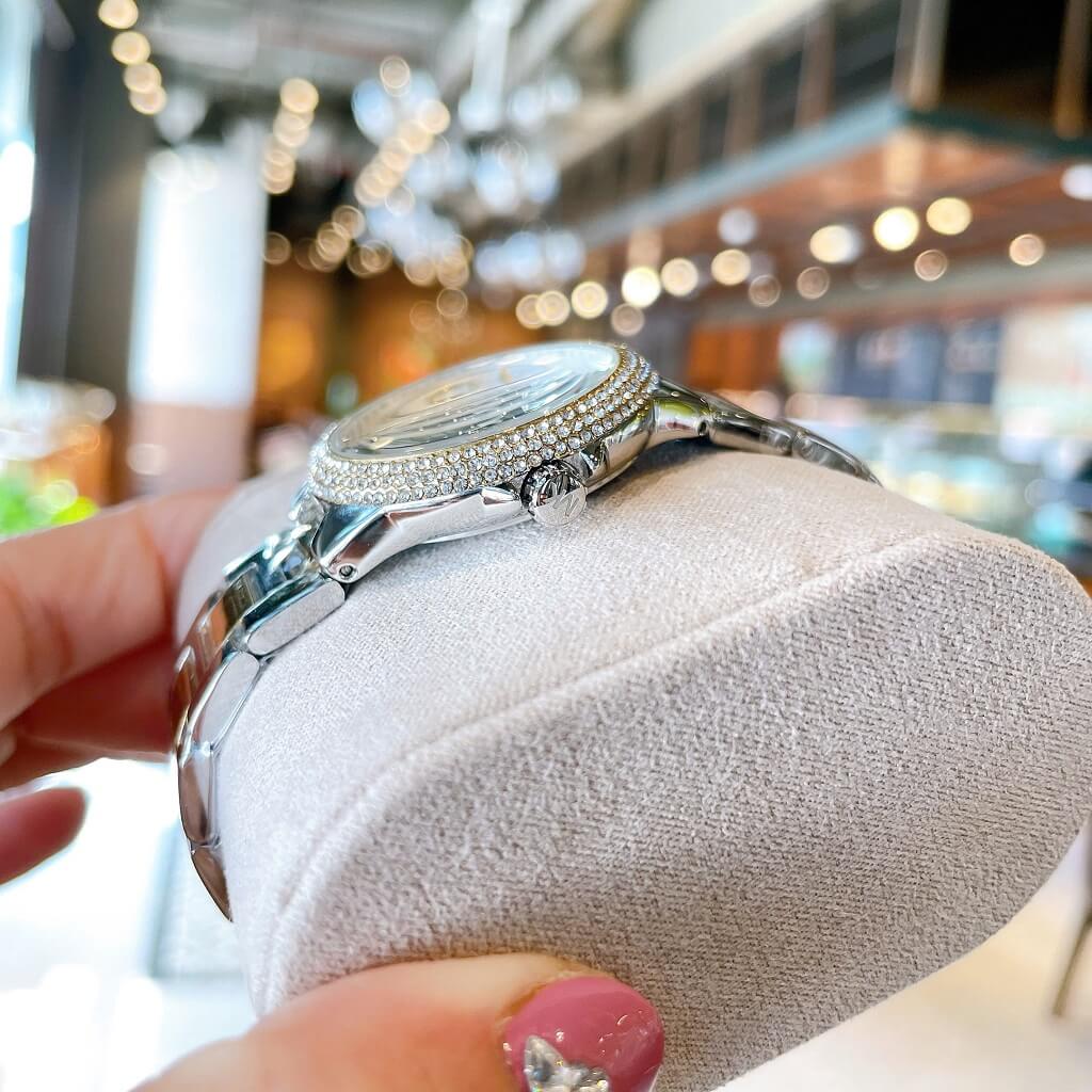 - Dây vỏ inox mạ vàng sáng loáng, với viền đính đá lấp lánh kiểu mâm xôi, mặt dial với 3 vòng chức năng ngày, thứ, ngày đêm 24h