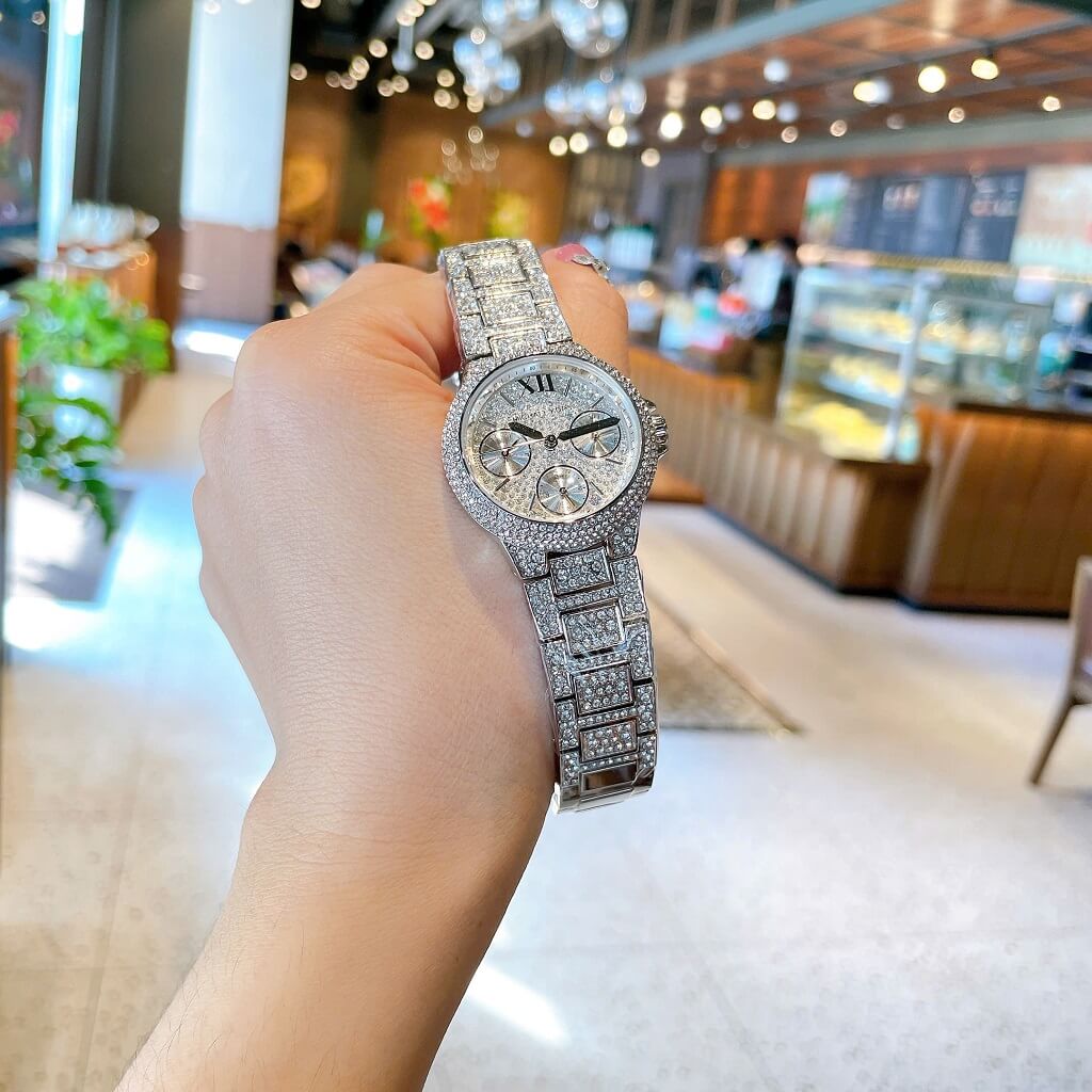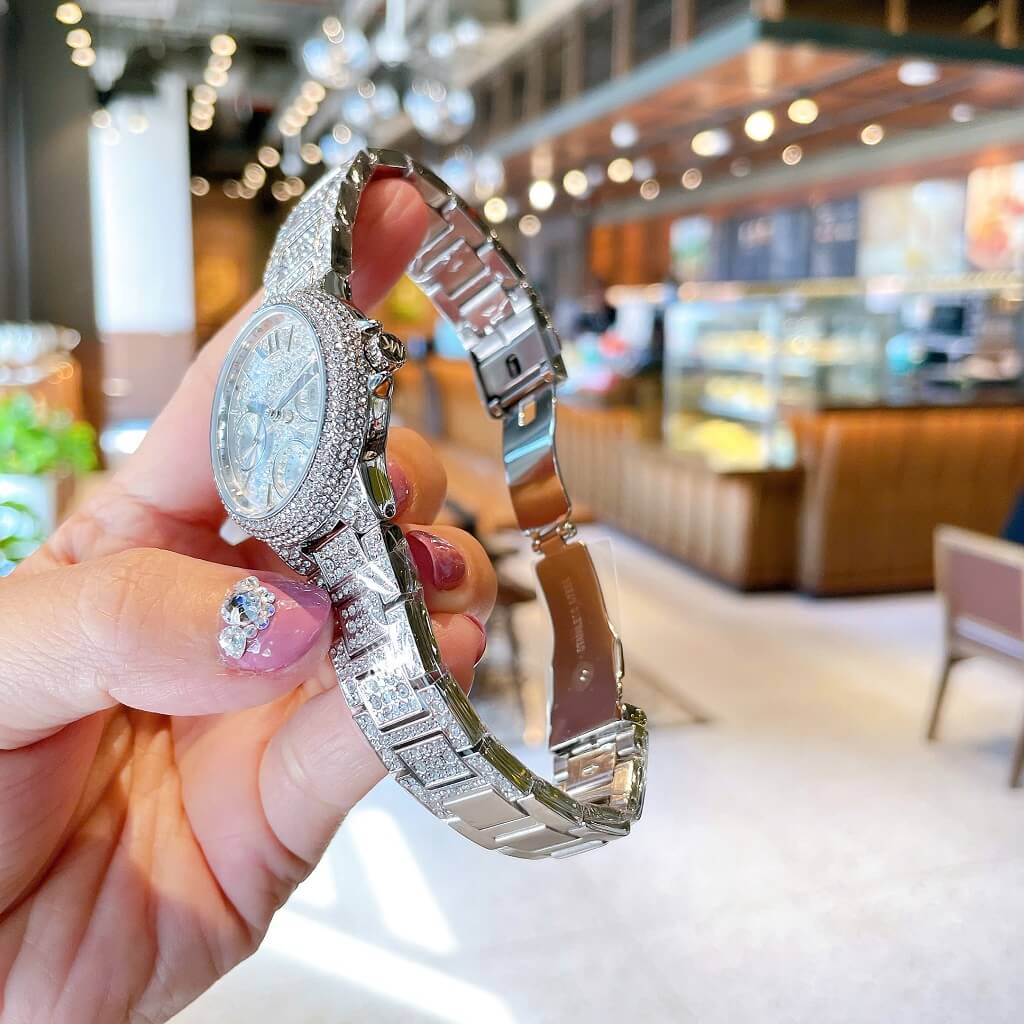 - Dây vỏ inox sáng loáng đính đá lấp lánh, với viền đính đá kiểu mâm xôi, mặt dial với 3 vòng chức năng ngày, thứ, ngày đêm 24h, đính đá full mặt