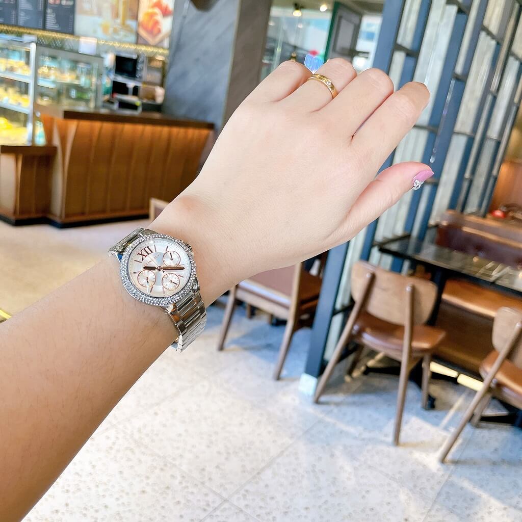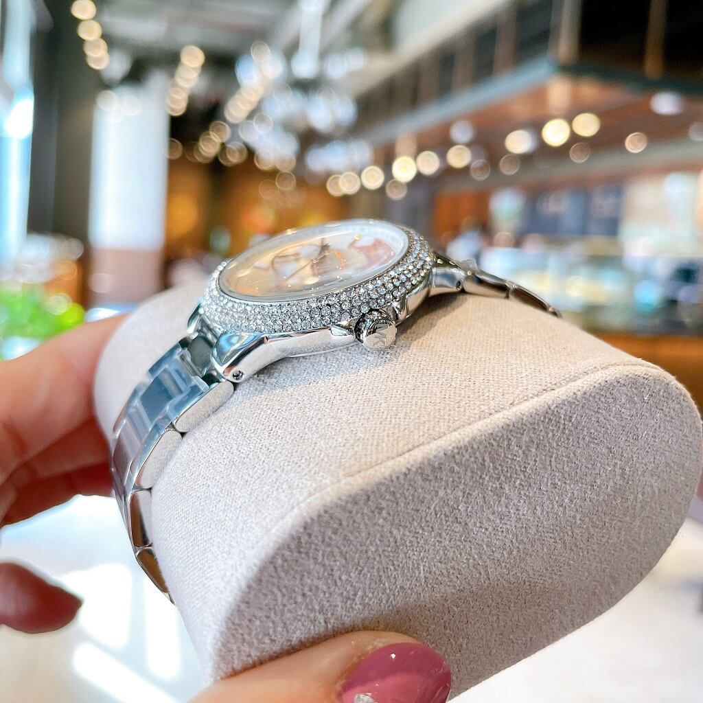 - Dây vỏ inox sáng loáng, với viền đính đá lấp lánh kiểu mâm xôi, mặt dial với 3 vòng chức năng ngày, thứ, ngày đêm 24h