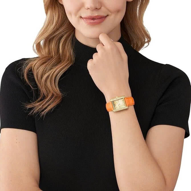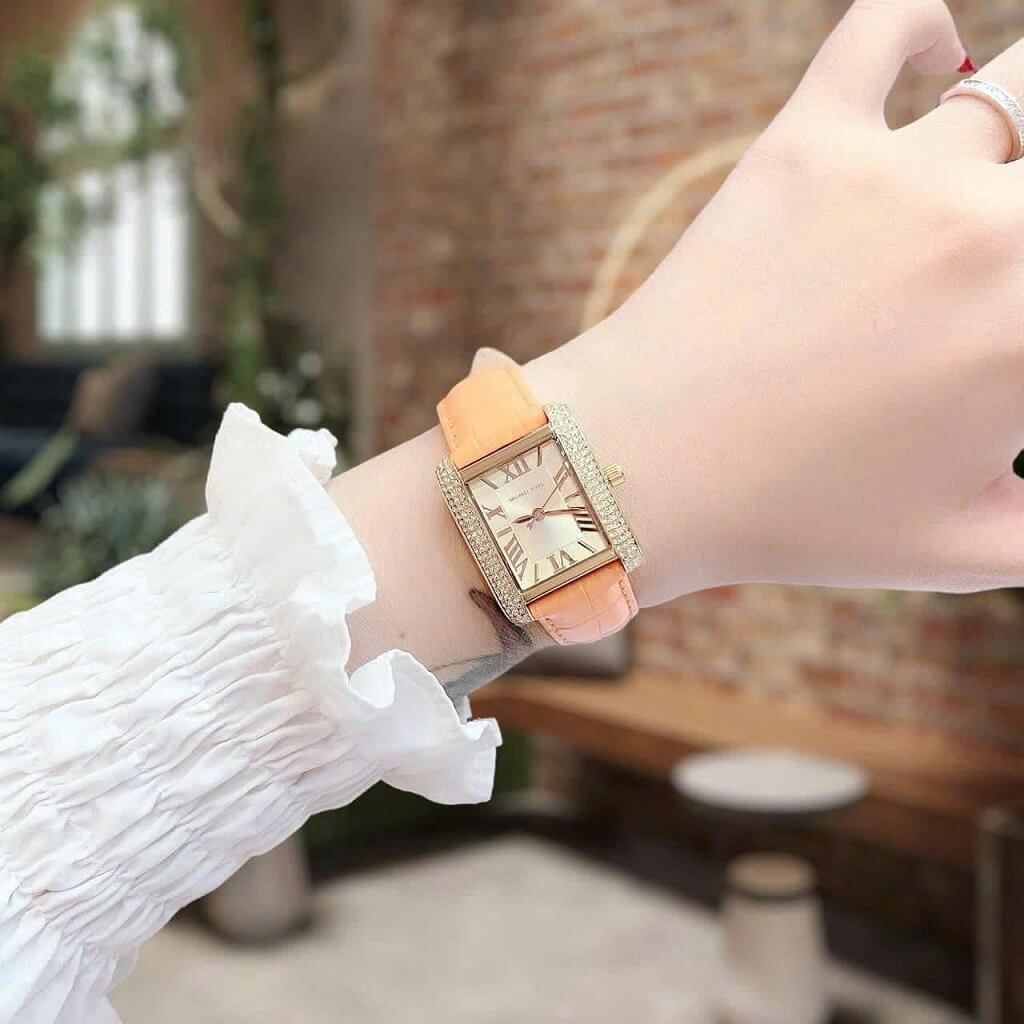 - Dây da cam mềm mại ôm tay, mặt dial chữ nhật với cọc số la mã nổi bật trên nền màu vàng sáng tươi