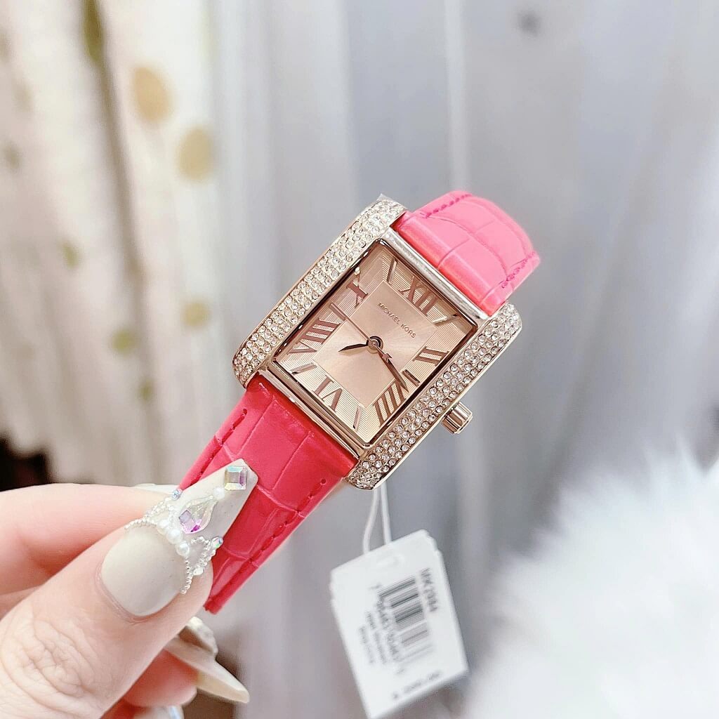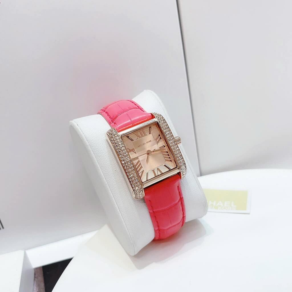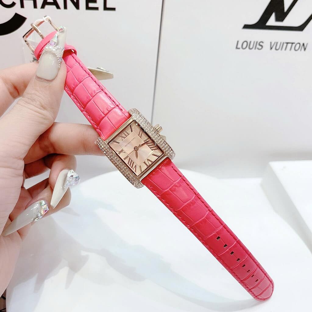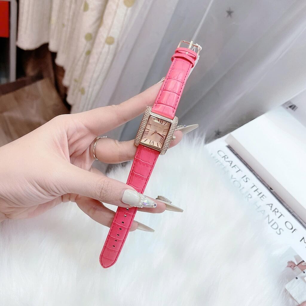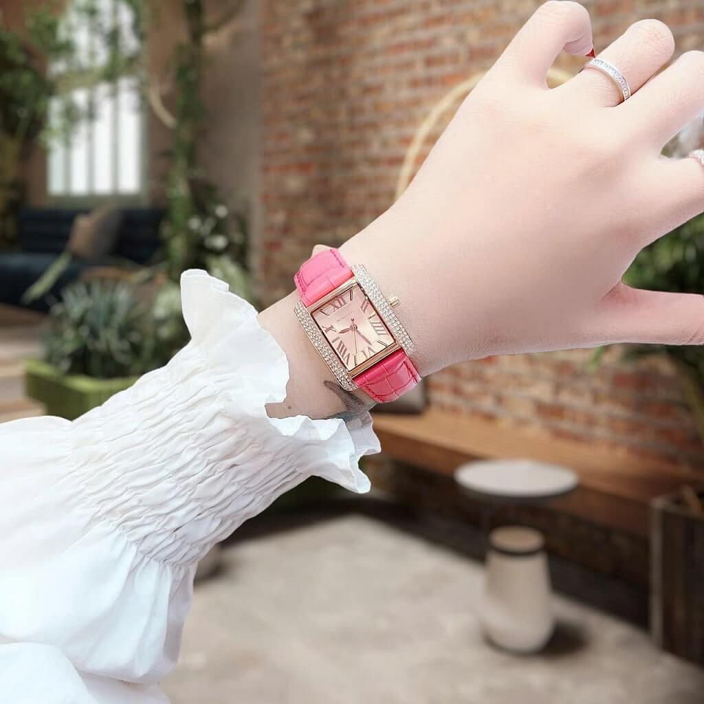- Dây da hồng mềm mại ôm tay, mặt dial chữ nhật với cọc số la mã nổi bật trên nền màu vàng hồng