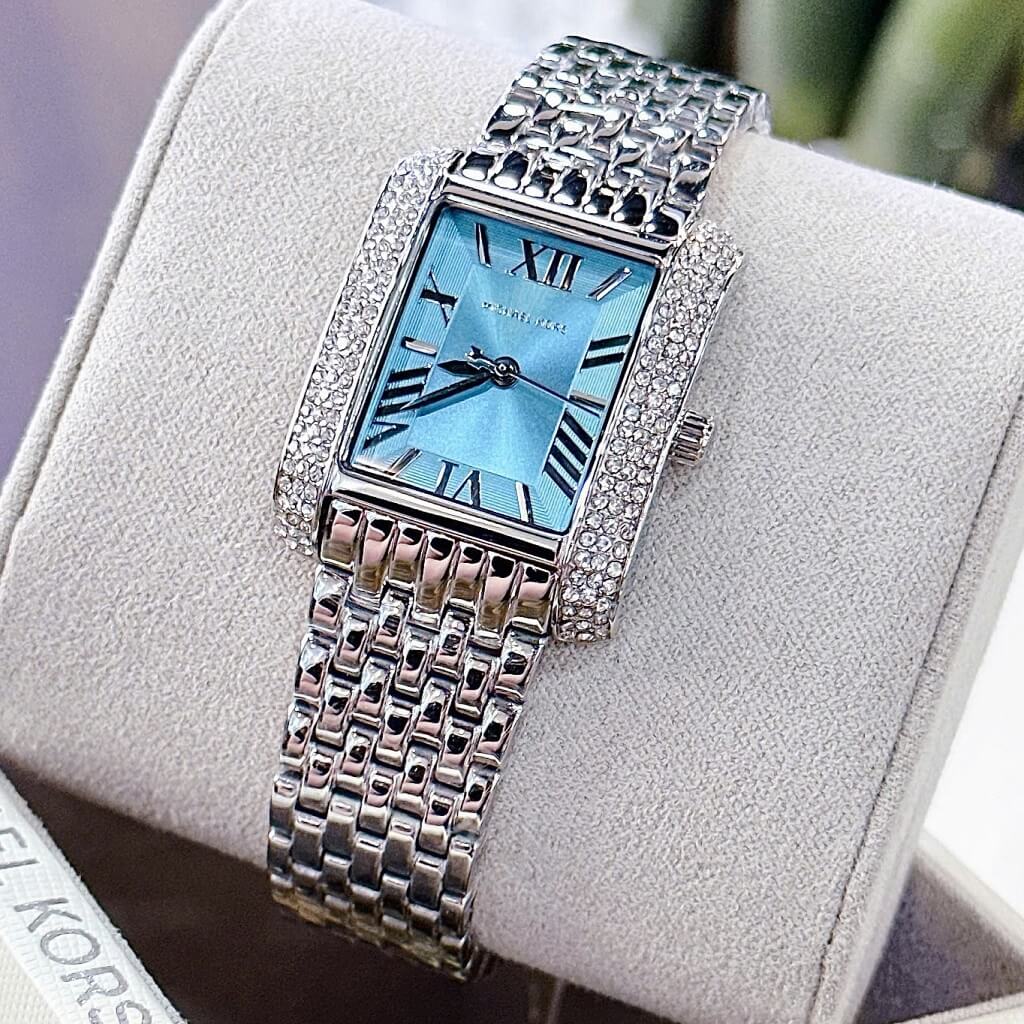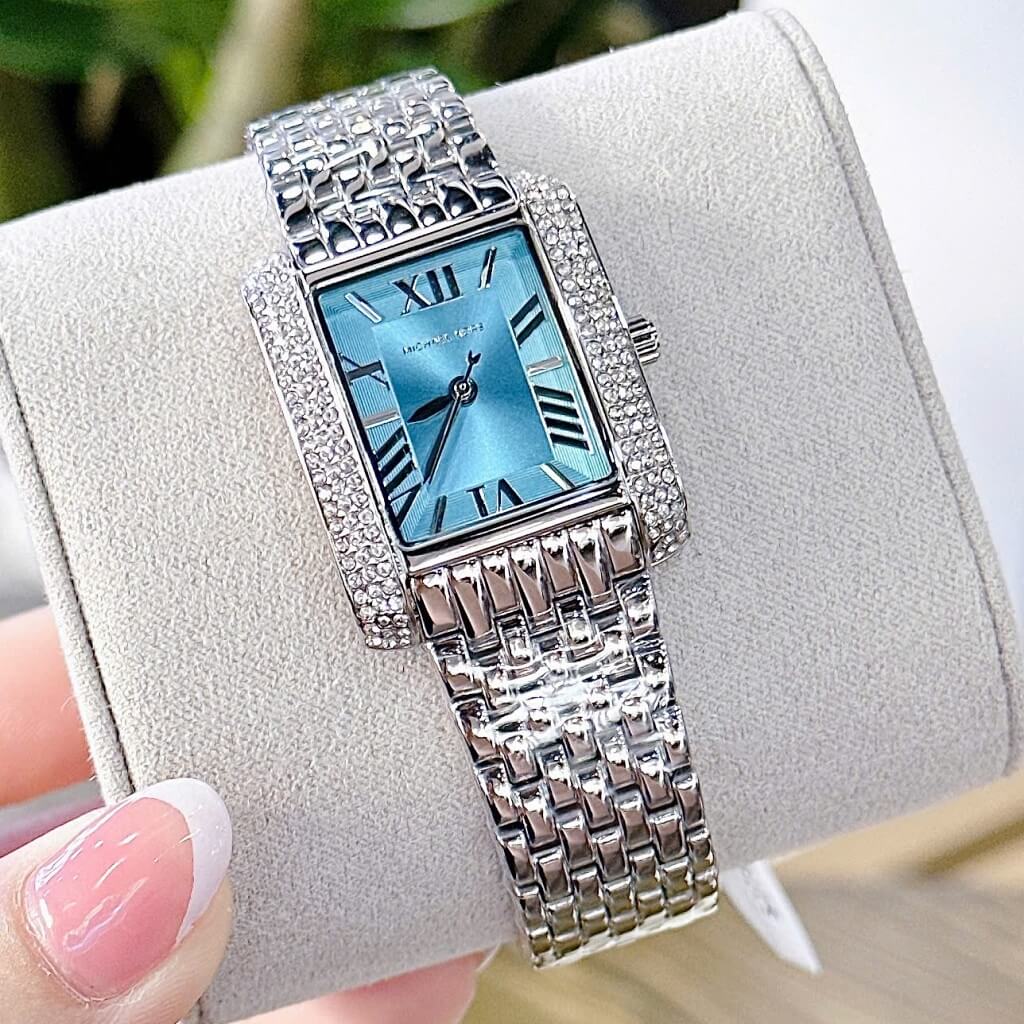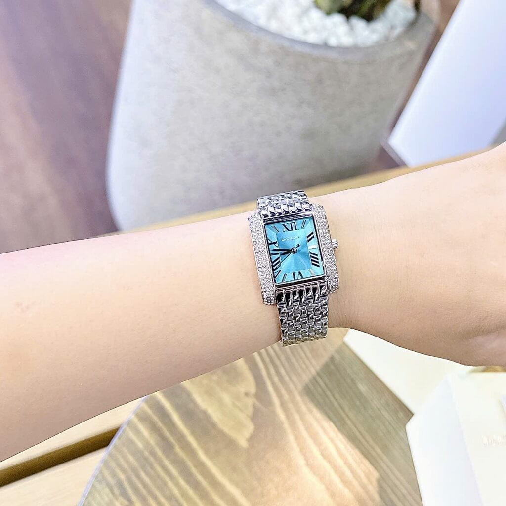 - Vỏ dây inox sáng loáng, mặt dial chữ nhật với cọc số la mã nổi bật trên nền màu xanh nhạt. Dây mắt nhuyễn ôm tay dễ đeo
