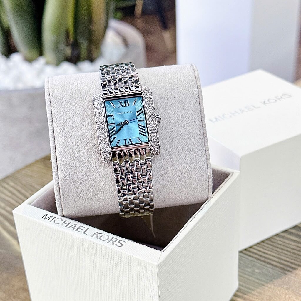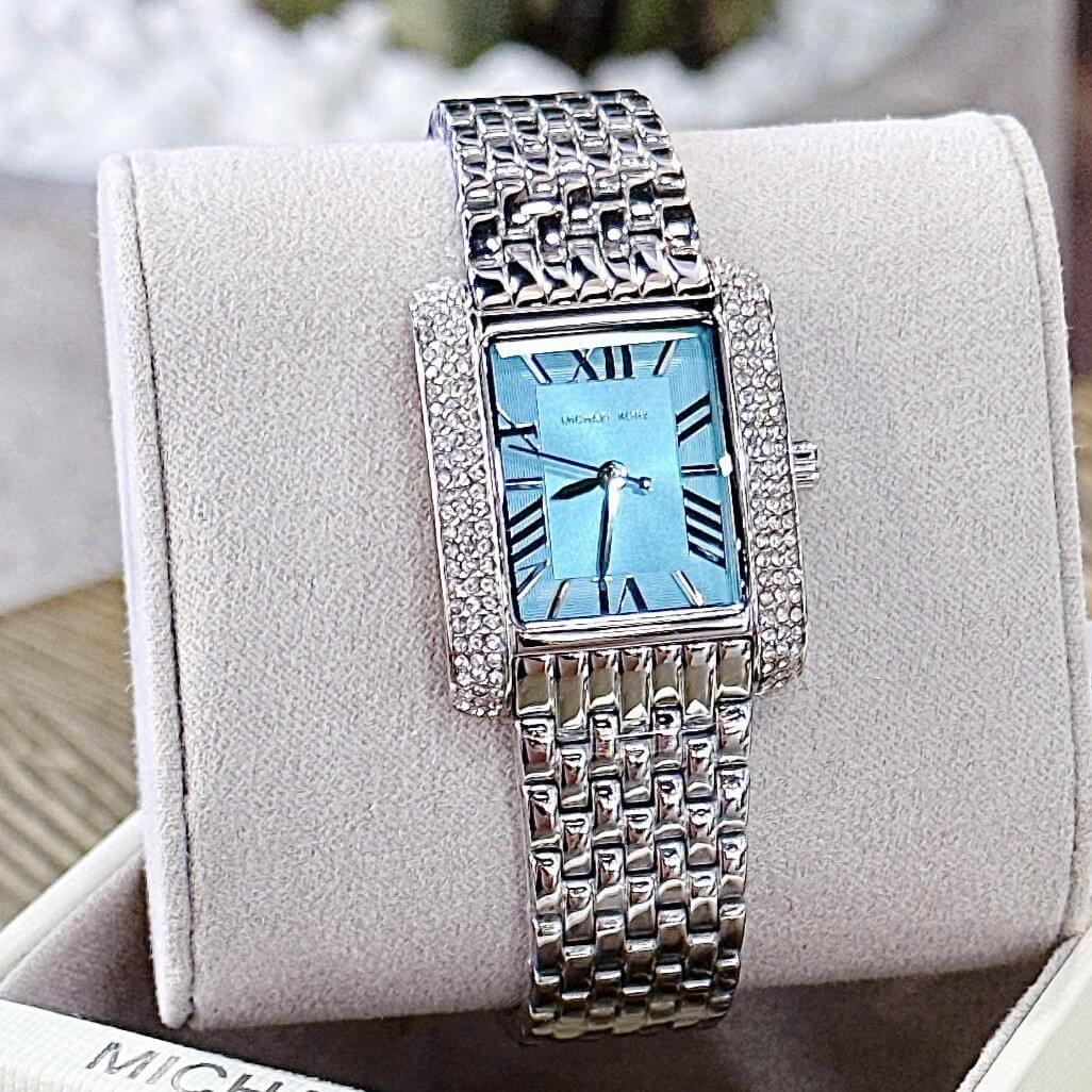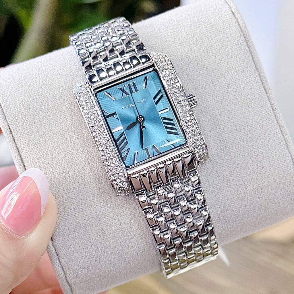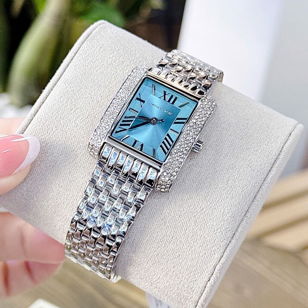- Vỏ dây inox sáng loáng, mặt dial chữ nhật với cọc số la mã nổi bật trên nền màu xanh nhạt. Dây mắt nhuyễn ôm tay dễ đeo