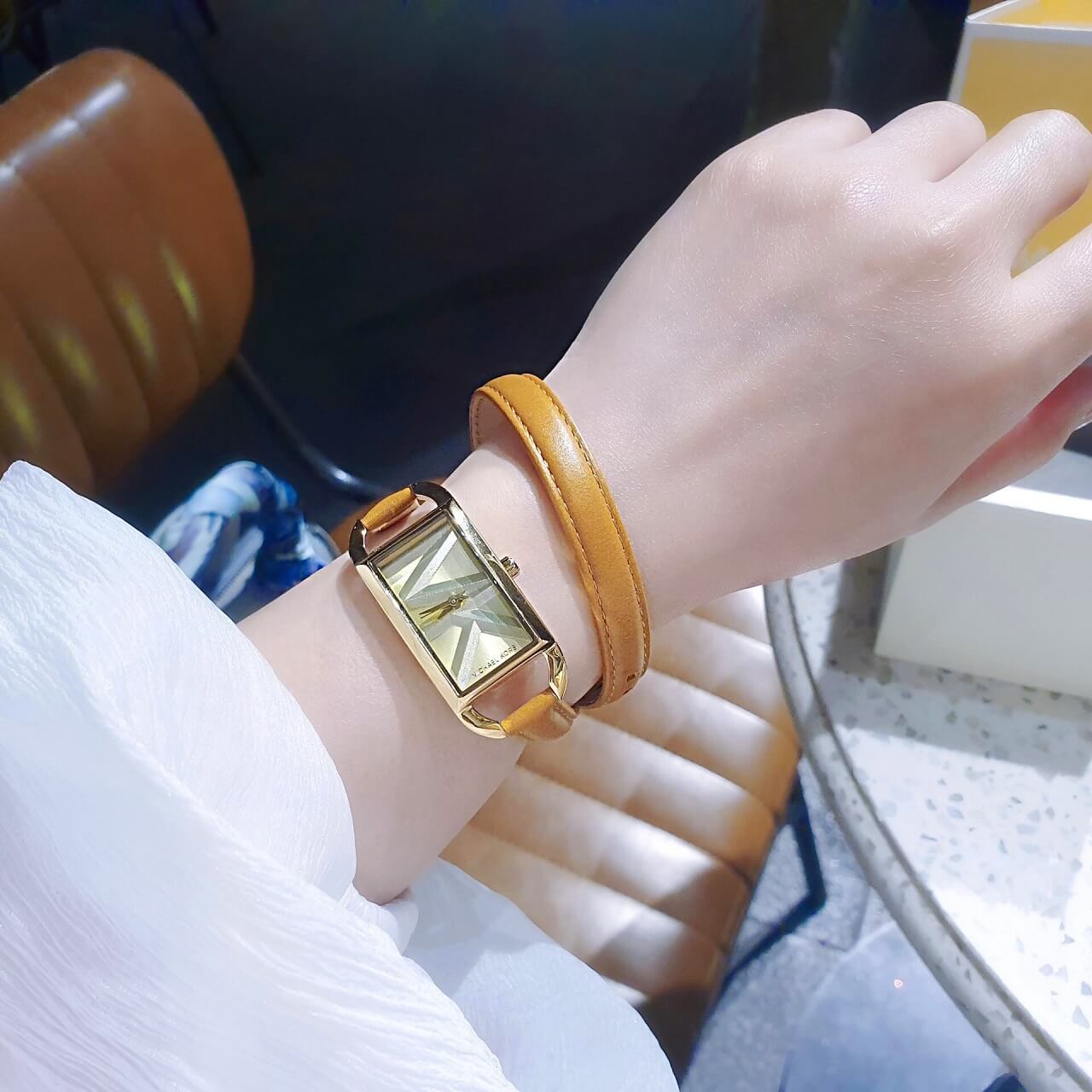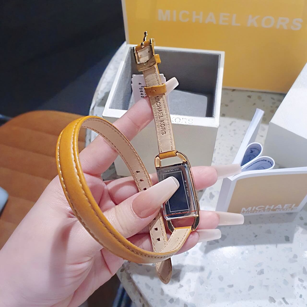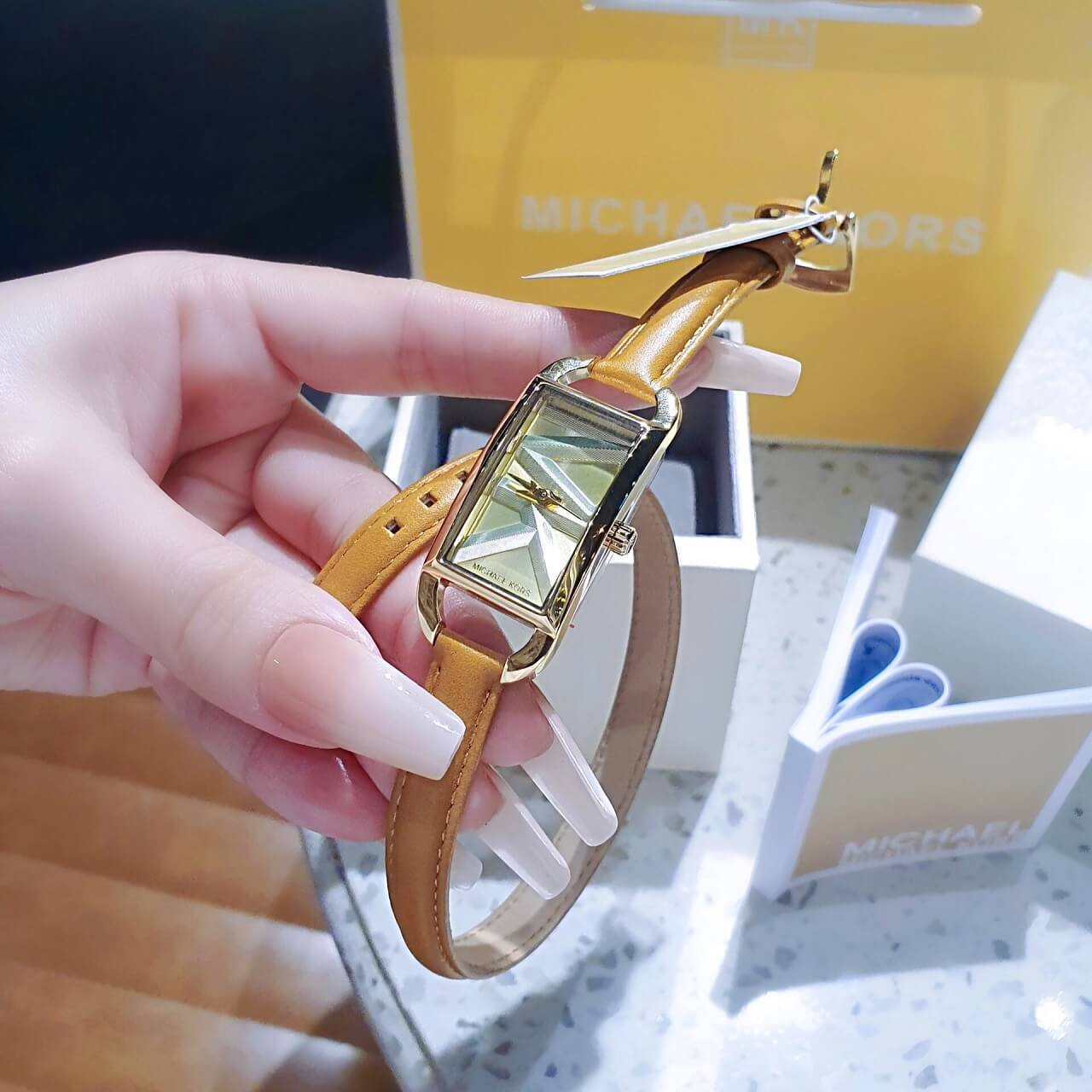 - Dây da dài mềm mại quấn 2 vòng ôm tay độc đáo mà lại dễ thương với mặt số chữ nhật có logo hãng MK lớn trong mặt tạo điểm nhấn cuốn hút