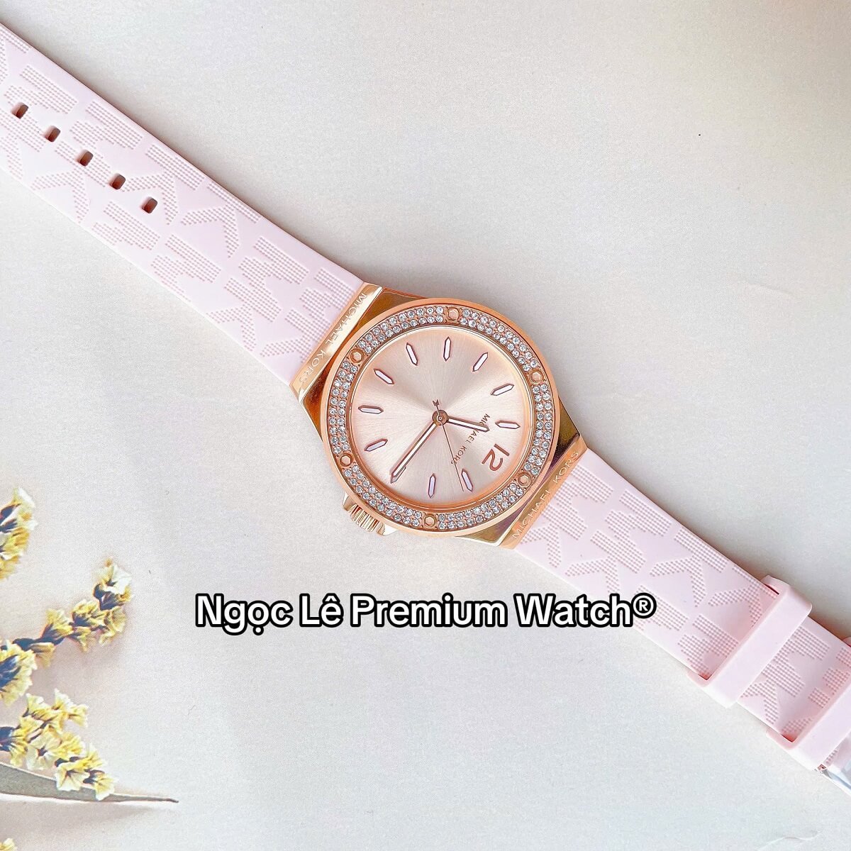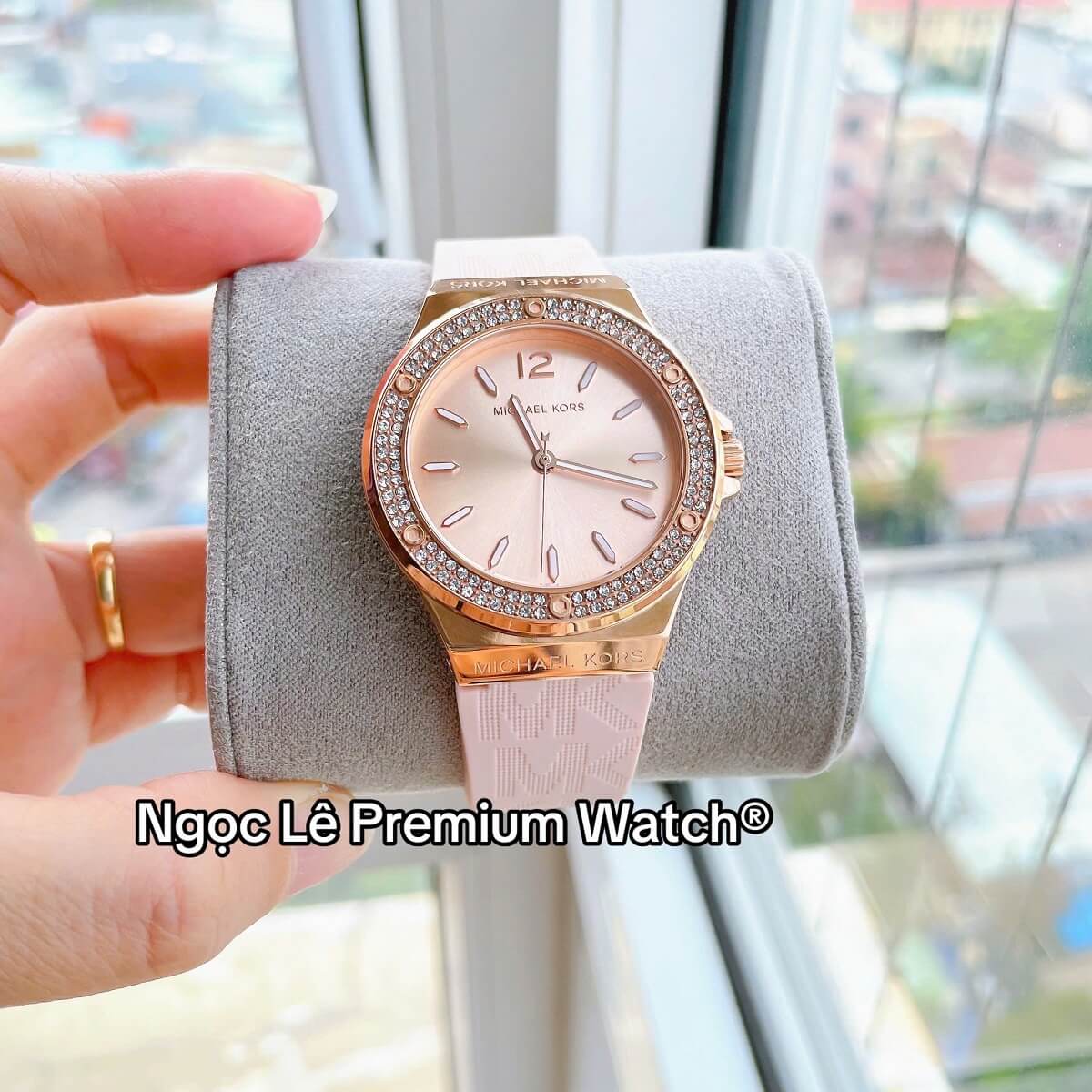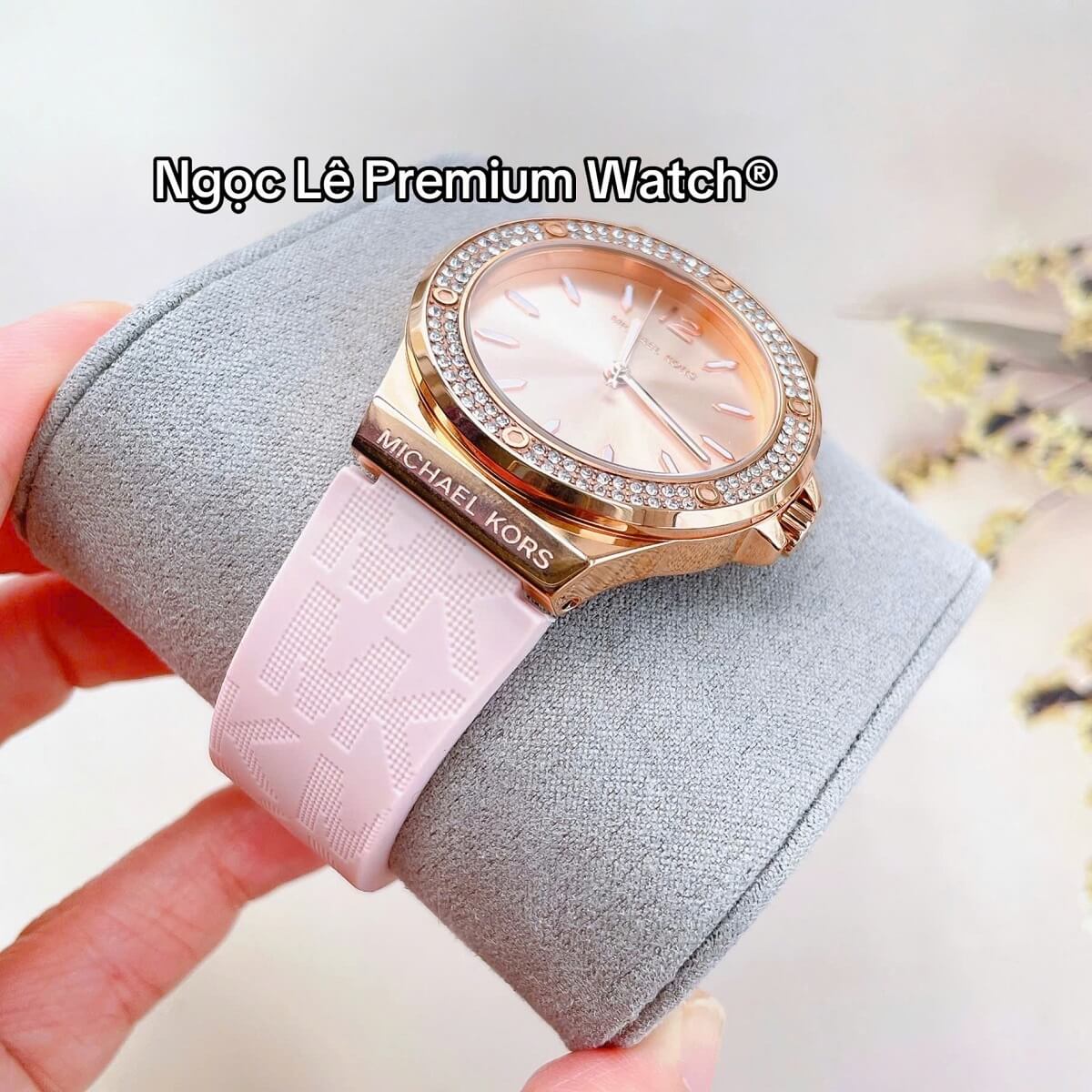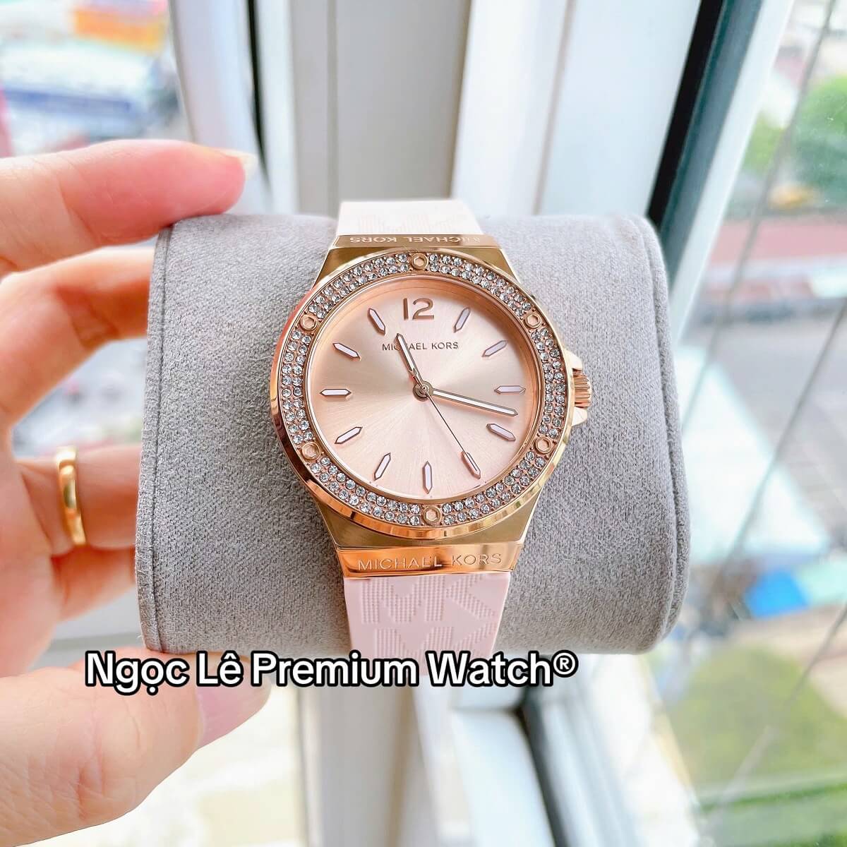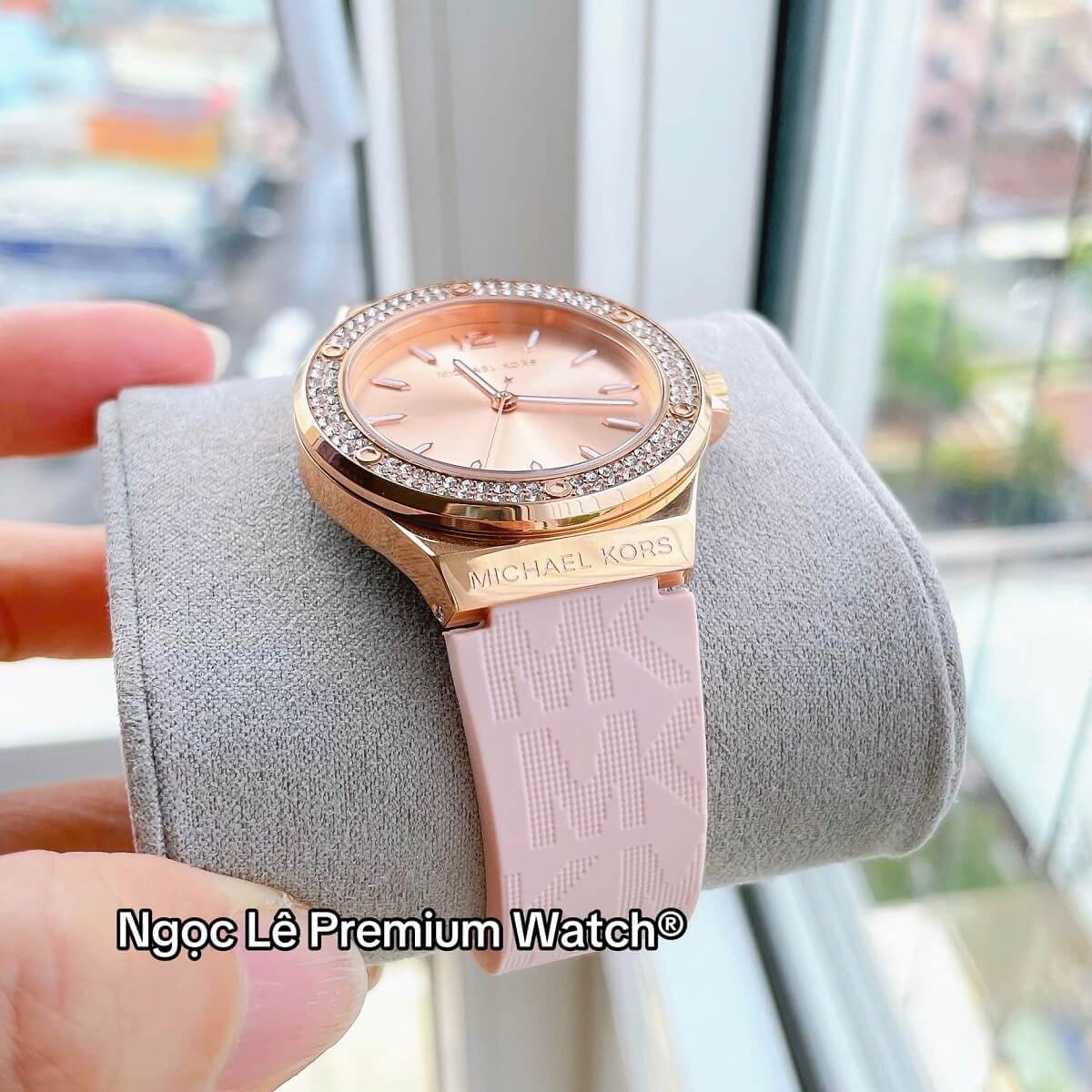 Thay vì dây kim loại hay da truyền thống, MK7282 sử dụng dây cao su màu hồng phấn nhẹ nhàng, mang lại cảm giác trẻ trung, năng động và thoải mái khi đeo trong thời gian dài. Dây cao su không chỉ nhẹ mà còn có khả năng chịu nước tốt, rất phù hợp với các hoạt động thường ngày từ đi làm, dạo phố đến du lịch.