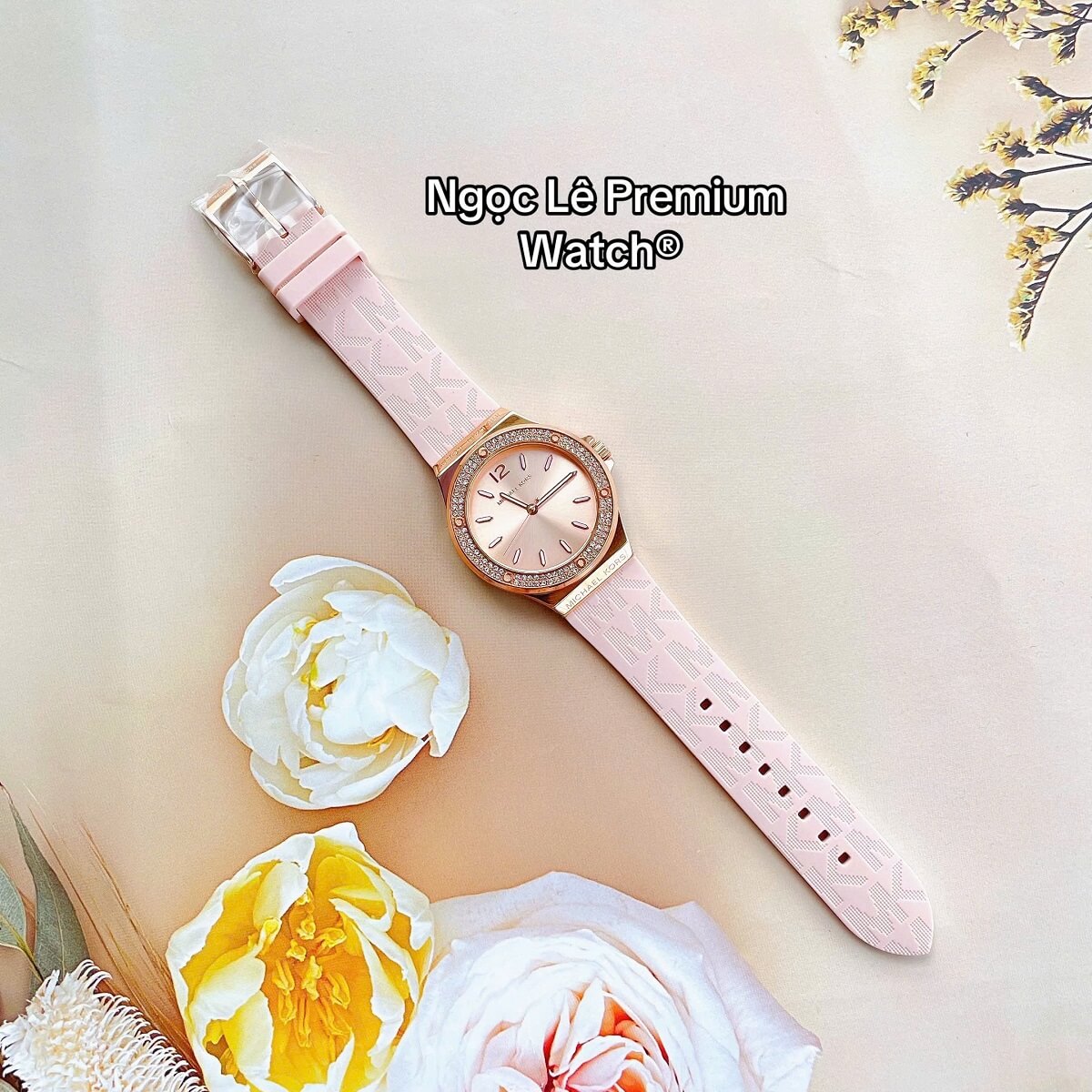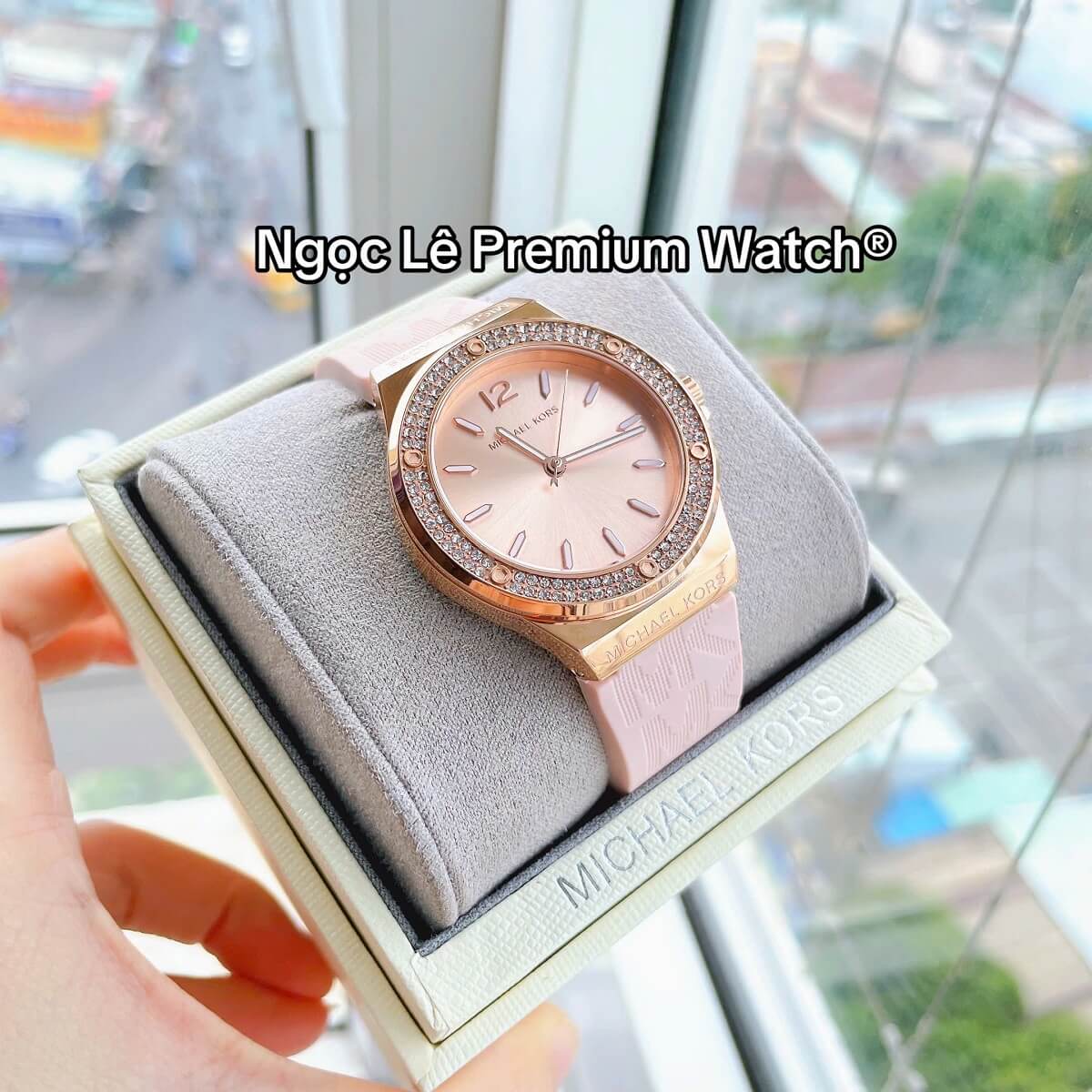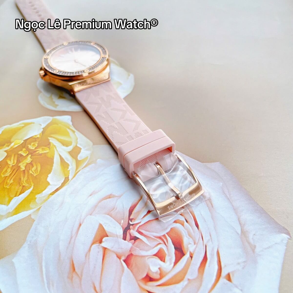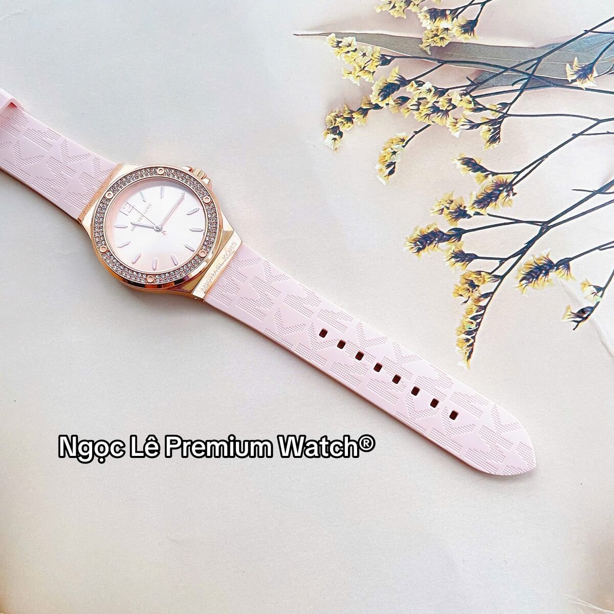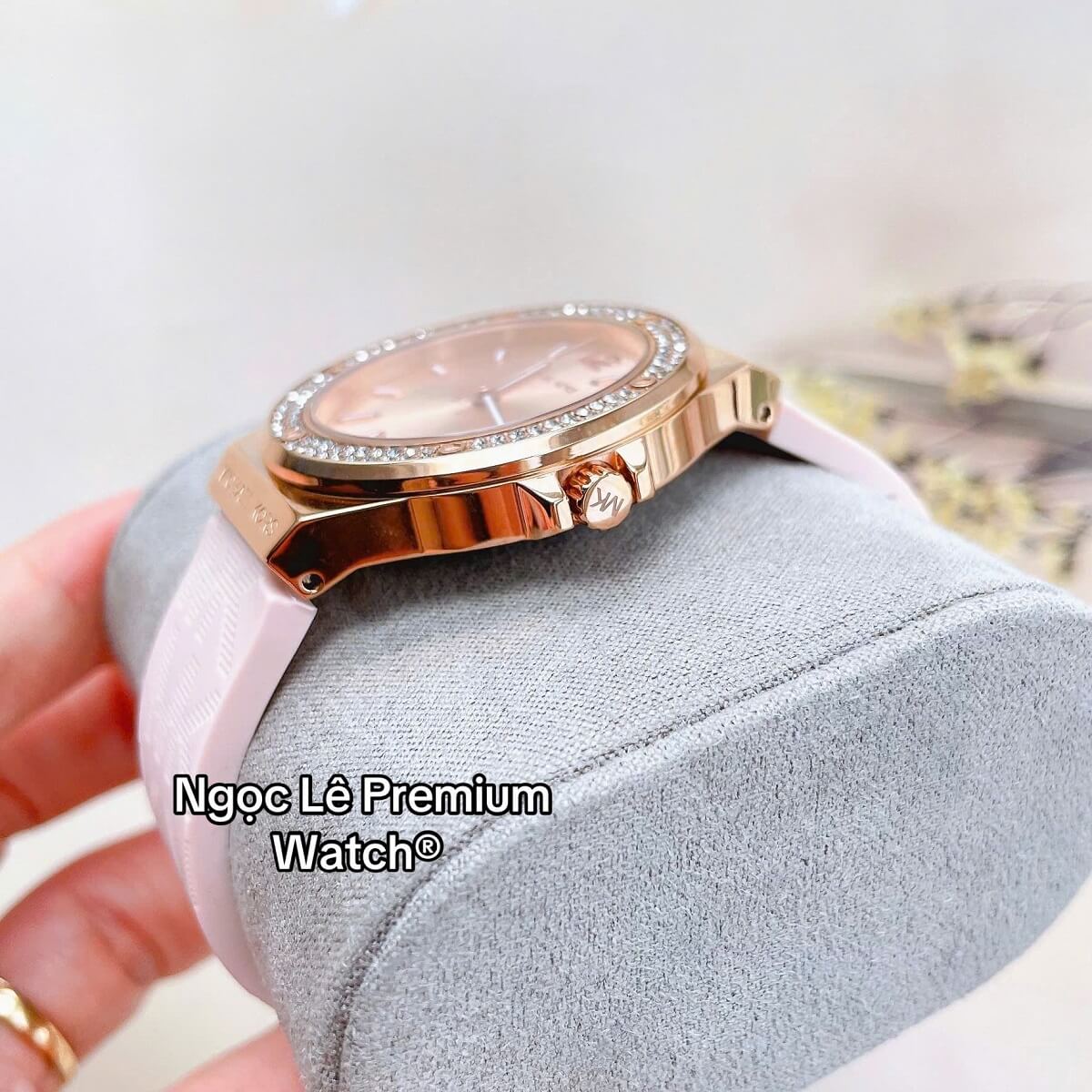 Thay vì dây kim loại hay da truyền thống, MK7282 sử dụng dây cao su màu hồng phấn nhẹ nhàng, mang lại cảm giác trẻ trung, năng động và thoải mái khi đeo trong thời gian dài. Dây cao su không chỉ nhẹ mà còn có khả năng chịu nước tốt, rất phù hợp với các hoạt động thường ngày từ đi làm, dạo phố đến du lịch.