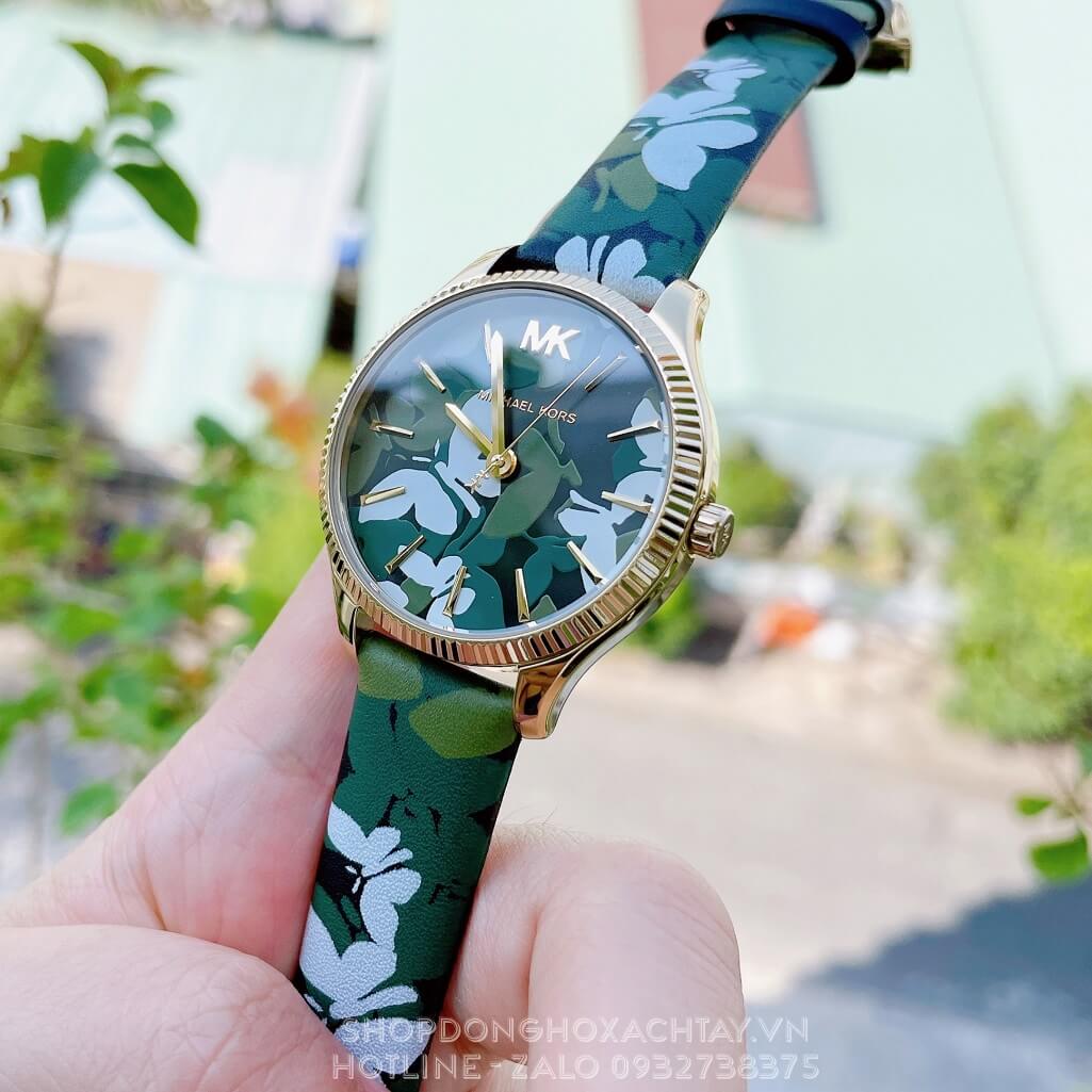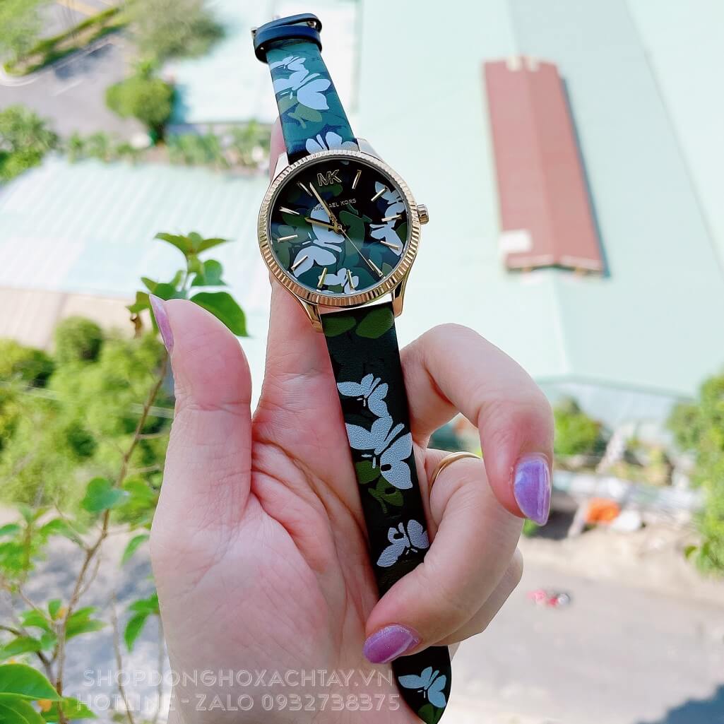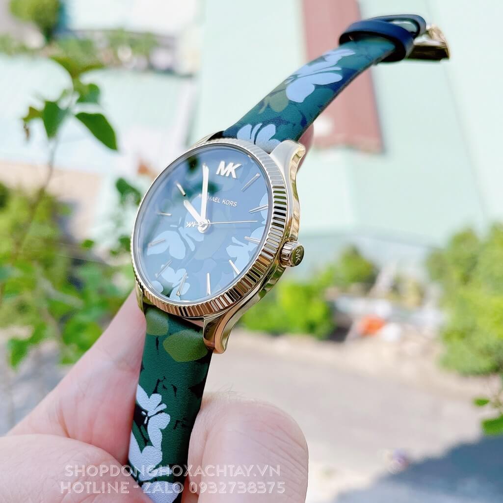 - Đồng hồ nữ Michael Kors MK2811 chính hãng, MK dây da xanh họa tiết hoa lá xinh tươi
