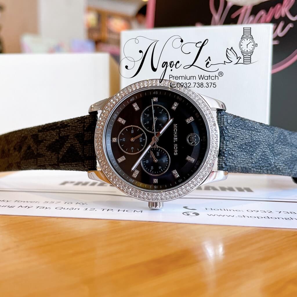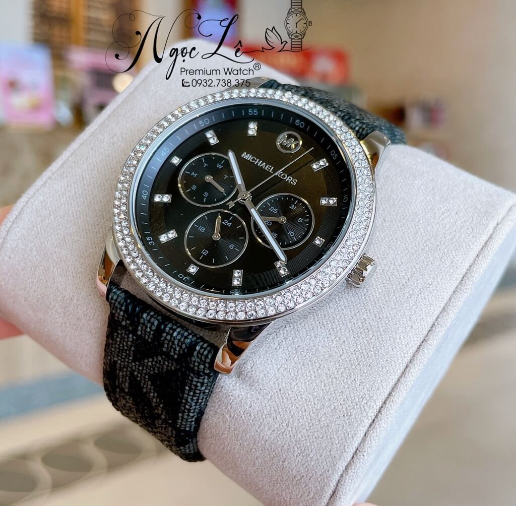 Chất liệu vỏ thép không gỉ bóng loáng với viền đính đá kết hợp mặt số chronograph