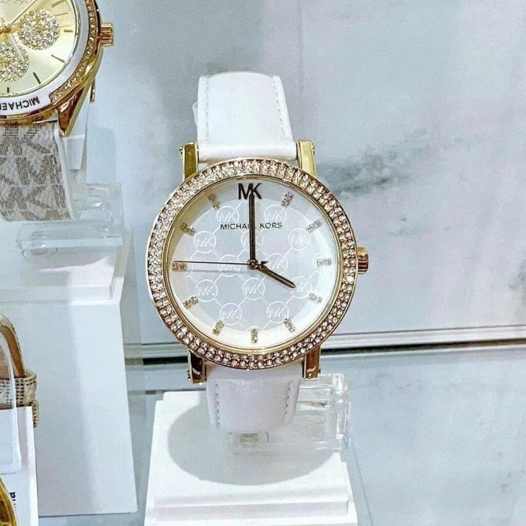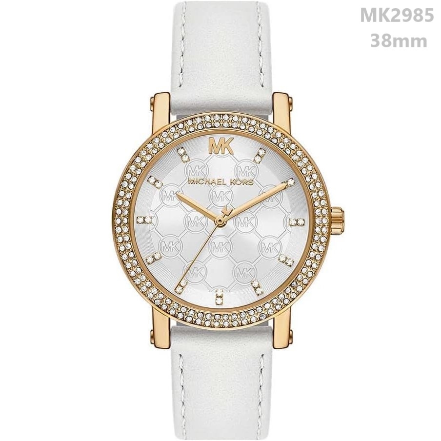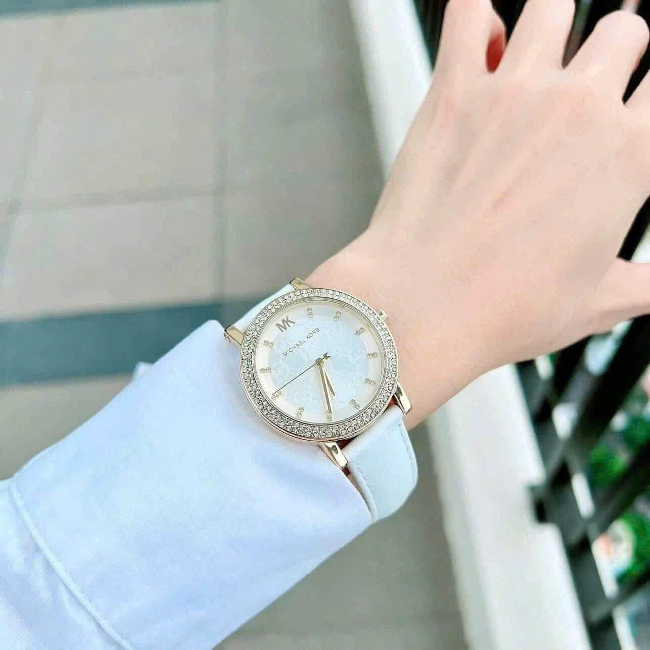 - Đồng Hồ Nữ Michael Kors MK2985 Dây Da Trắng Vỏ Vàng Mặt Đính Đá Size 38mm