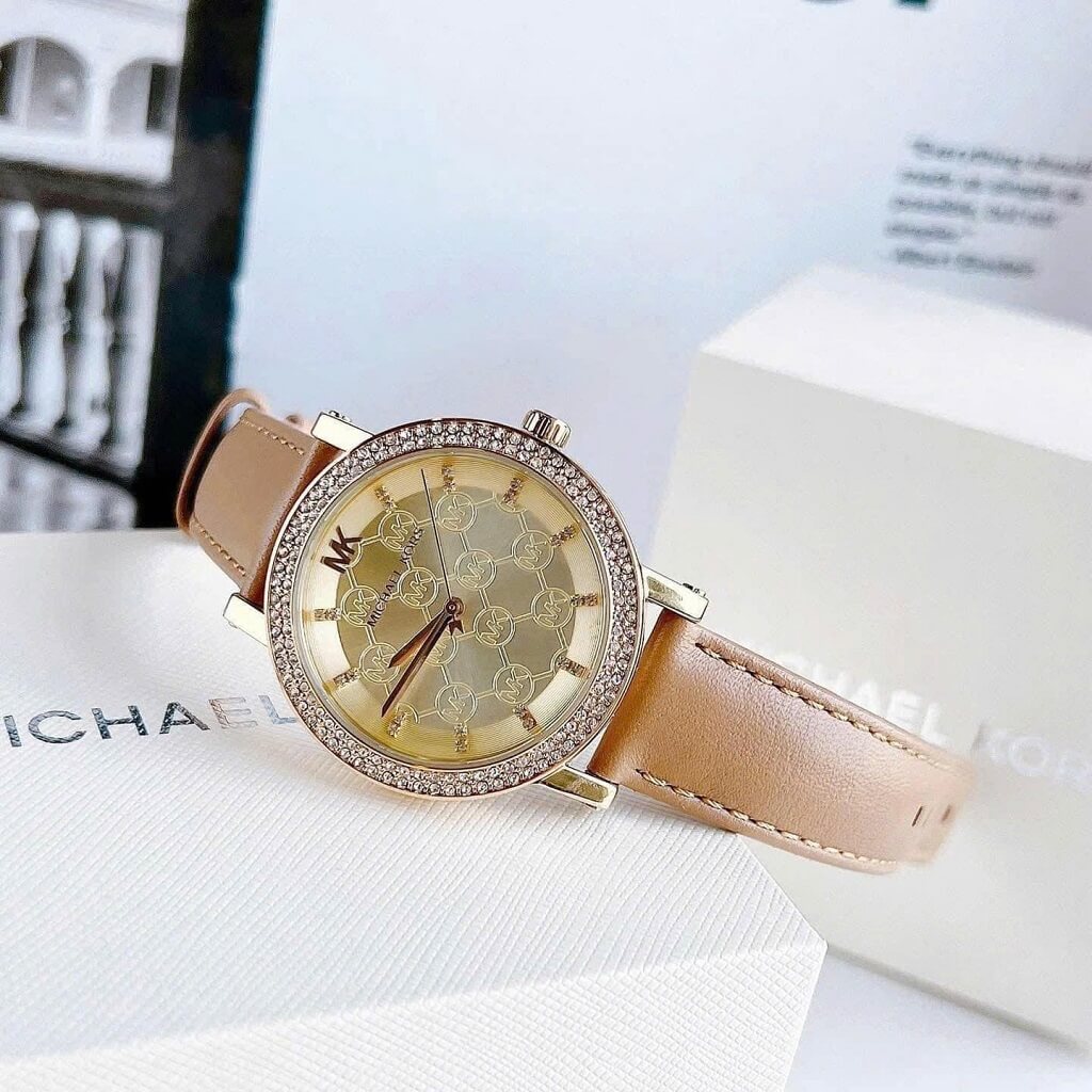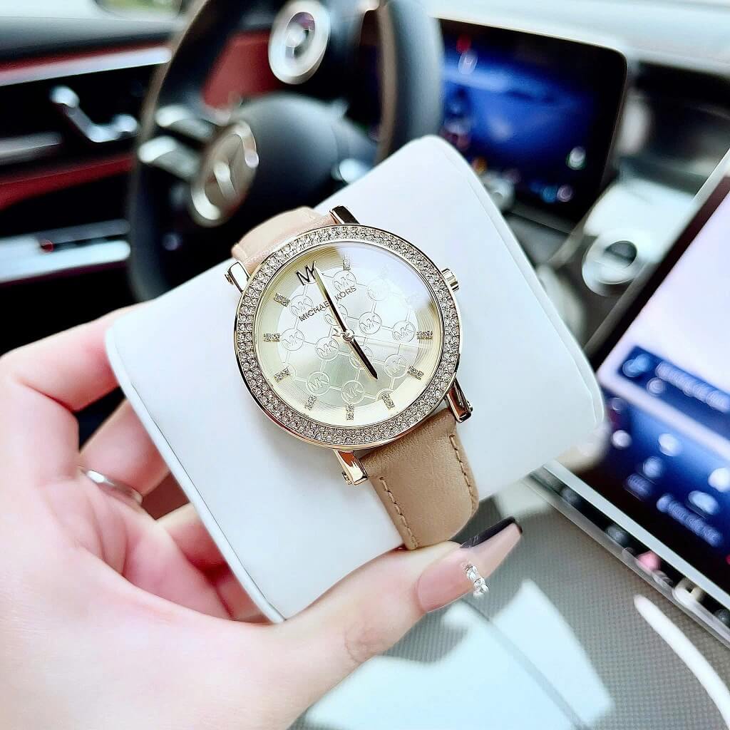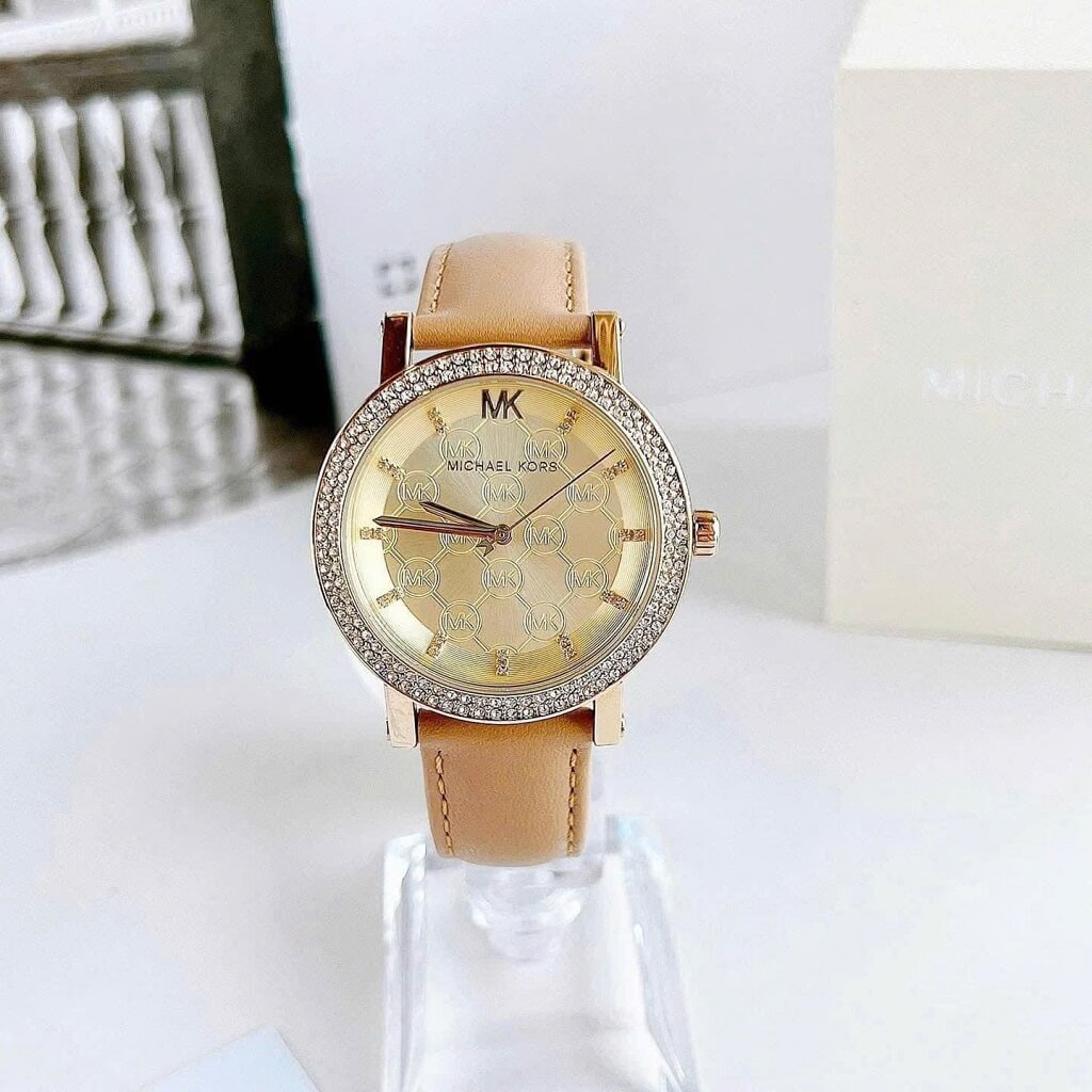 - Đồng Hồ Nữ Michael Kors MK2986 Dây Da Nâu Mặt Vàng Đính Đá Size 38mm