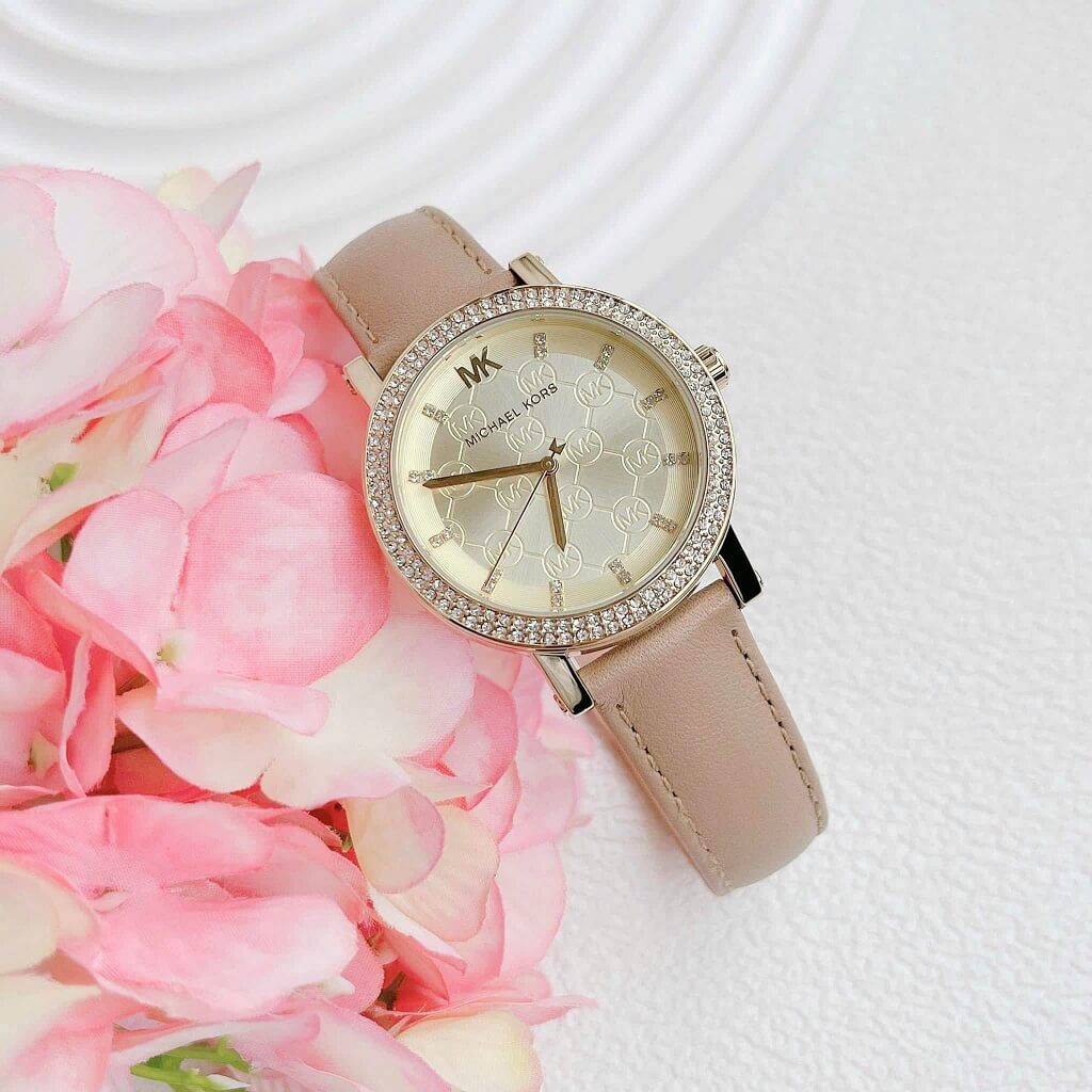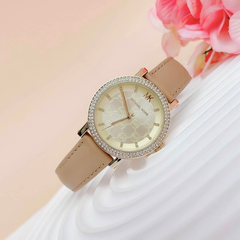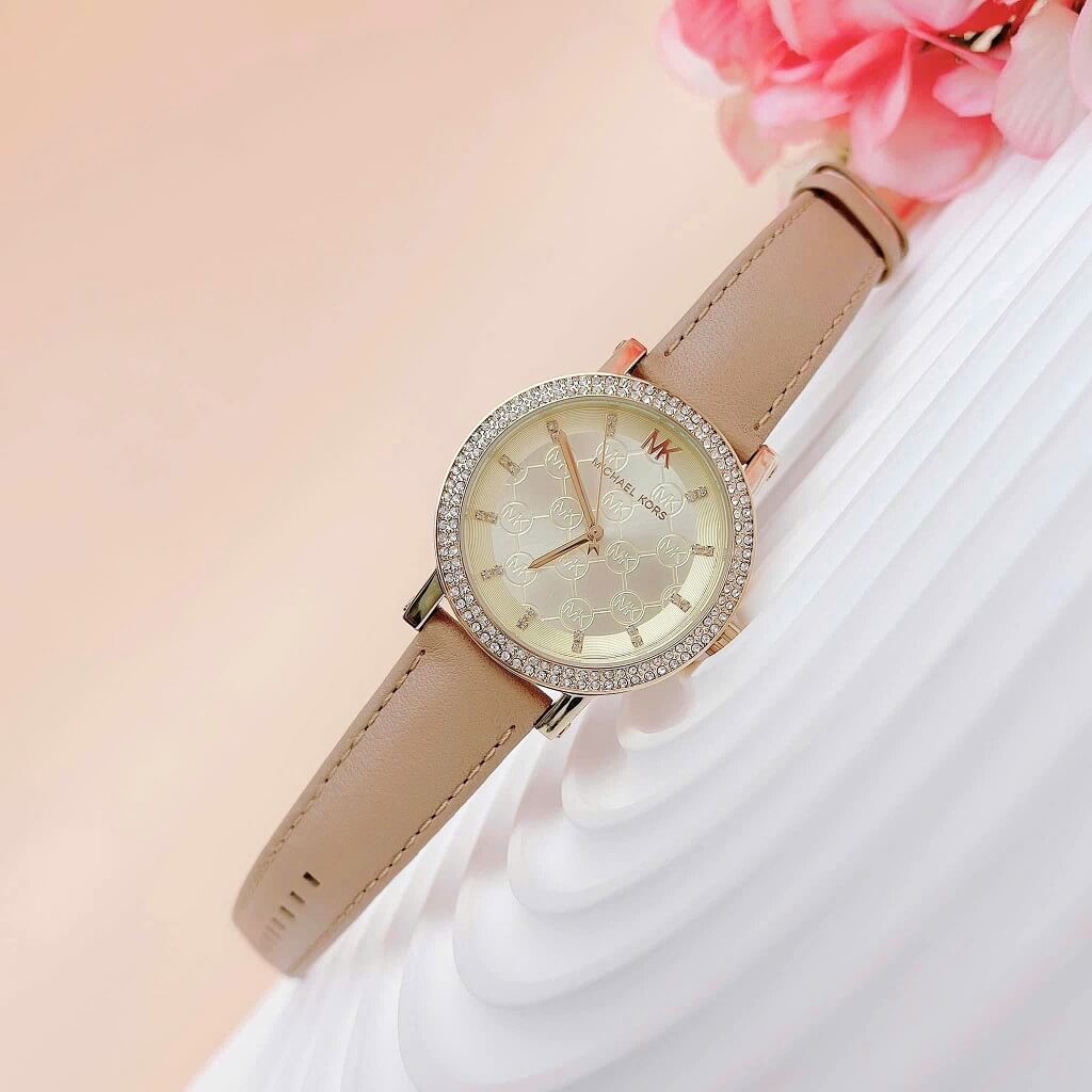 - Đồng Hồ Nữ Michael Kors MK2986 Dây Da Nâu Mặt Vàng Đính Đá Size 38mm