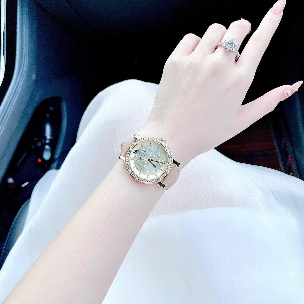 - Mặt đồng hồ màu vàng size 38mm, được đính đá viền rất đẹp mắt, bên trong mặt được nhấn Logo MK nổi bật, đặc trưng của hãng