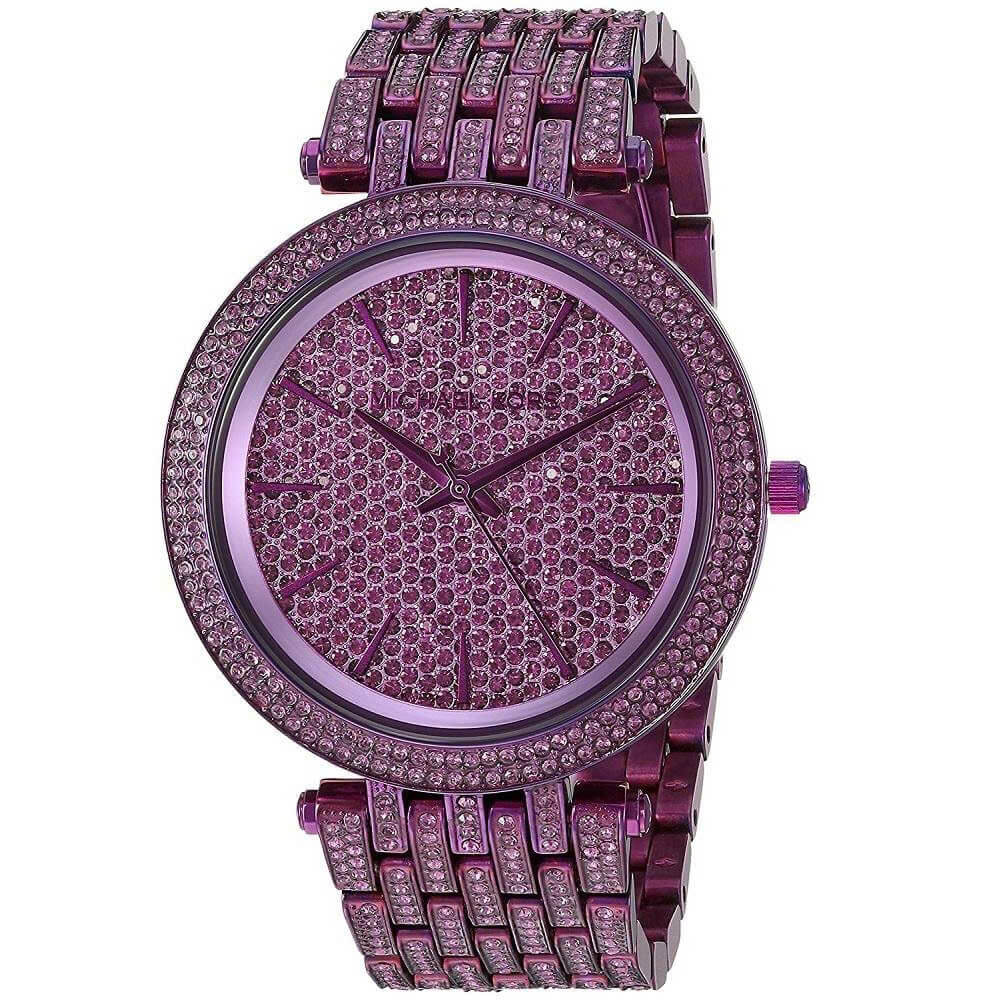 - Đồng hồ nữ Michael Kors MK3782 màu tím, toàn bộ mặt đồng hồ và dây được đính đá sang trọng