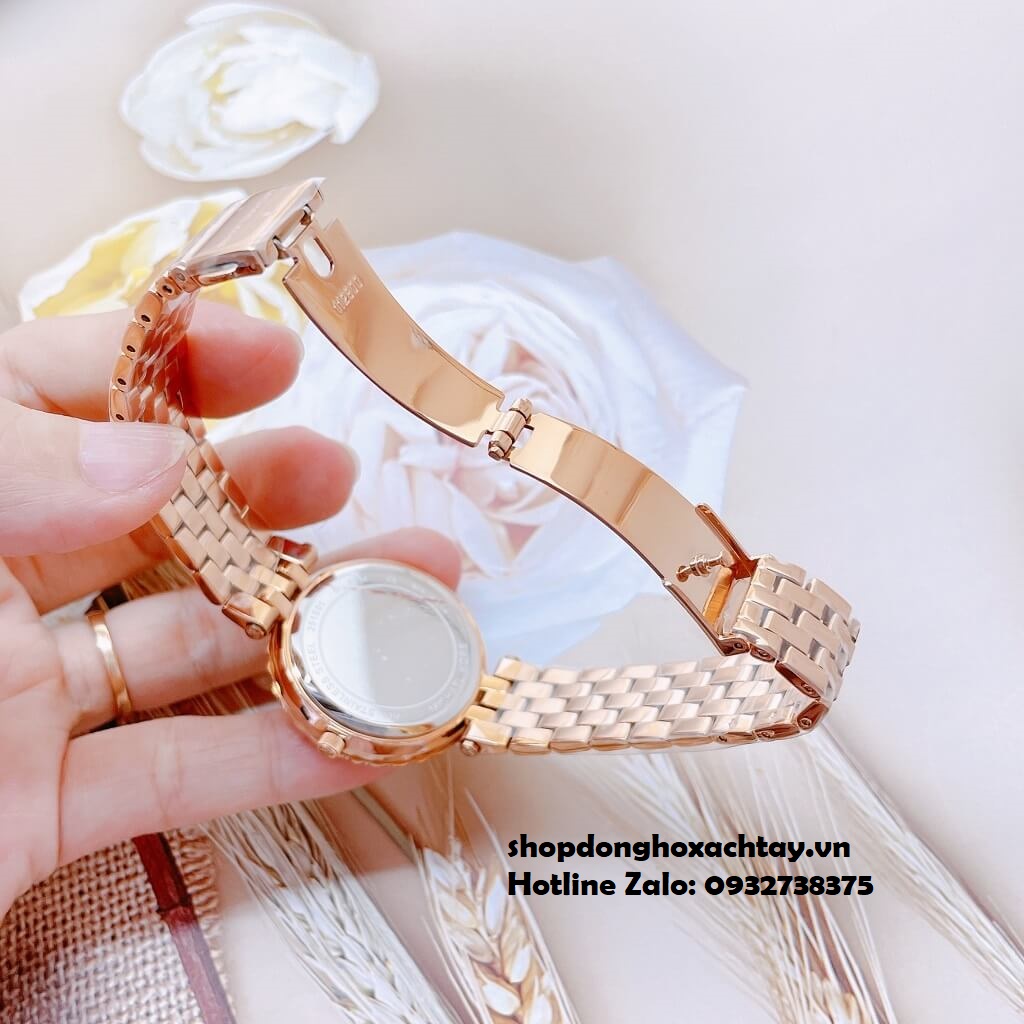 - Dây inox rose gold viền đính đá lấp lánh, máy Pin Quartz Japan bền bỉ