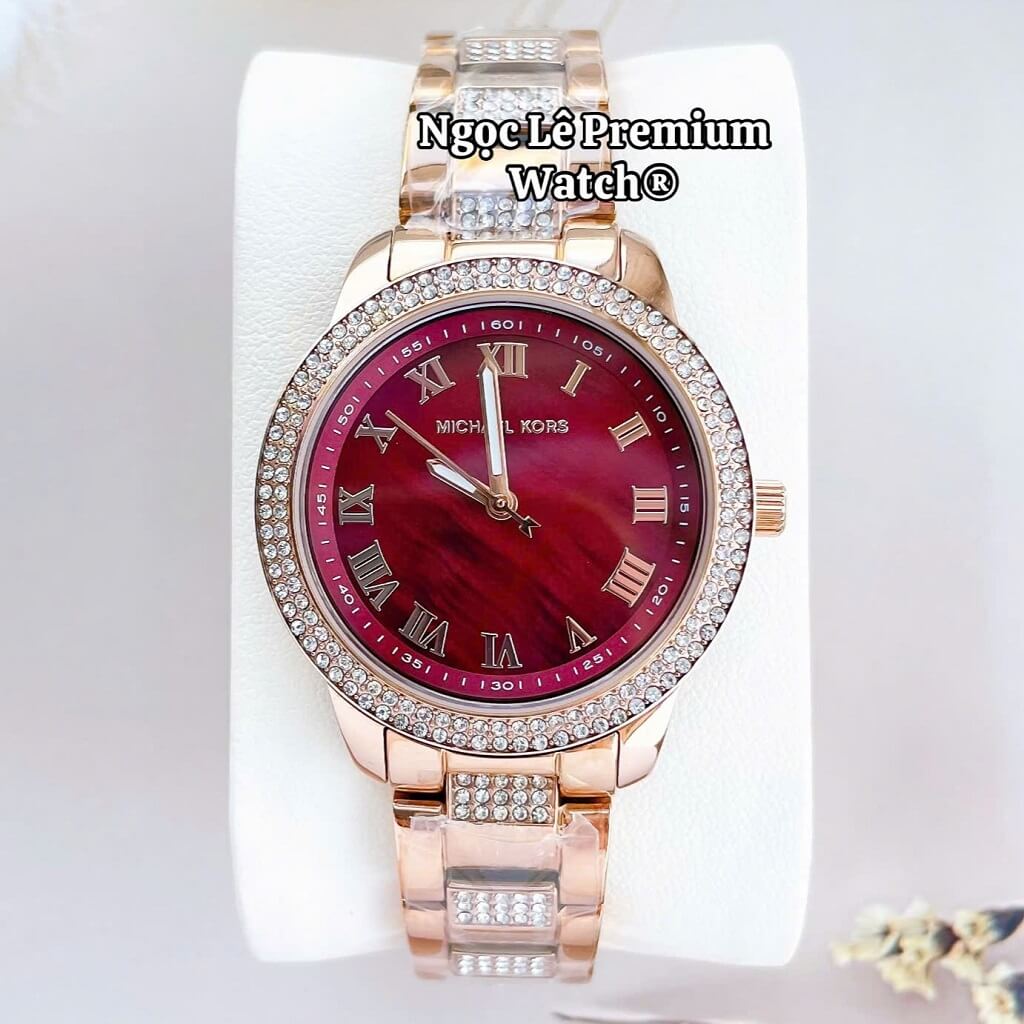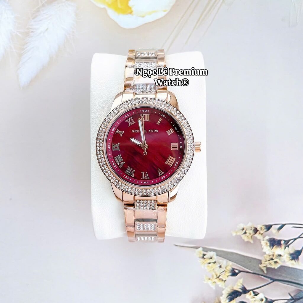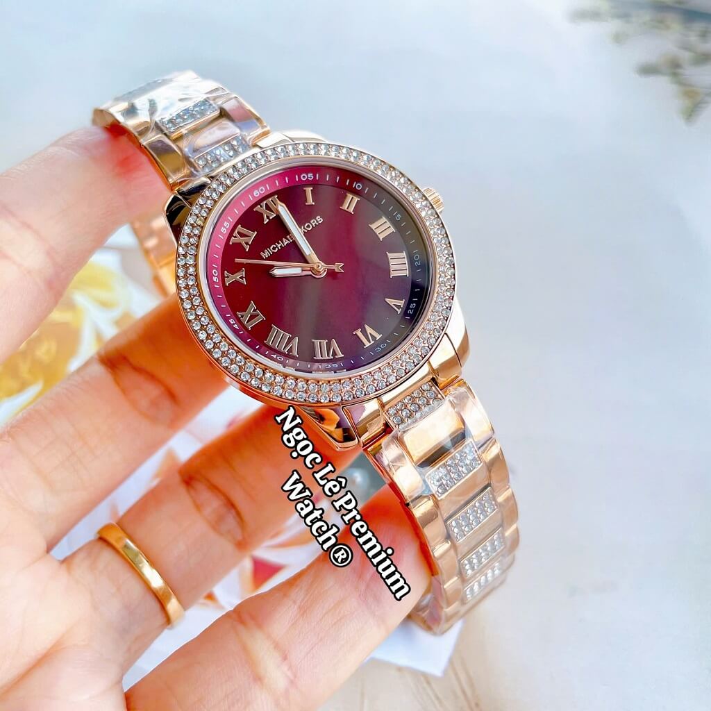 Đồng Hồ Nữ Michael Kors MK4685 Mặt Đỏ Xà Cừ Dây Kim Loại Vàng Rose Đính Đá Size 34mm