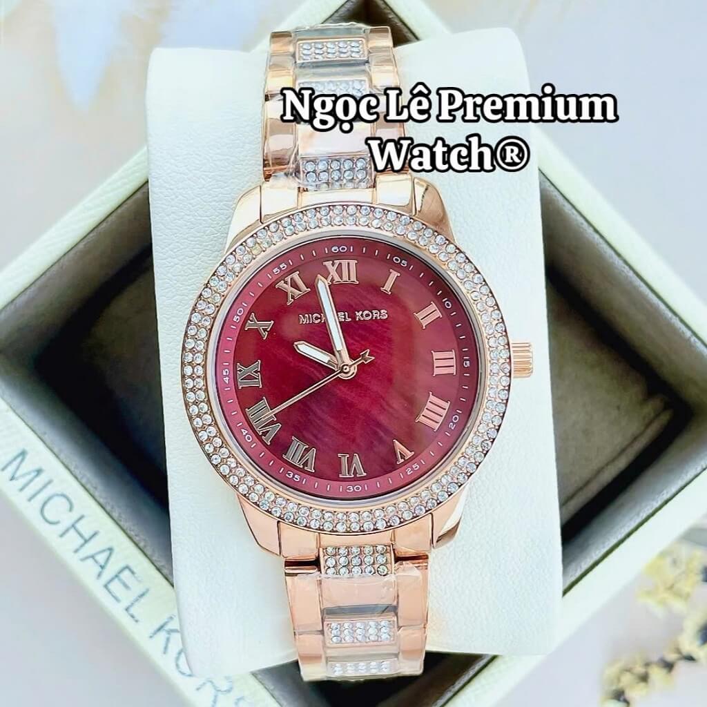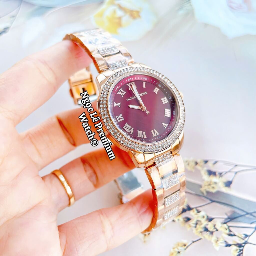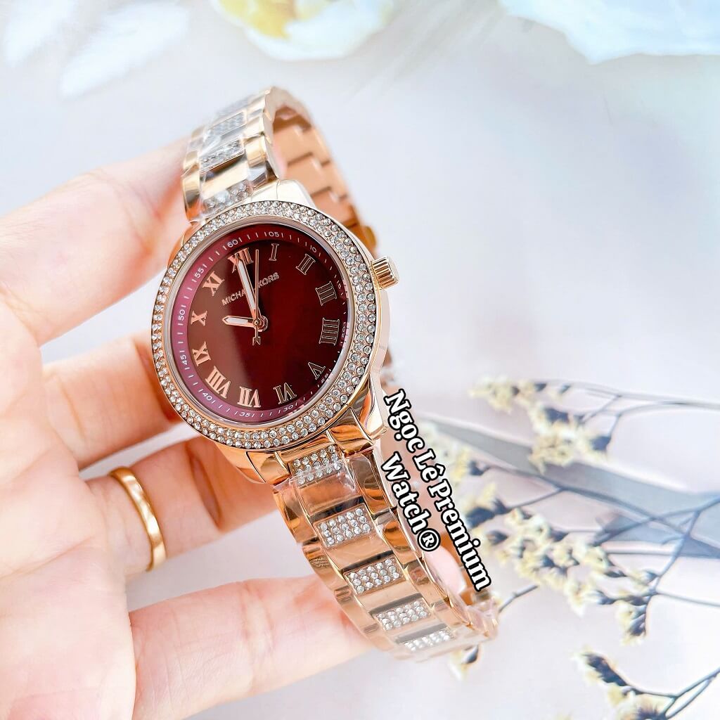 Đồng Hồ Nữ Michael Kors MK4685 Mặt Đỏ Xà Cừ Dây Kim Loại Vàng Rose Đính Đá Size 34mm