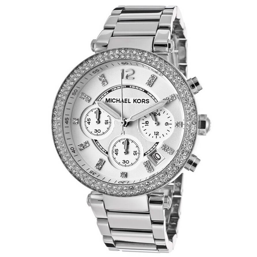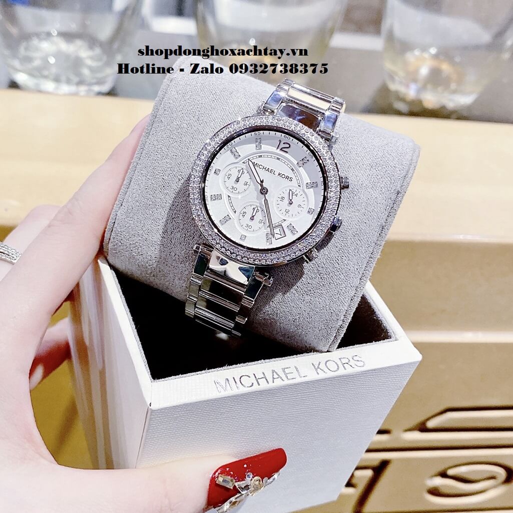 - Dòng MK Paker 6 kim cá tính, viền đá Swarovski lấp lánh, màu bạc sáng bóng