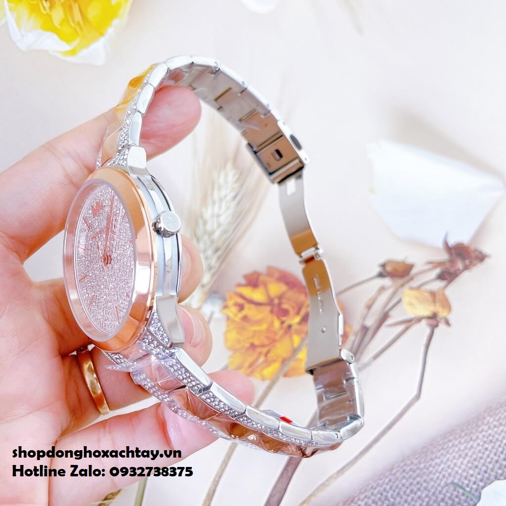 - Dây inox demi rose gold đính đá lấp lánh, kiểu dây sống lưng độc đáo, máy Pin Quartz Japan bền bỉ