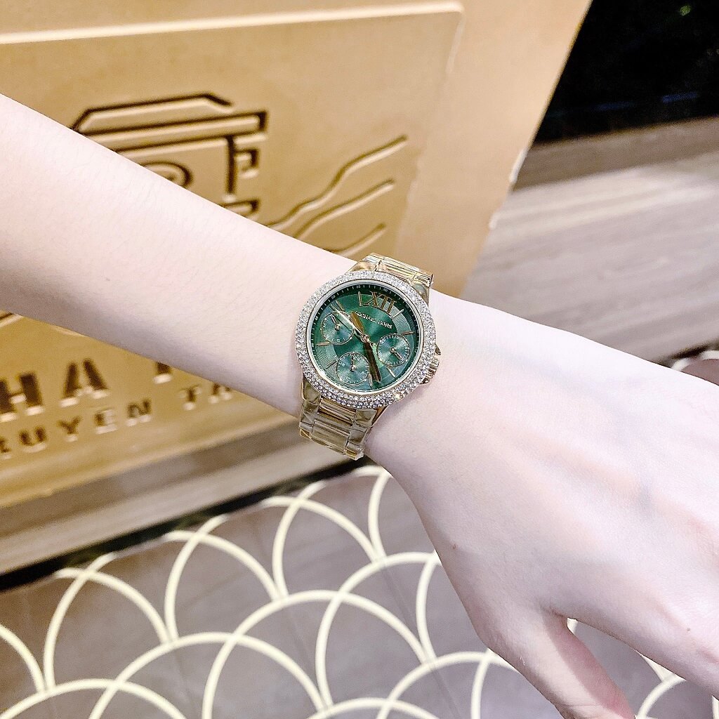 Chất liệu vỏ thép không gỉ bóng loáng với viền đính đá lấp lánh, mặt xanh lá chạy 6 kim