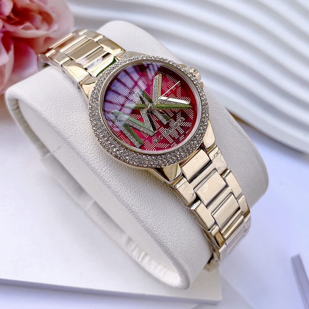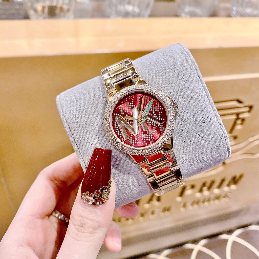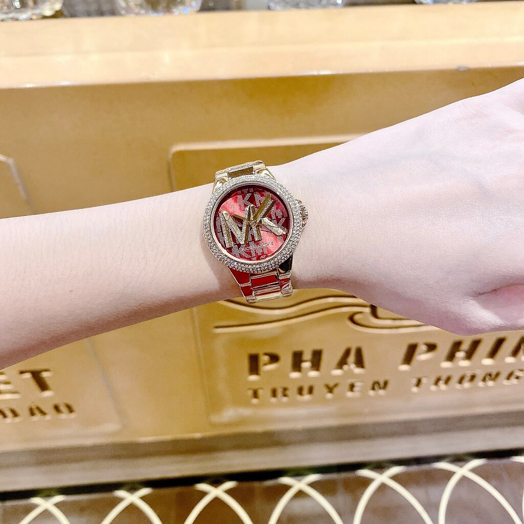 Mặt đồng hồ: Mặt đồng hồ màu đỏ nổi bật với thiết kế đơn giản nhưng đầy cuốn hút. Điểm nhấn trên mặt đồng hồ là chữ "MK" (viết tắt của Michael Kors), tạo nên sự đặc biệt và độc đáo cho mẫu đồng hồ này.