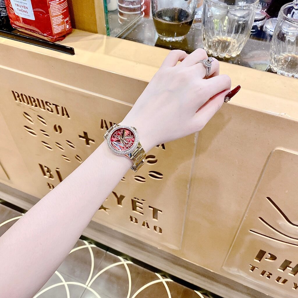 Dây đeo: Dây kim loại màu vàng gold, mang lại sự chắc chắn và vẻ ngoài tinh tế, kết hợp hoàn hảo với màu sắc sang trọng của mặt đồng hồ.