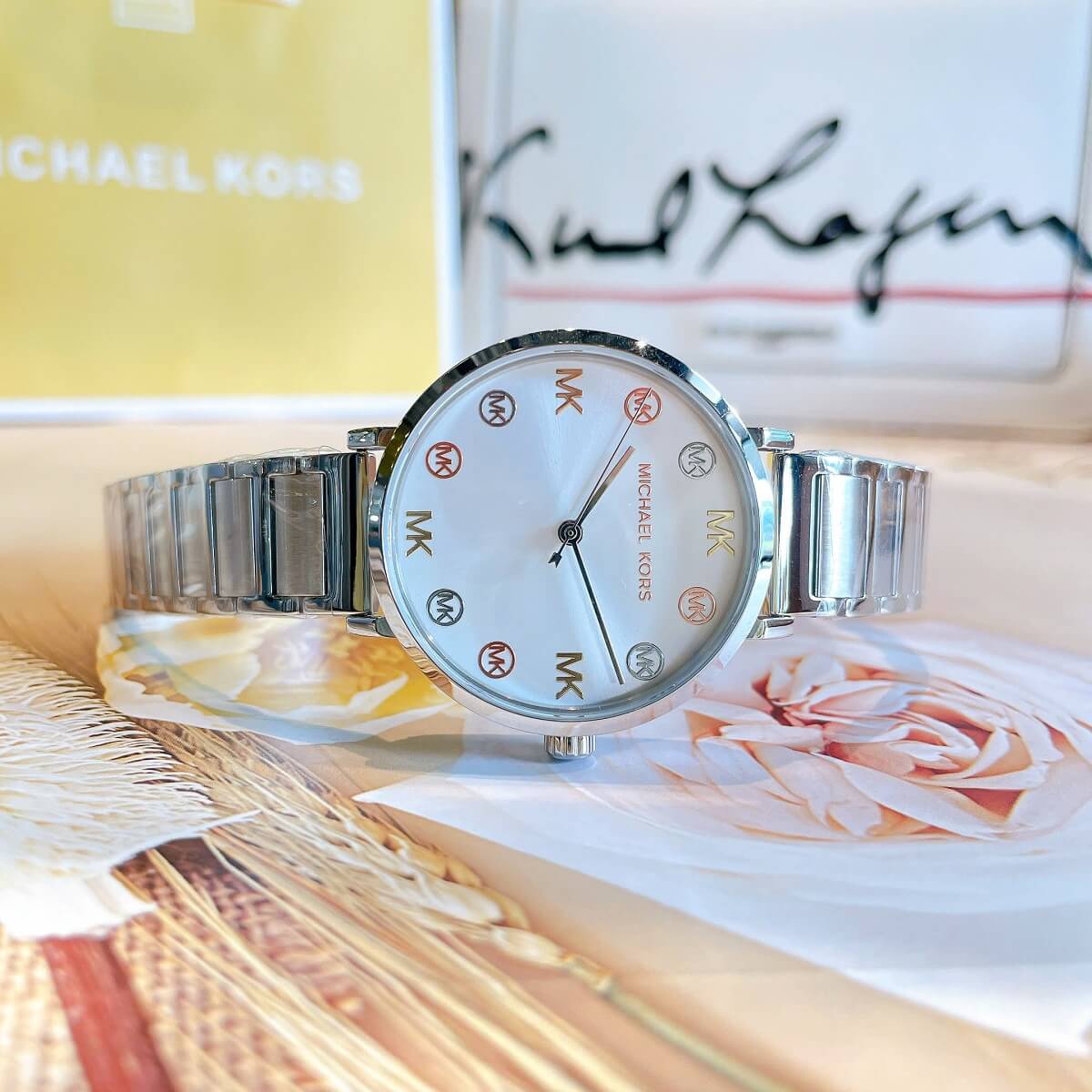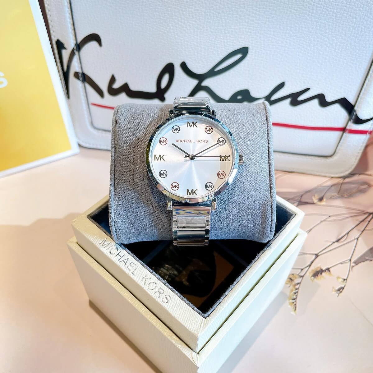 Mặt số được thiết kế theo phong cách tối giản, với nền trắng thanh lịch, kim và cọc số mảnh mai, tinh tế. Logo Michael Kors nổi bật ở vị trí 12 giờ, cùng với những đường nét mảnh gọn tạo cảm giác sang trọng, hiện đại, phù hợp cả khi đi làm lẫn khi đi tiệc.