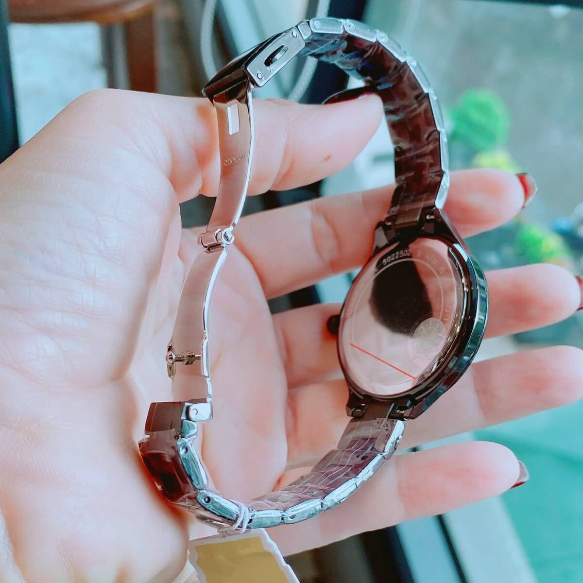 Vỏ & dây: Thép không gỉ màu đen ánh bạc, viền đính đá pha lê cao cấp