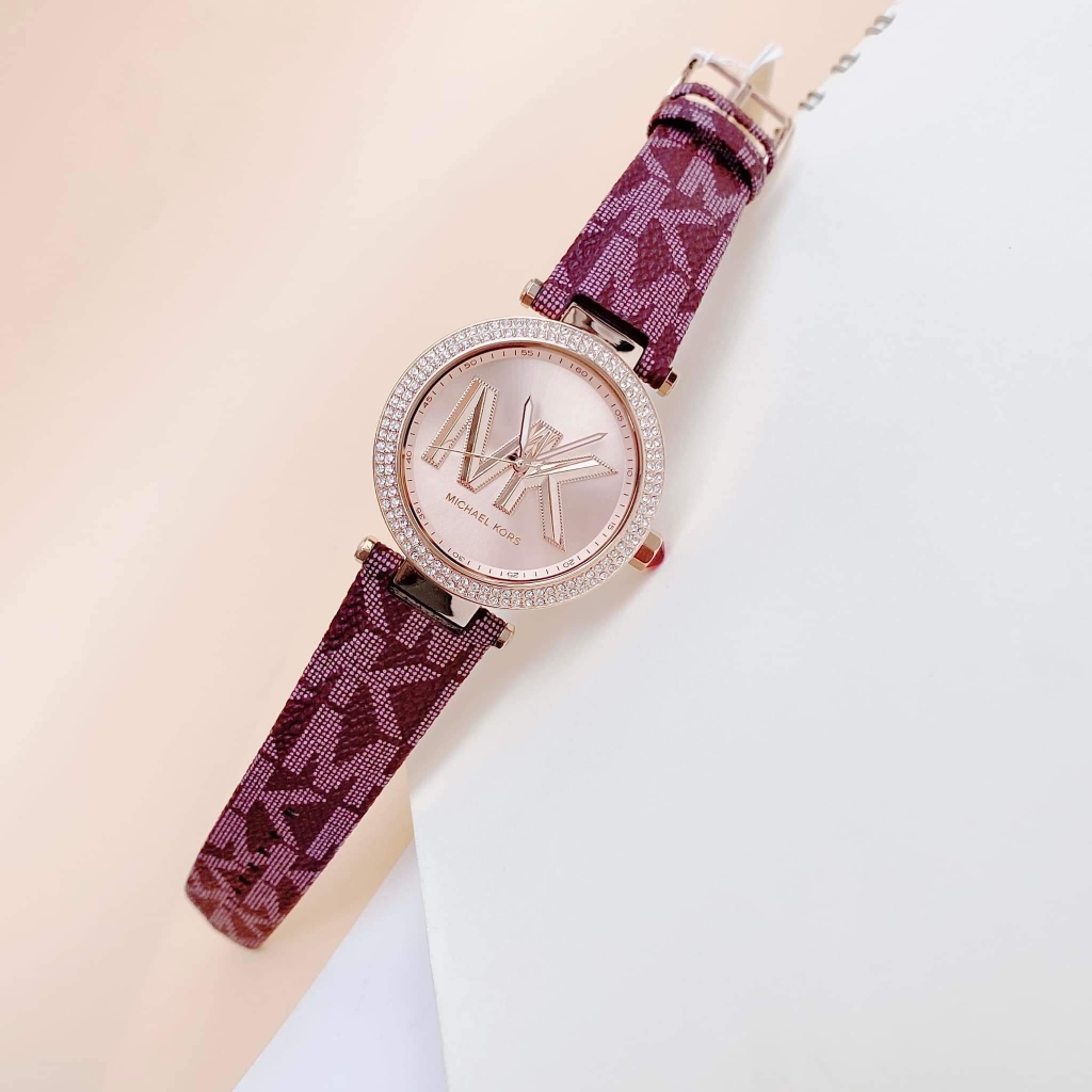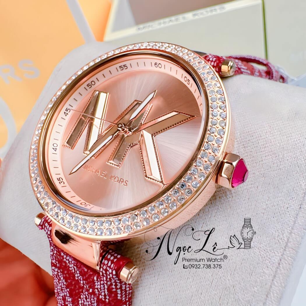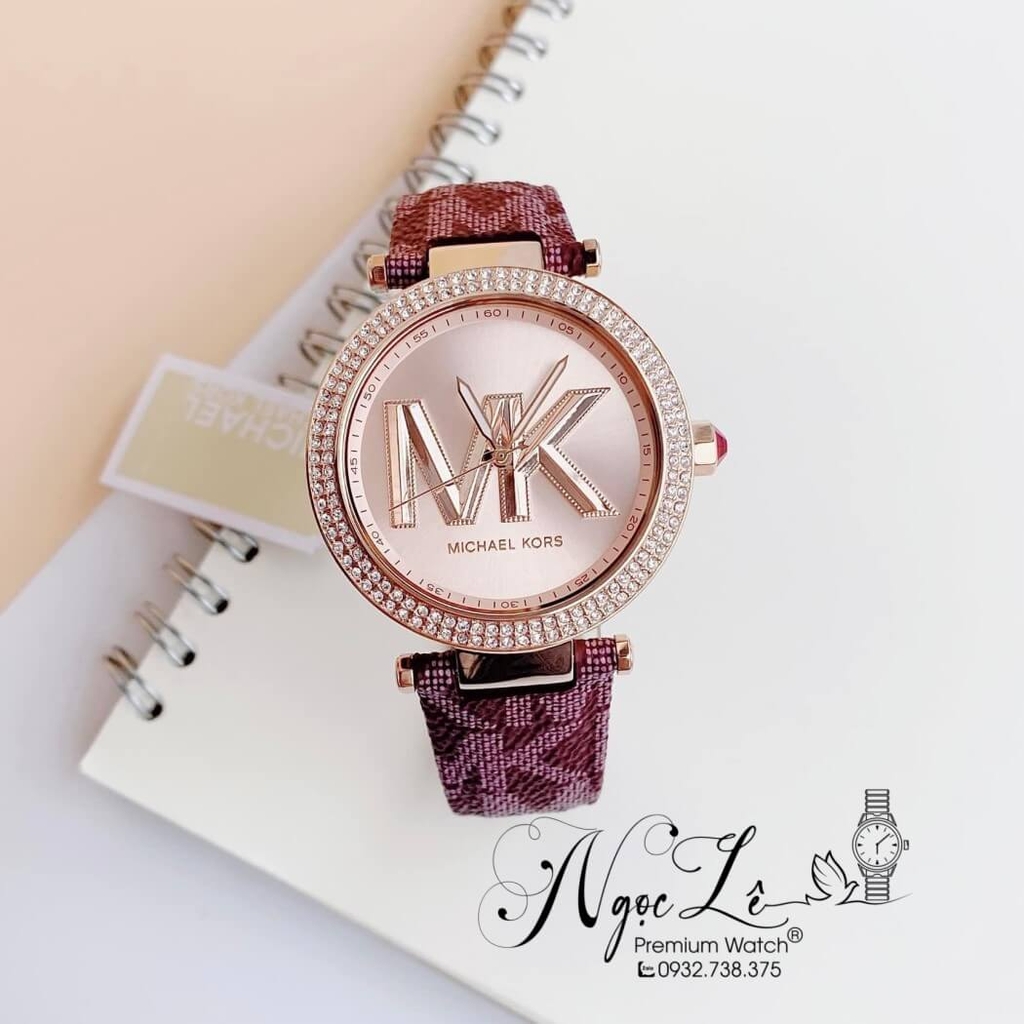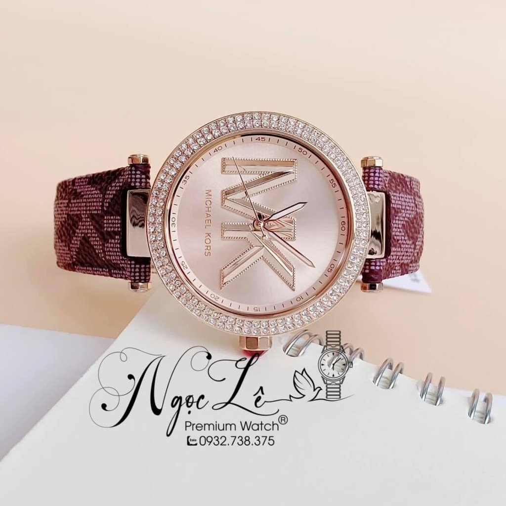 - Đồng hồ Michael Kors Parker MK2974 chính hãng nữ dây da đỏ rượu vang vỏ màu rose, mặt đồng hồ đính đá viền sáng và nổi bật