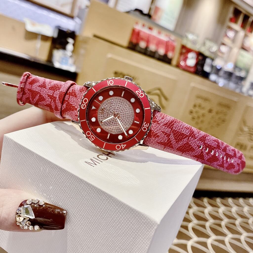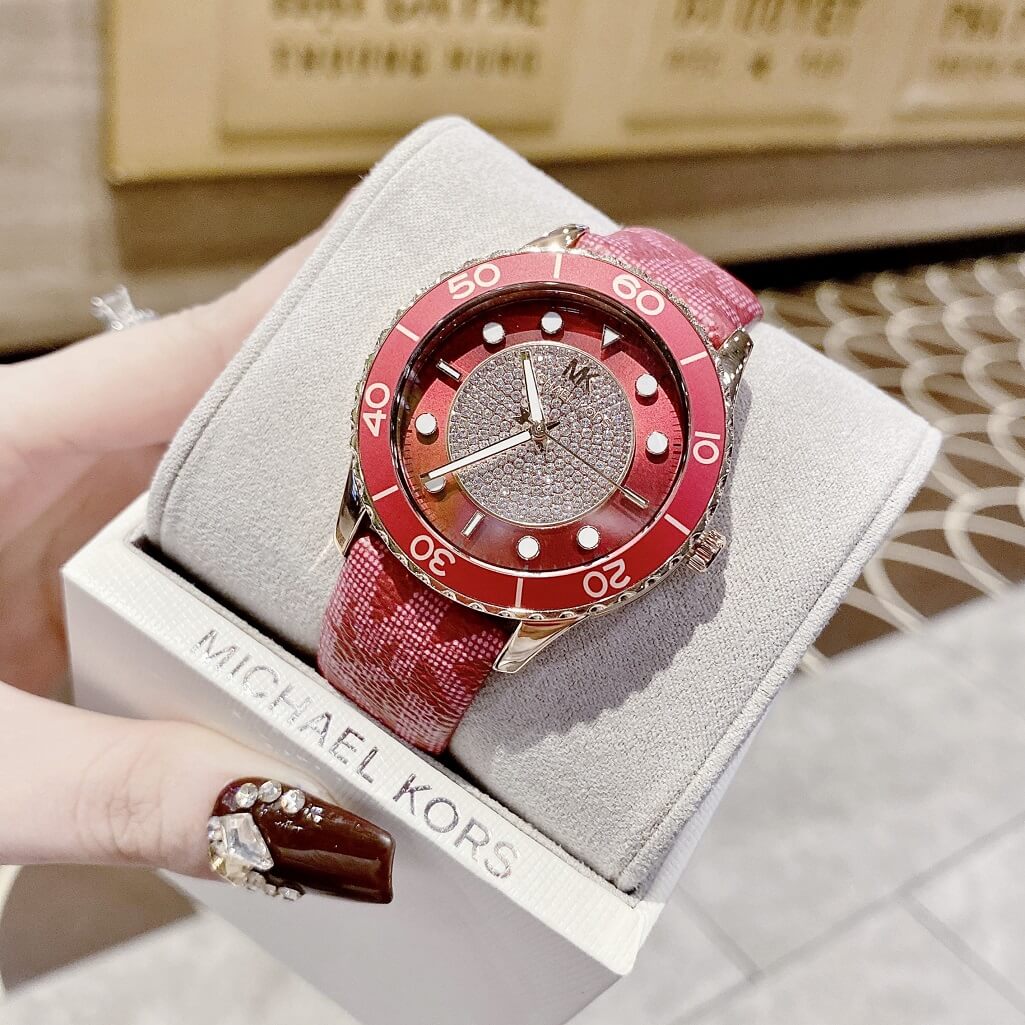 Dòng sản phẩm MK dây da dáng to của hãng, mặt đồng hồ được đính full đá Swarovski nổi bật