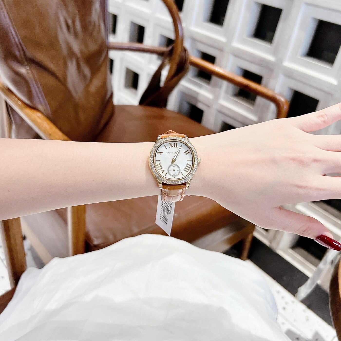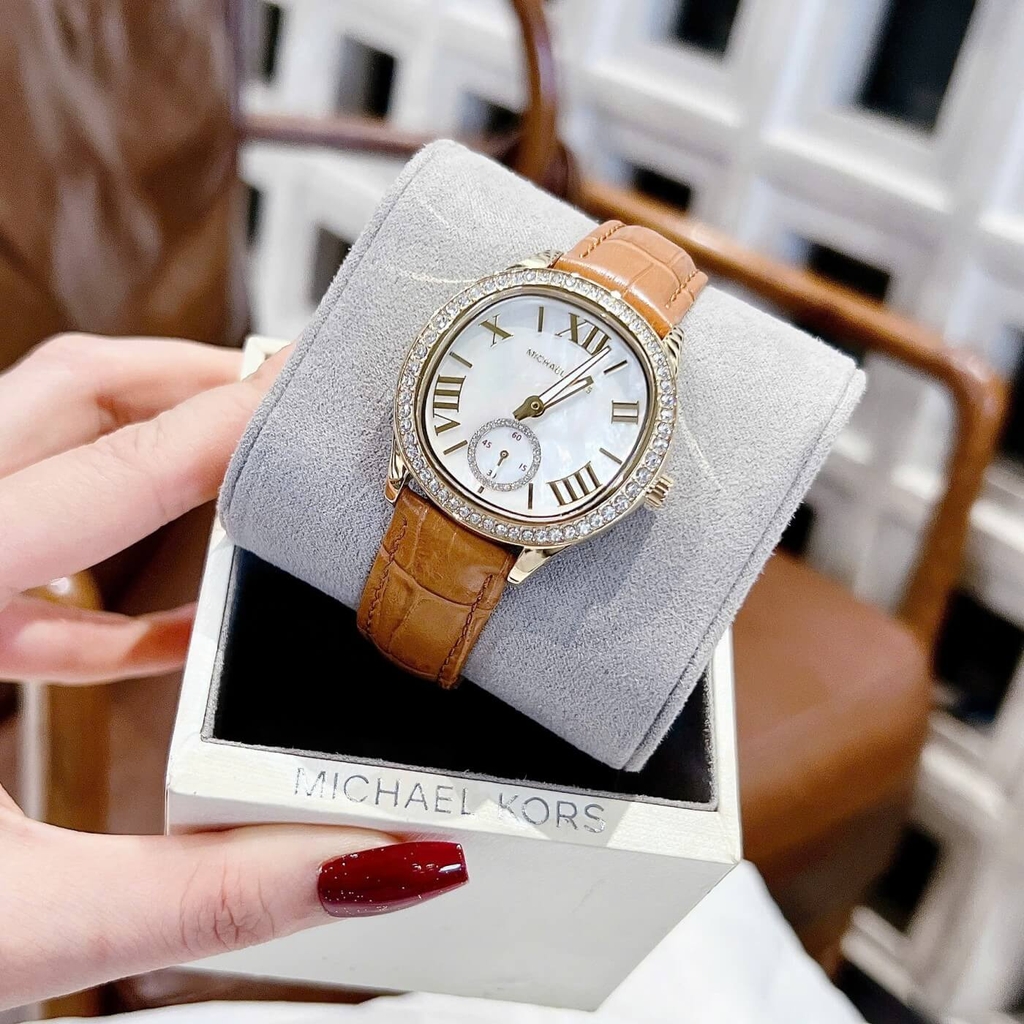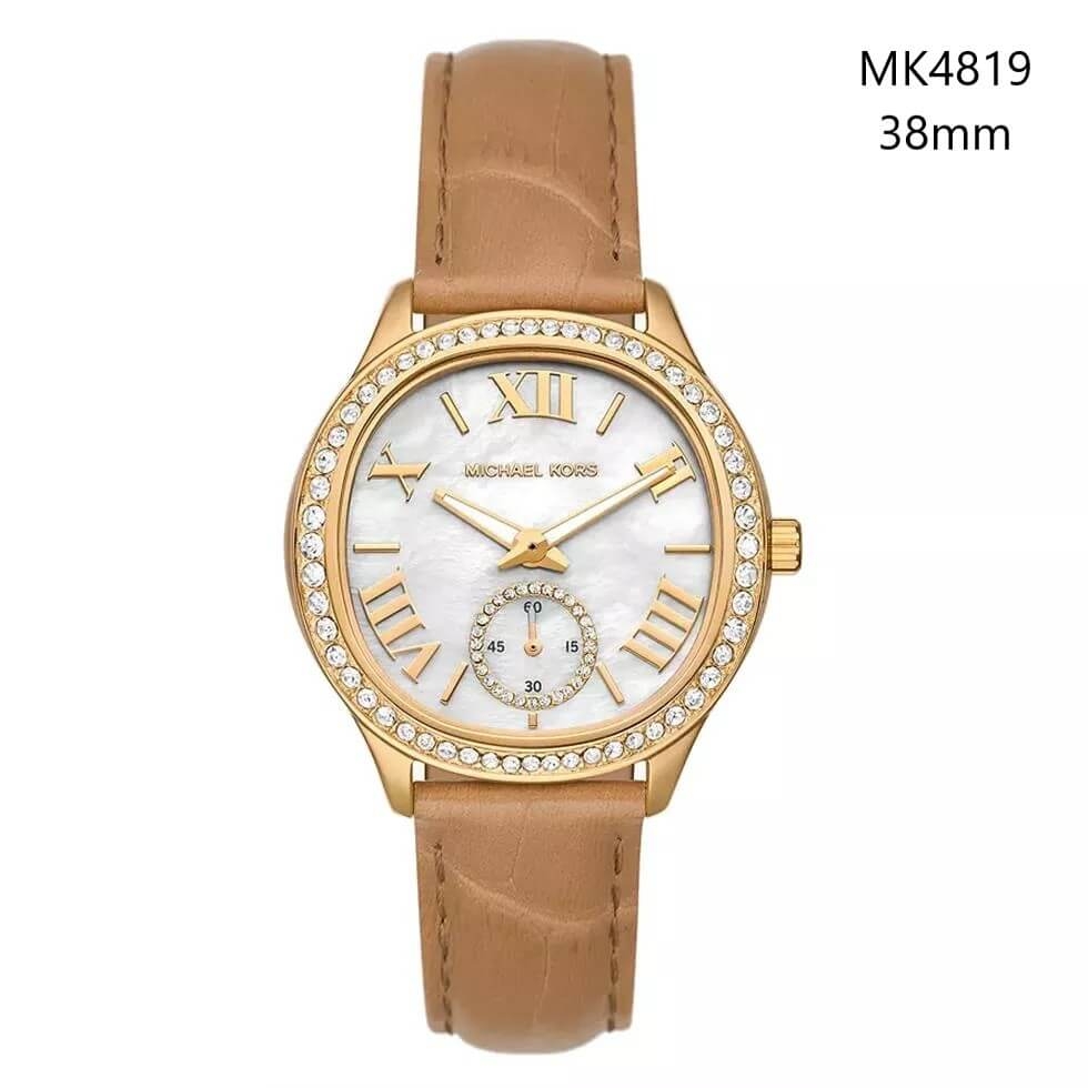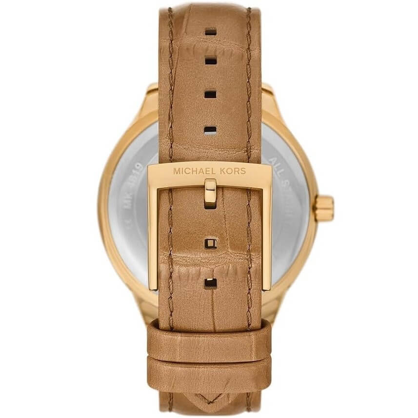Phiên bản Sage MK4819 đến từ Michael Kors mang vẻ đẹp sang trọng và ấm áp với tông vàng gold kết hợp dây da nâu thanh lịch. Thiết kế mặt khảm xà cừ ánh nhẹ cùng cọc số La Mã cổ điển tạo nên tổng thể tinh tế, nữ tính nhưng vẫn rất hiện đại.