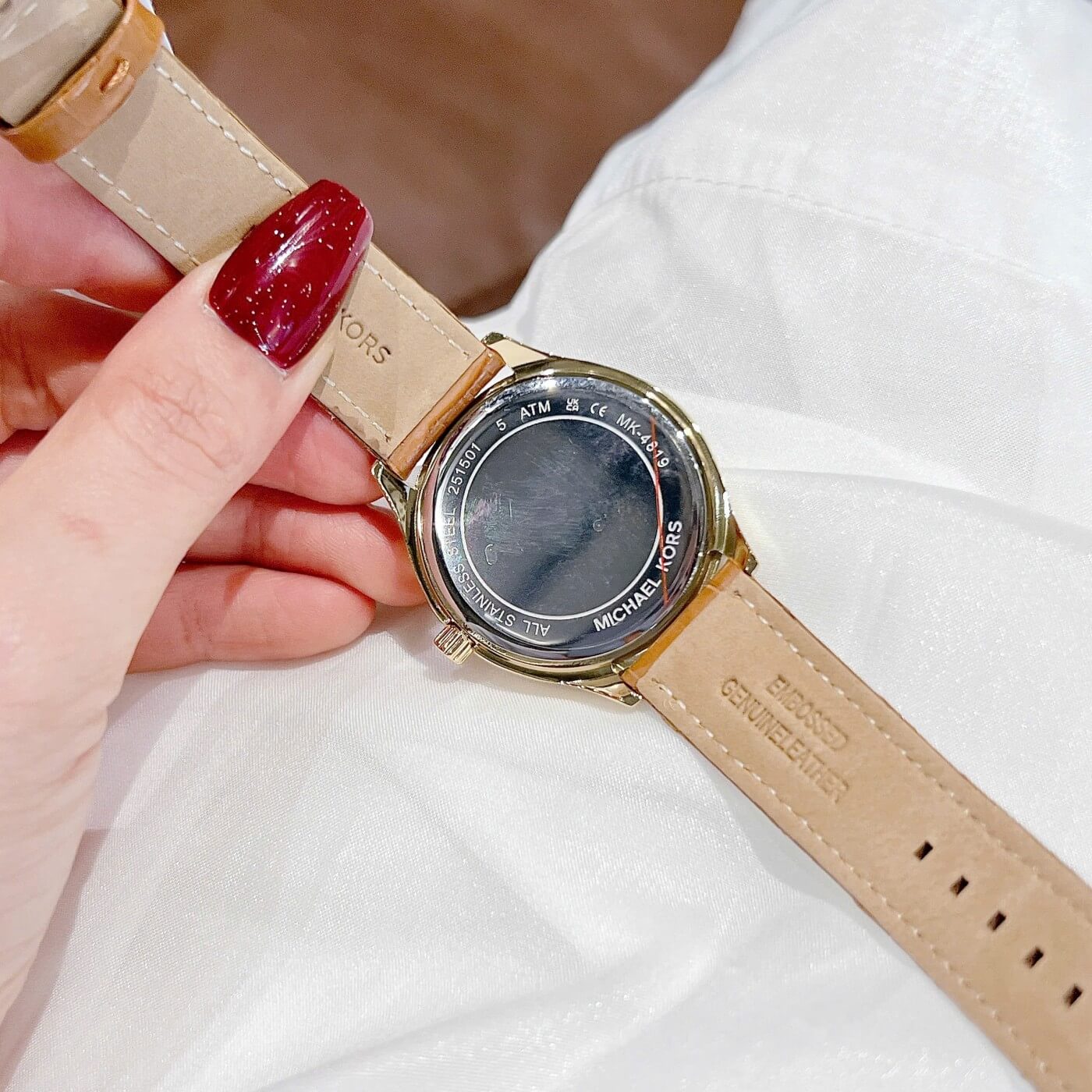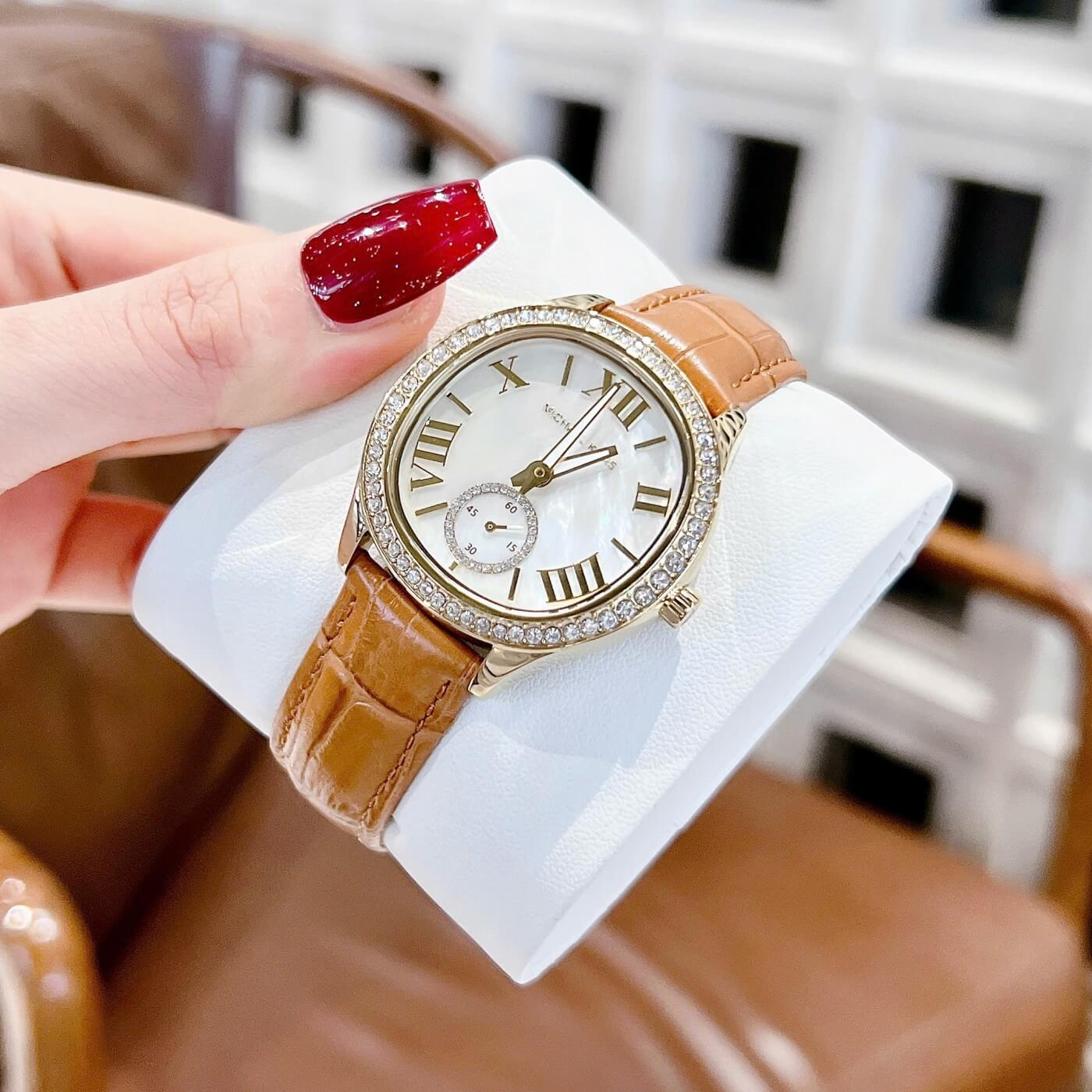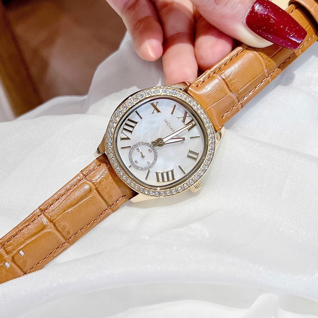 Phiên bản Sage MK4819 đến từ Michael Kors mang vẻ đẹp sang trọng và ấm áp với tông vàng gold kết hợp dây da nâu thanh lịch. Thiết kế mặt khảm xà cừ ánh nhẹ cùng cọc số La Mã cổ điển tạo nên tổng thể tinh tế, nữ tính nhưng vẫn rất hiện đại.