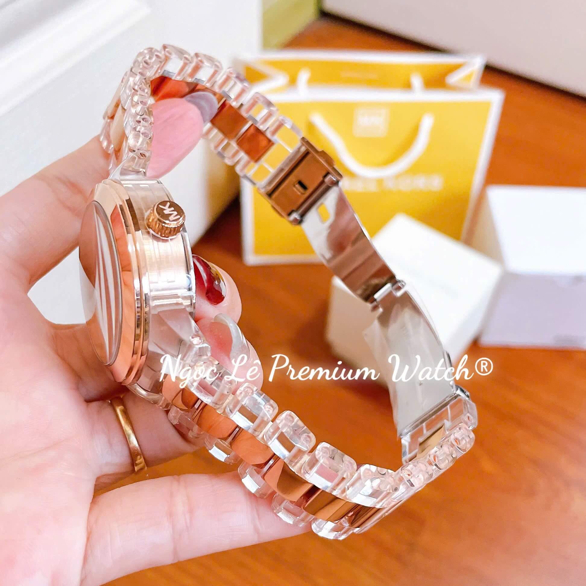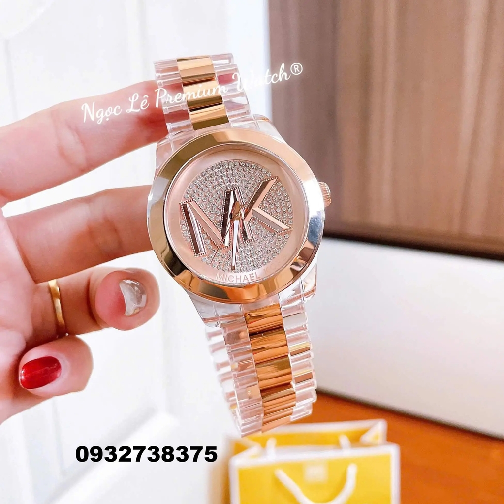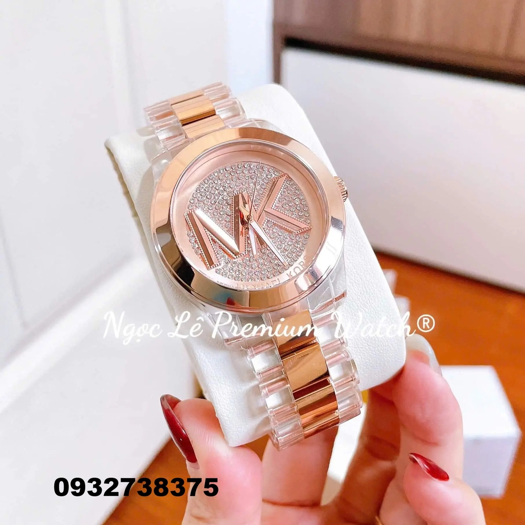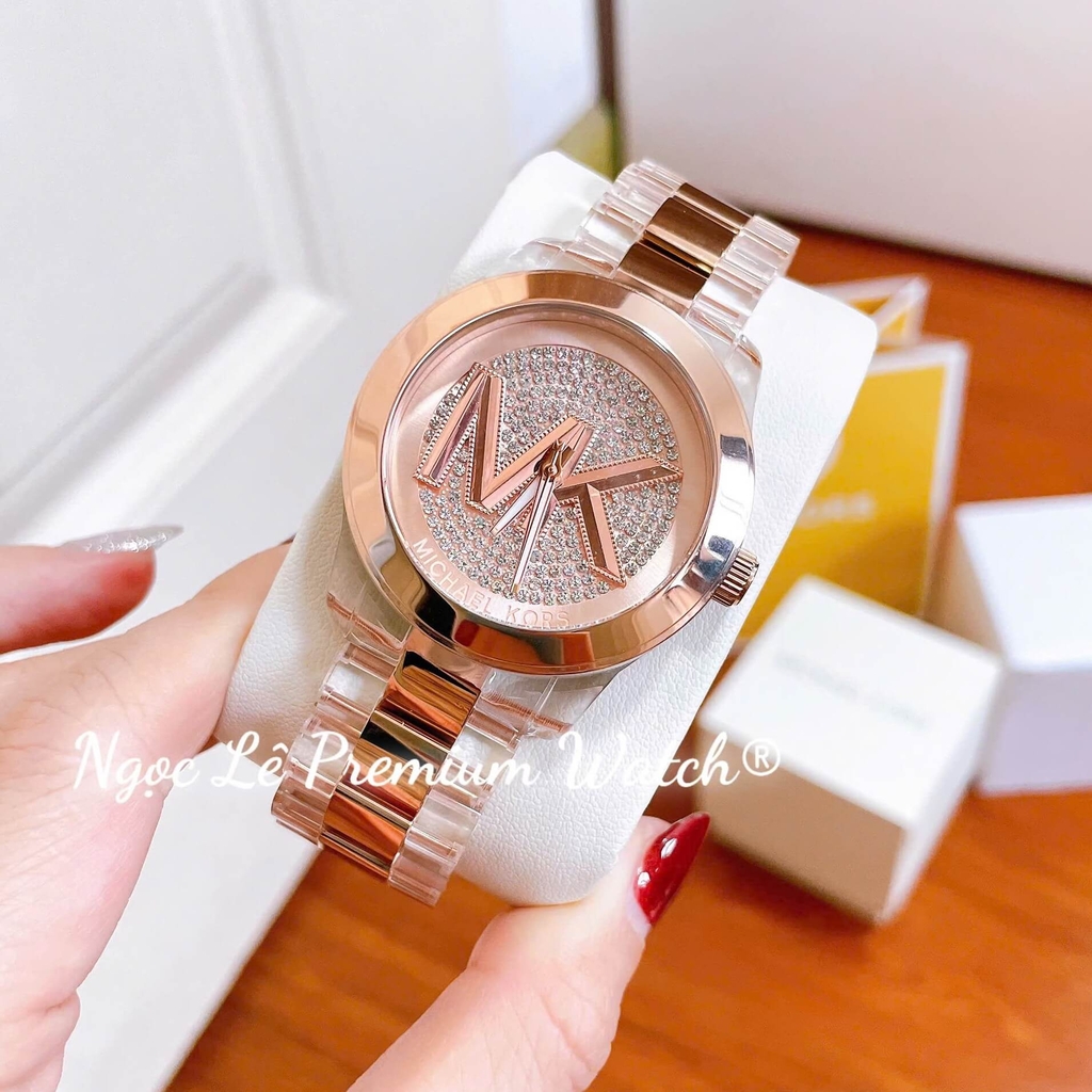• Tông vàng hồng sang chảnh, mặt đồng hồ đính đá chữ MK nổi bật ở trung tâm